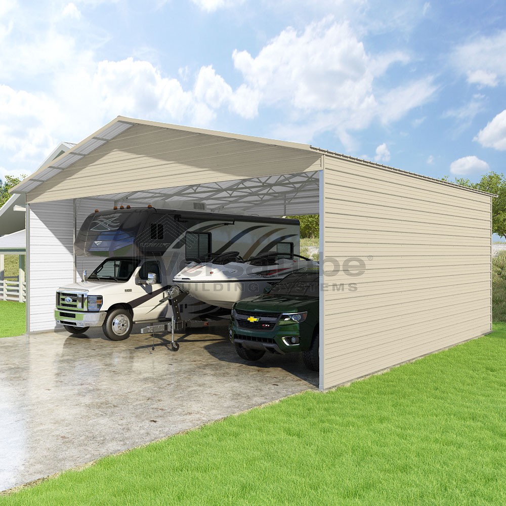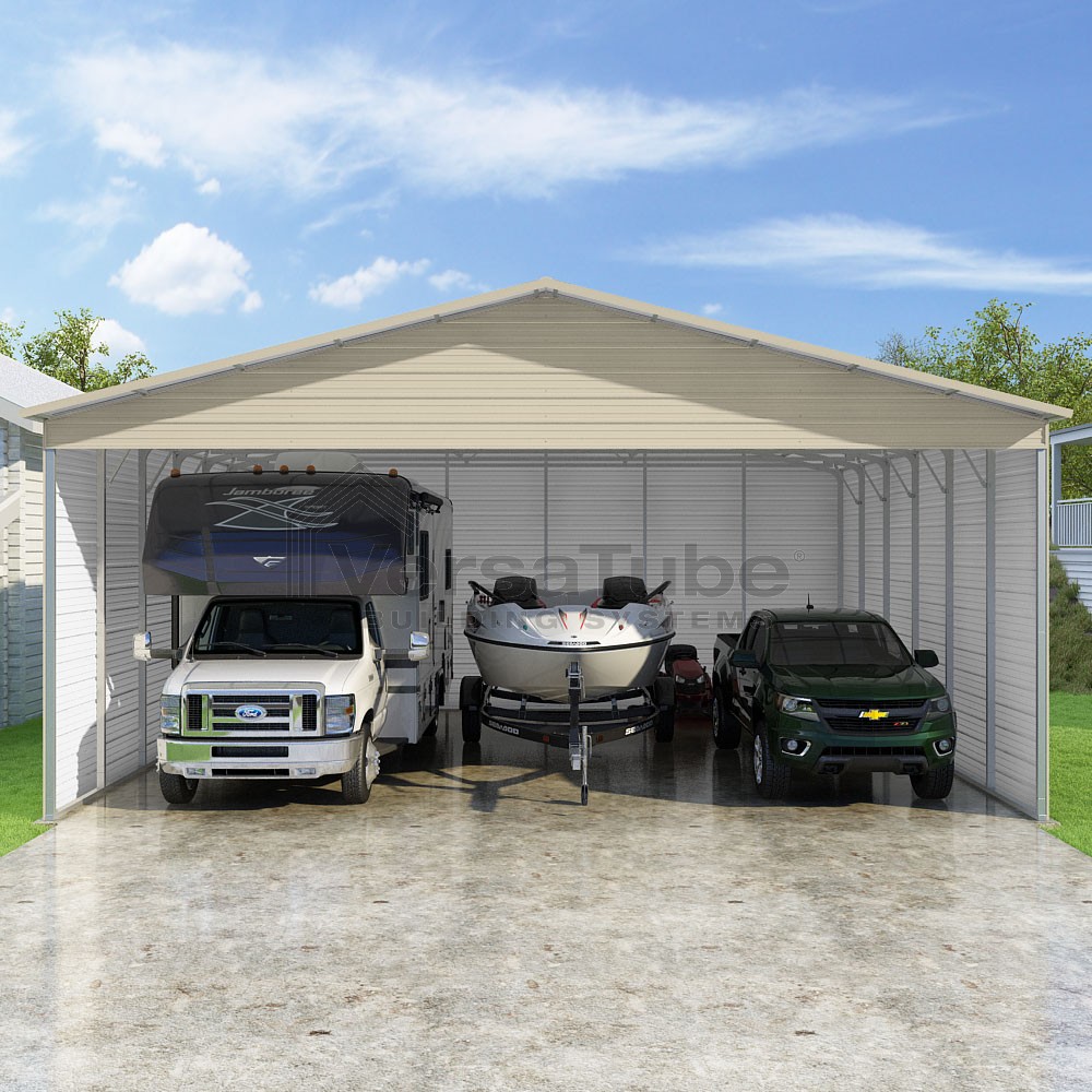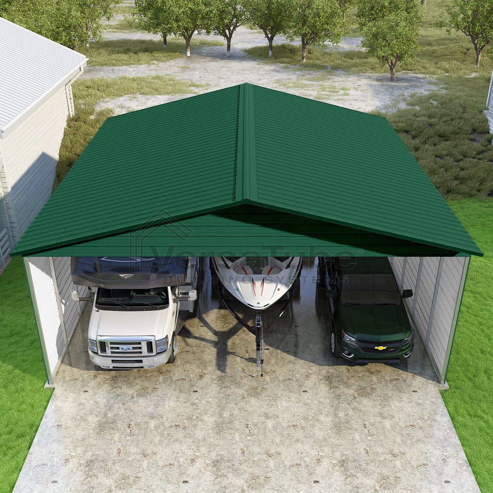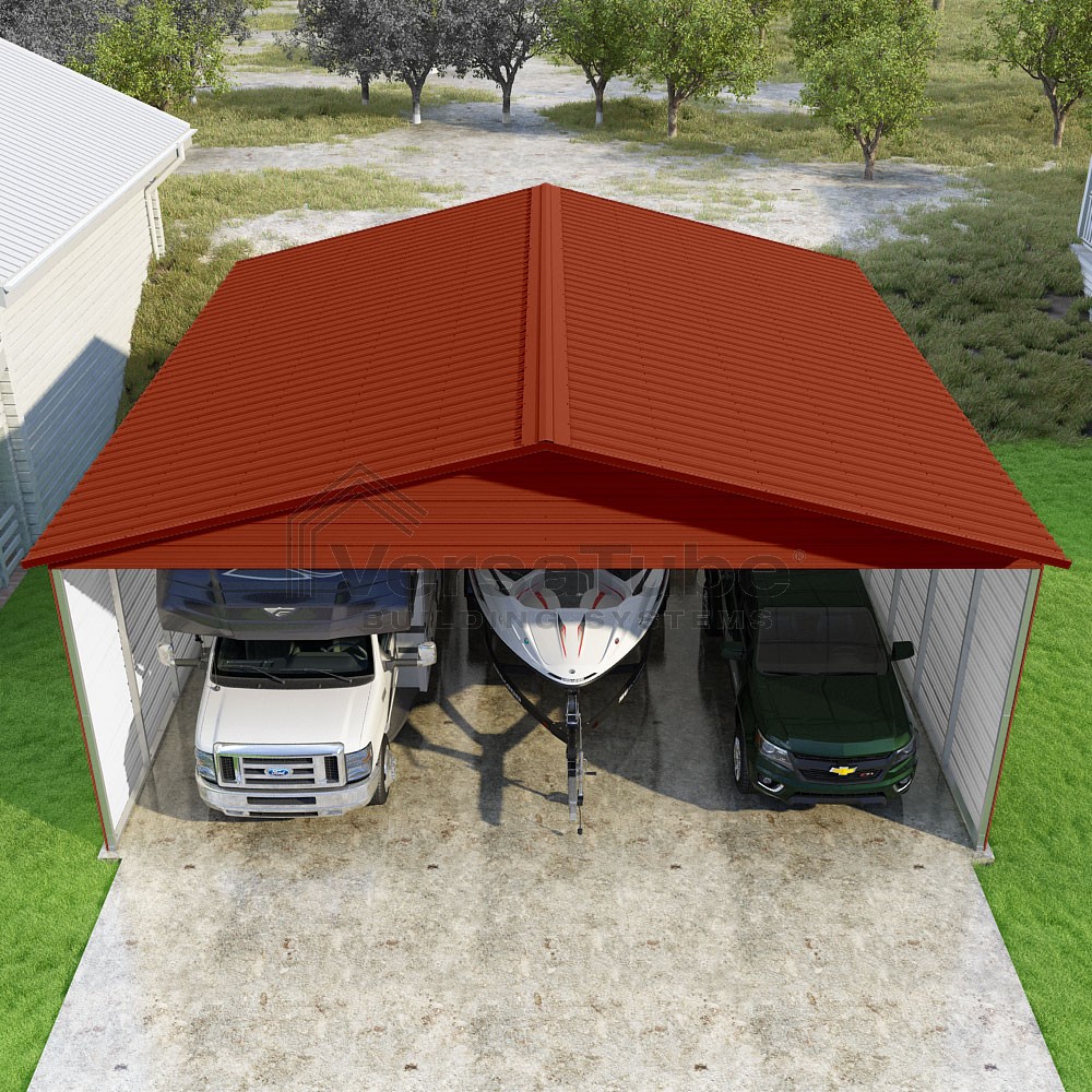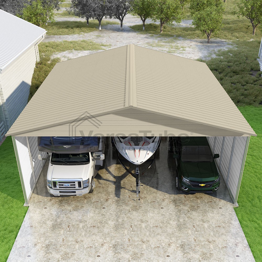 Pinnacle Series DIY carport kit features vertical sheet metal roof panels with ridge cap, gable and eave trim for an A-frame roof style and extended coverage on both ends.