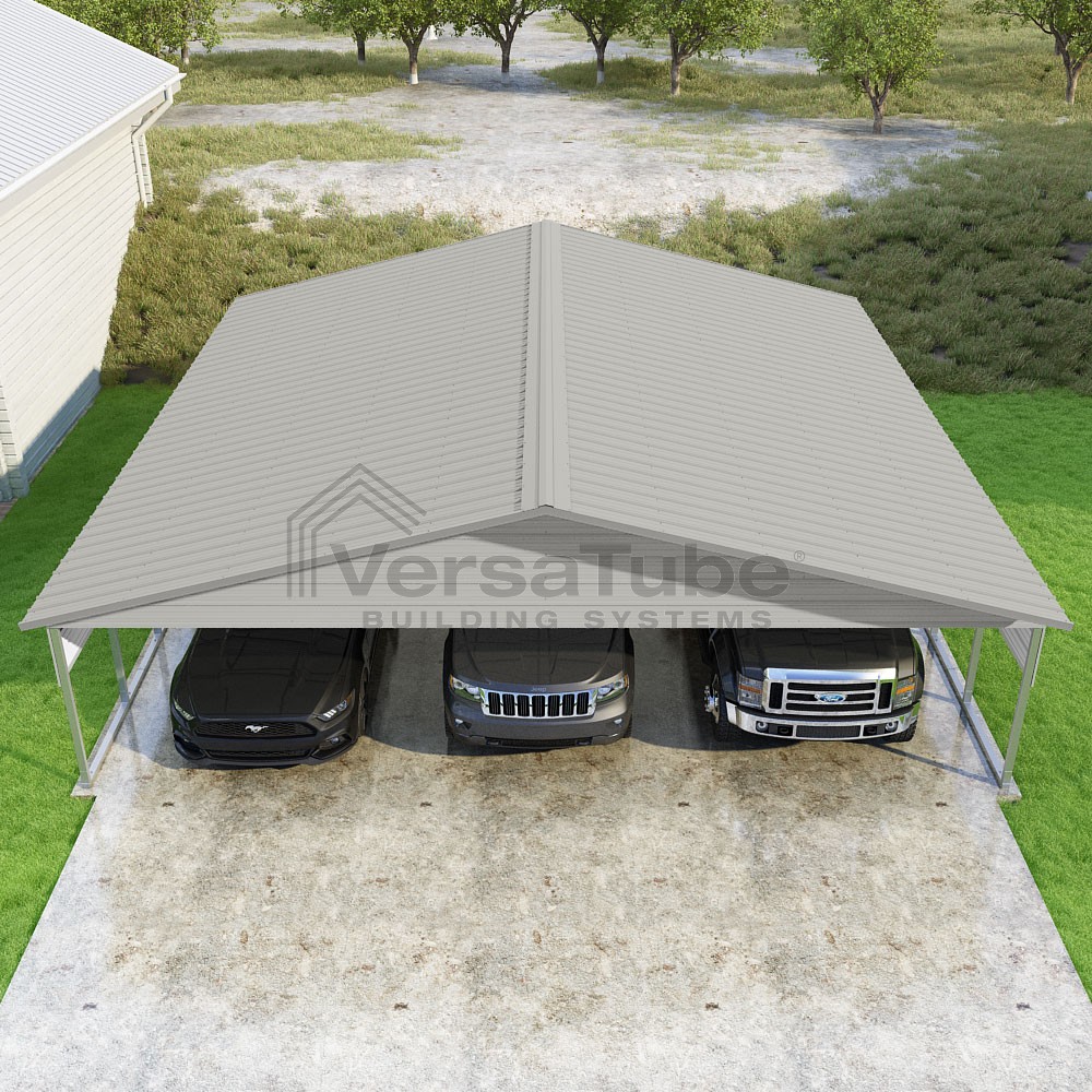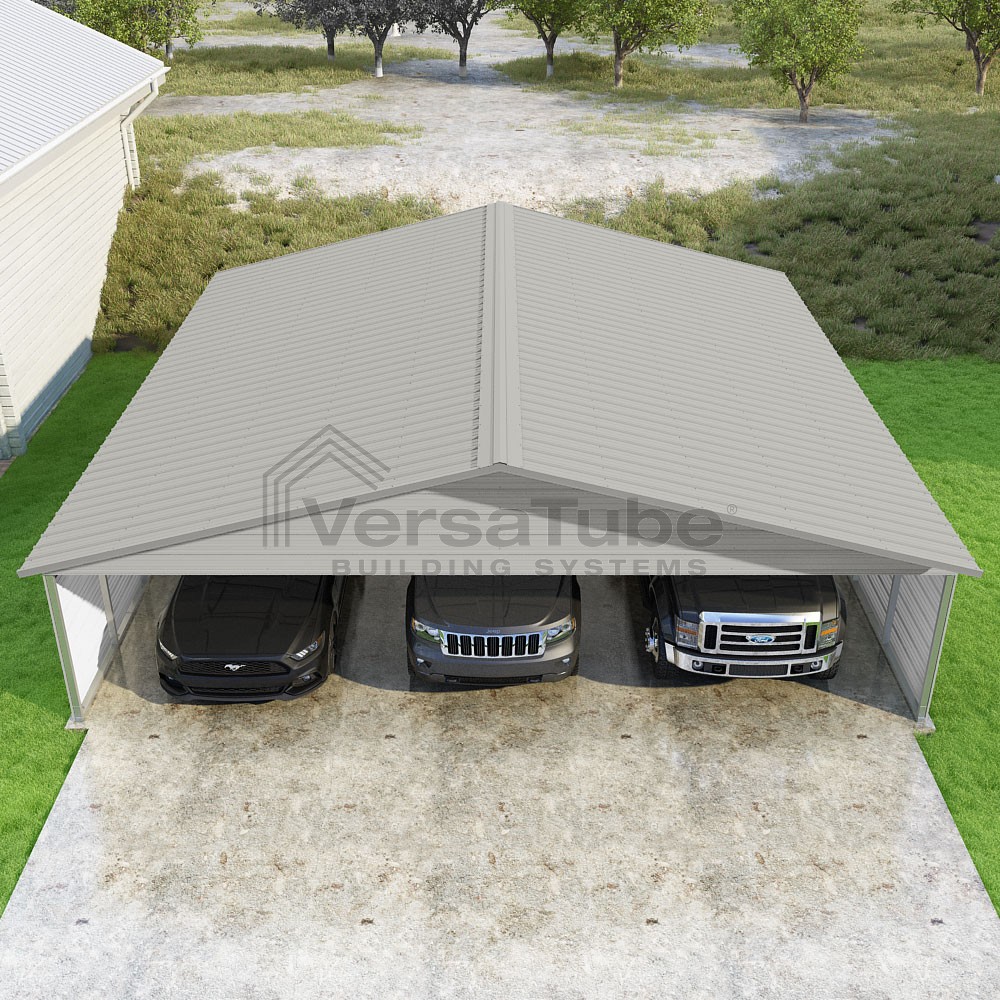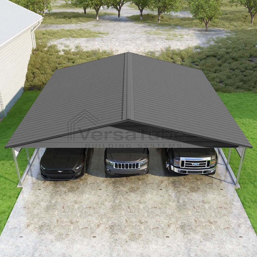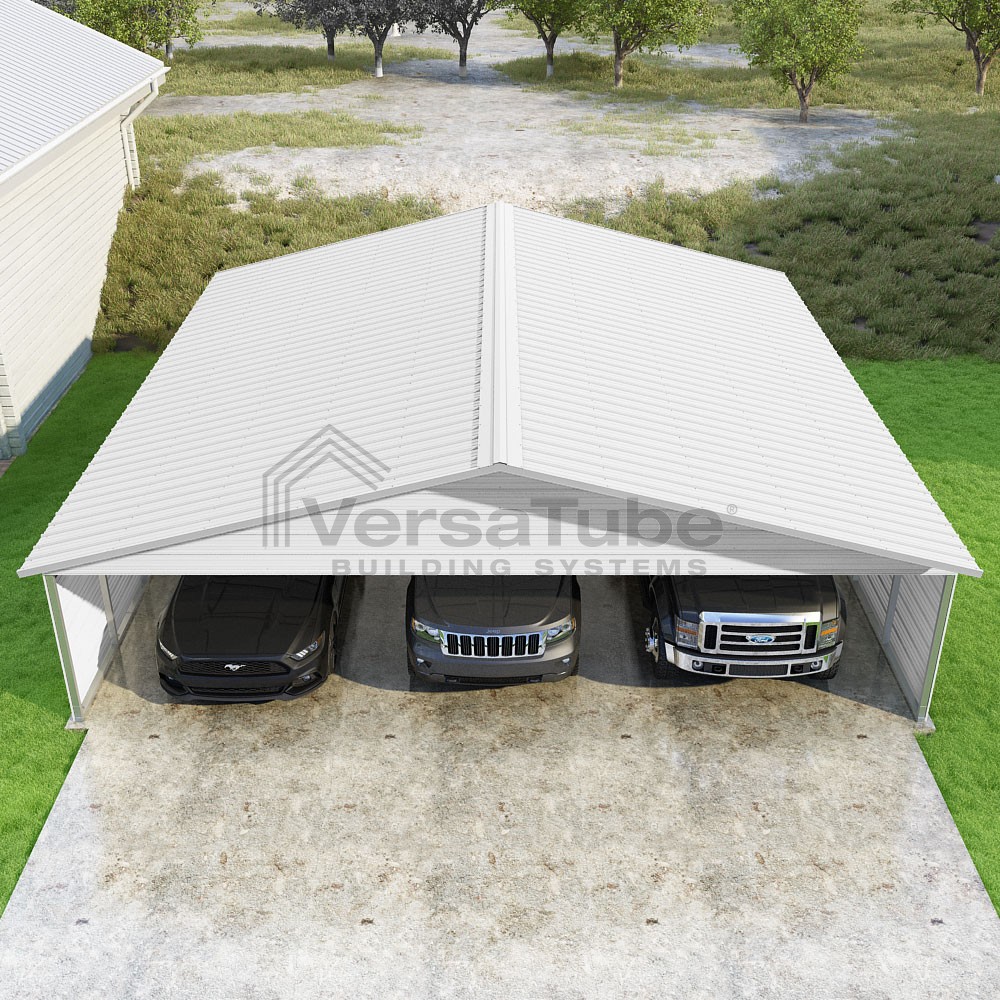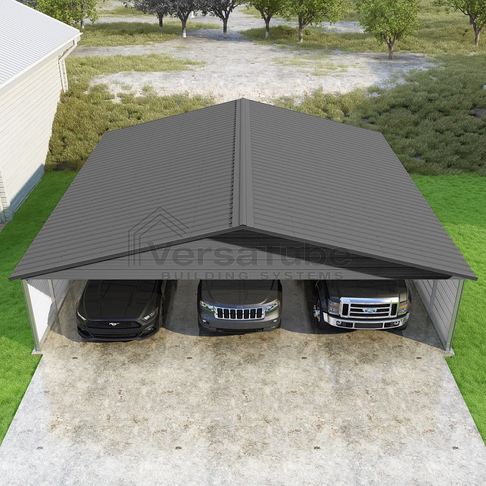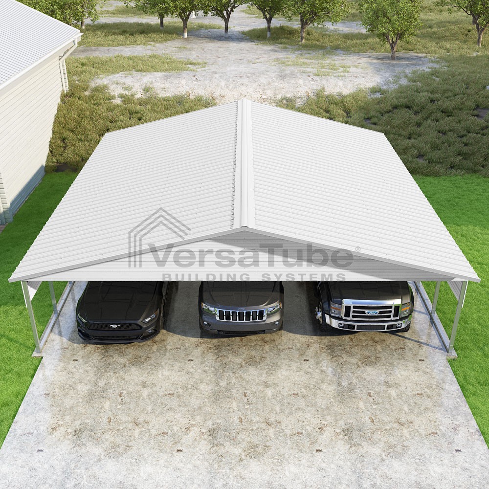 Pinnacle Series DIY carport kit features vertical sheet metal roof panels with ridge cap, gable and eave trim for an A-frame roof style and extended coverage on both ends.