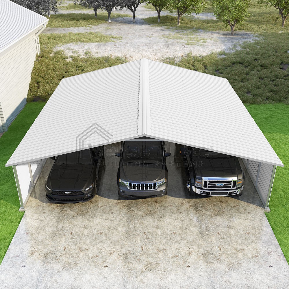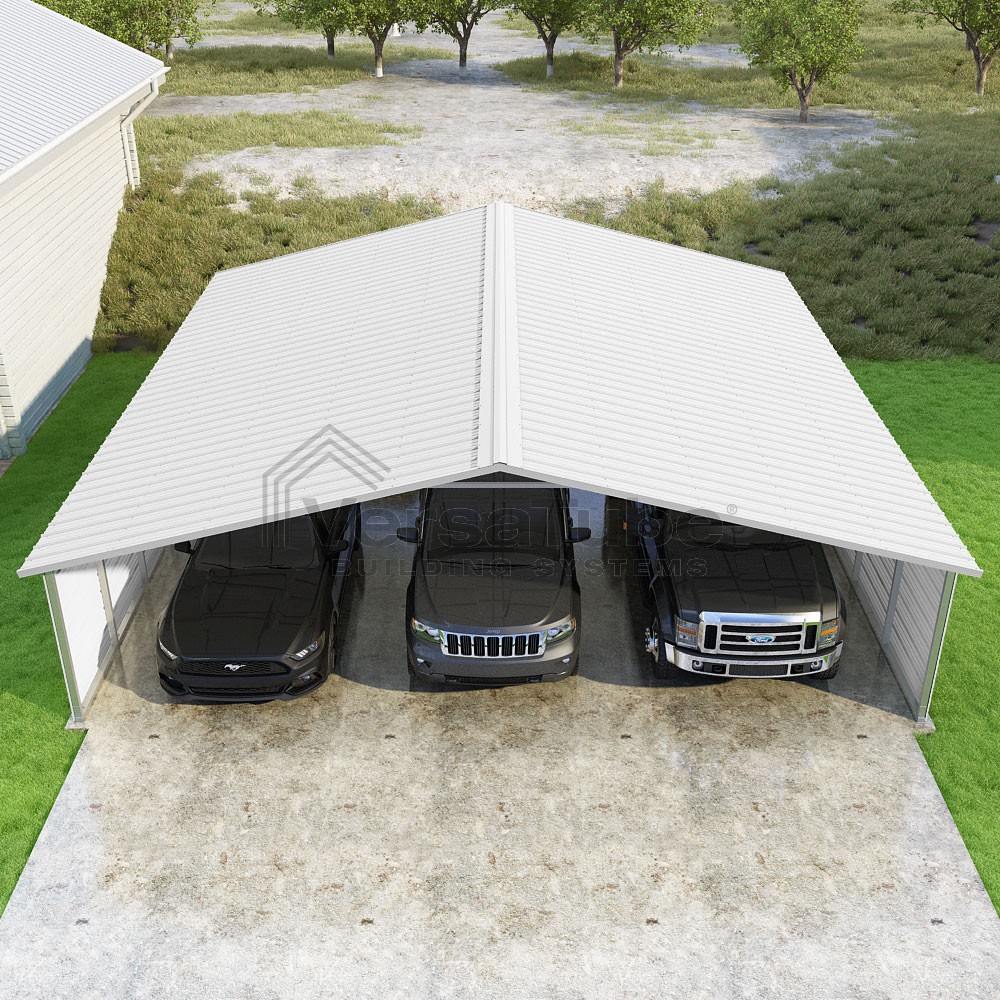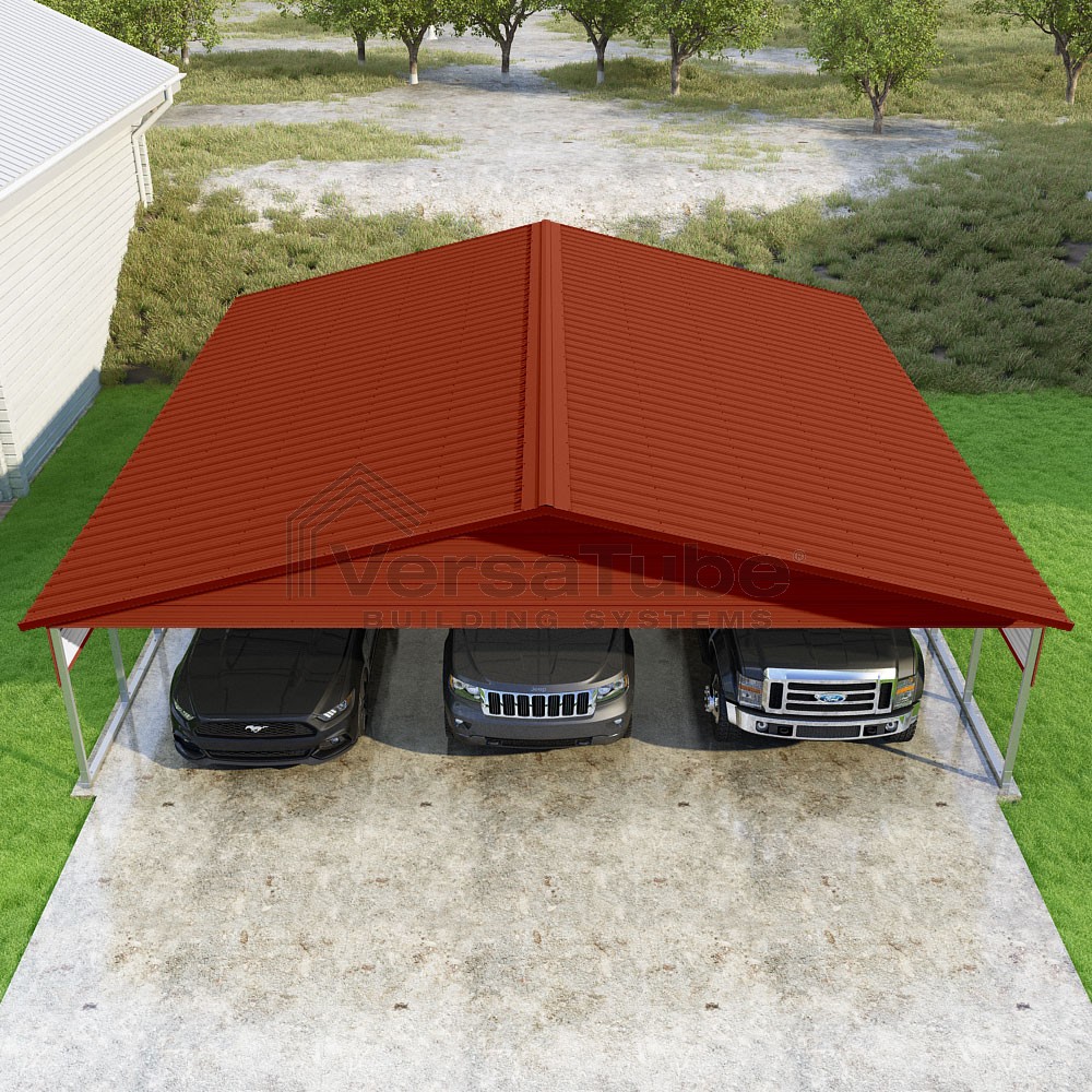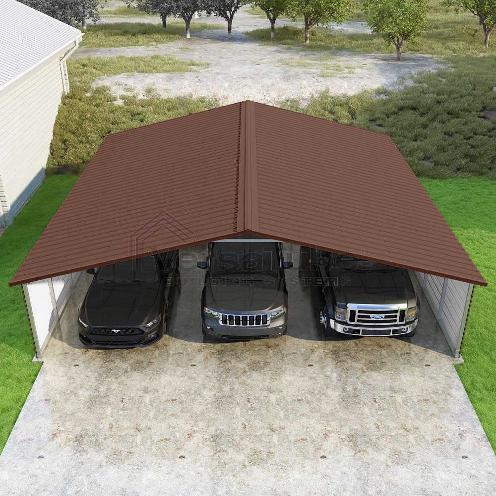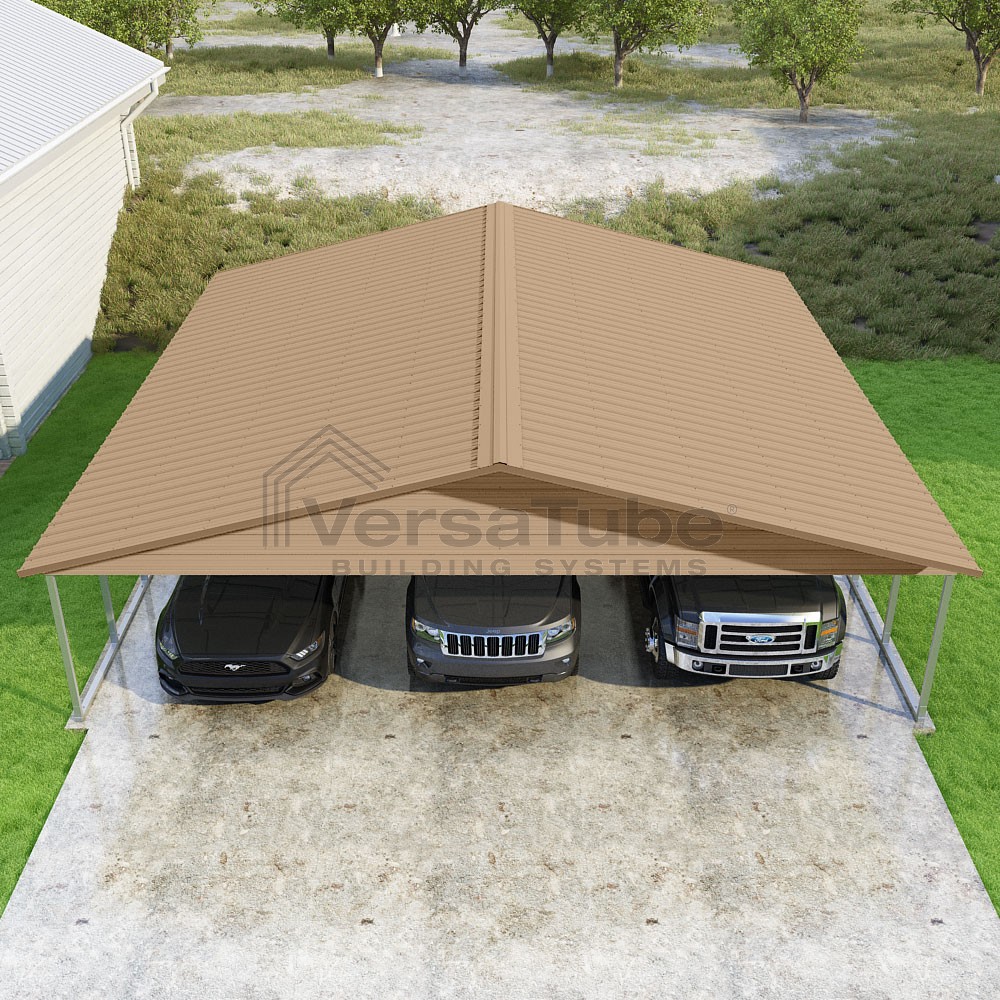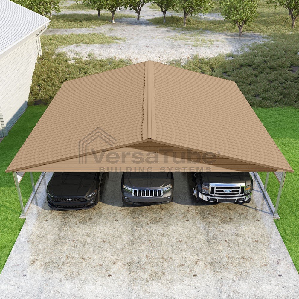 Pinnacle Series DIY carport kit features vertical sheet metal roof panels with ridge cap, gable and eave trim for an A-frame roof style and extended coverage on both ends.