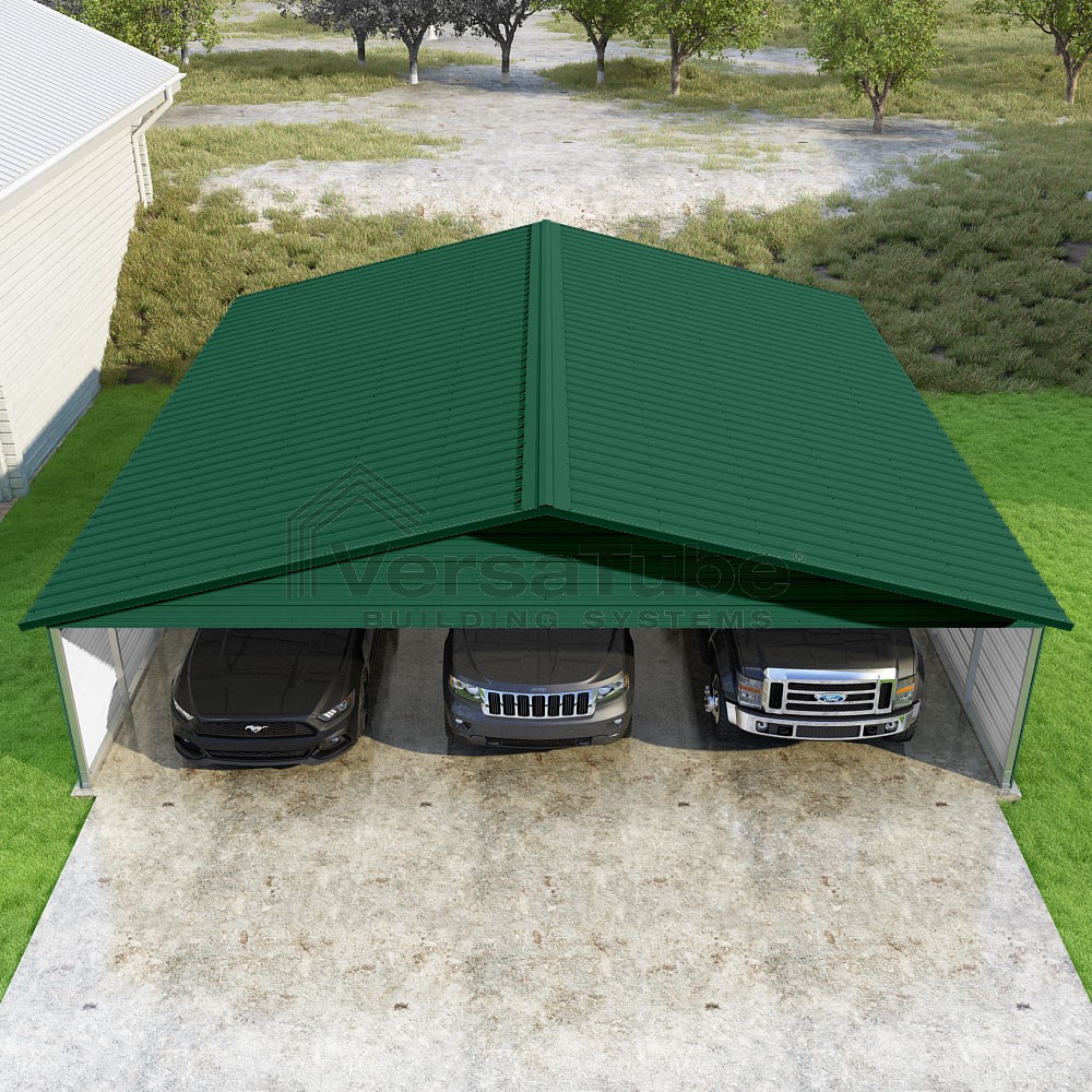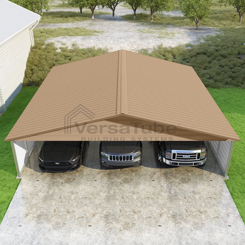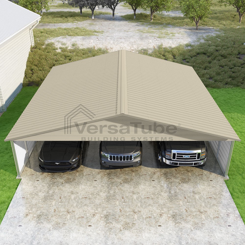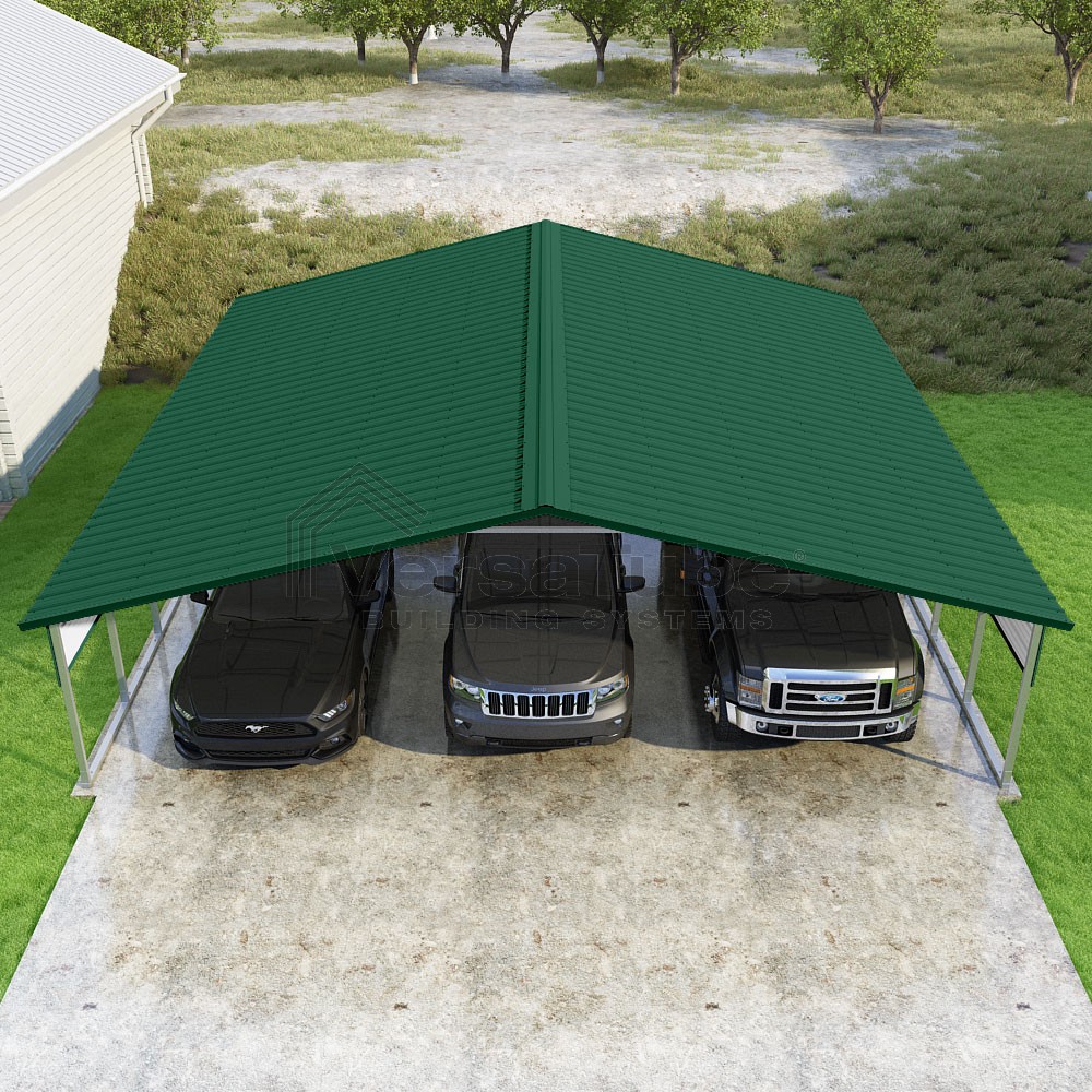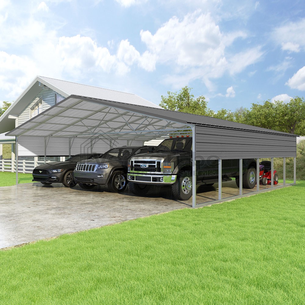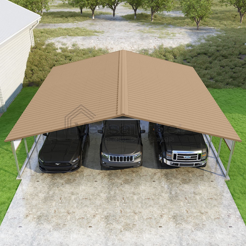 Pinnacle Series DIY carport kit features vertical sheet metal roof panels with ridge cap, gable and eave trim for an A-frame roof style and extended coverage on both ends.