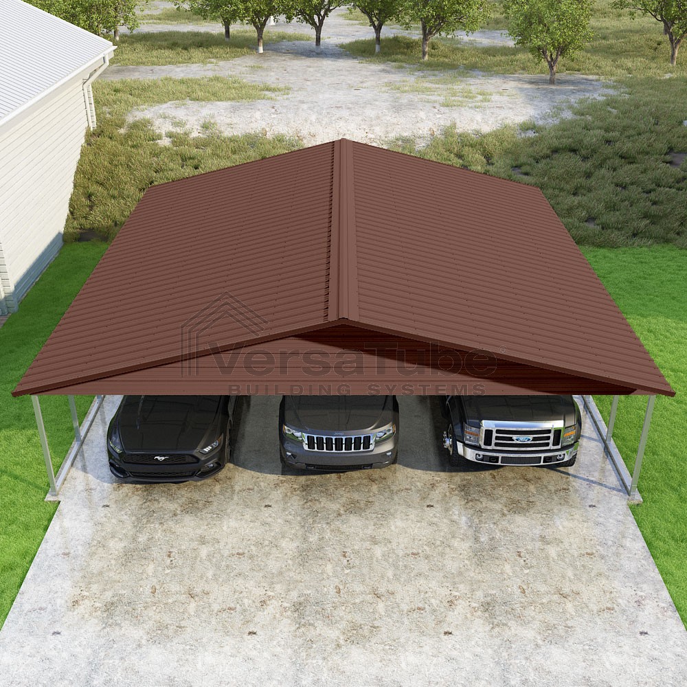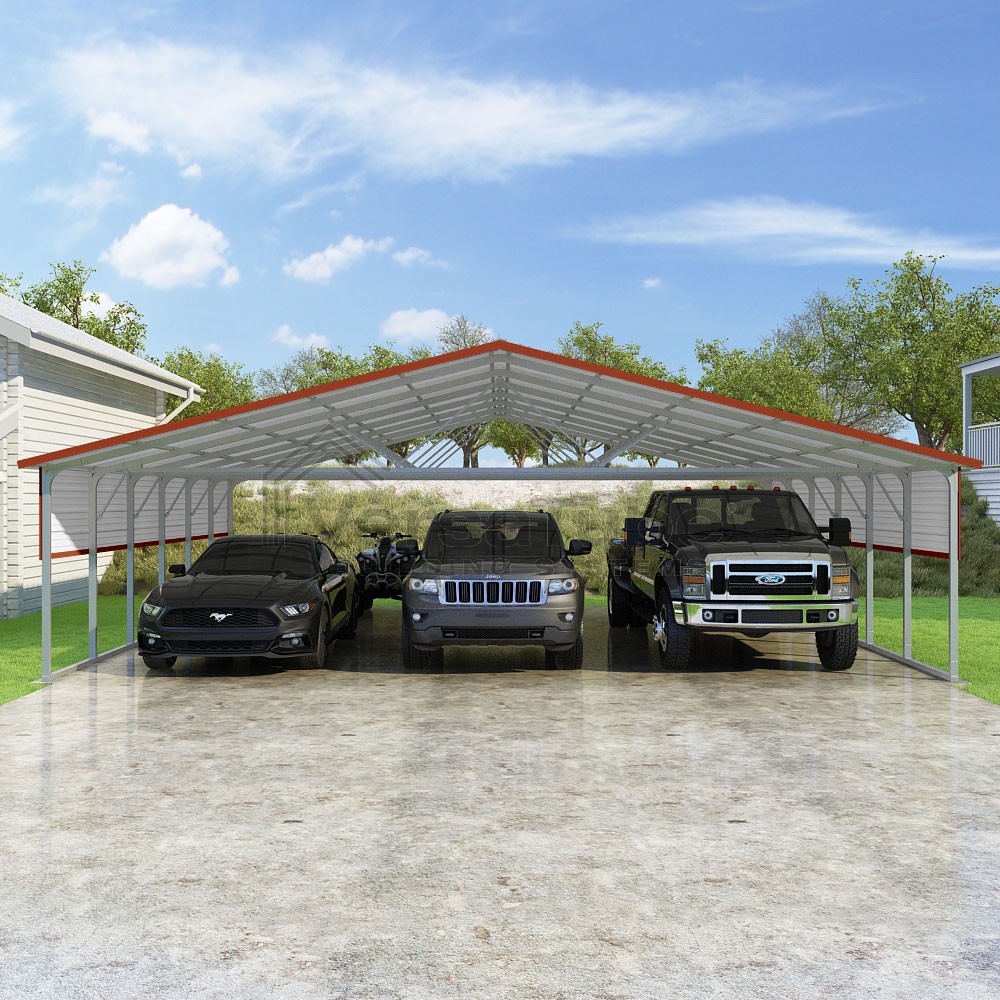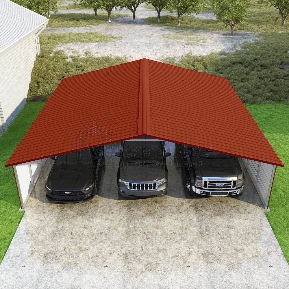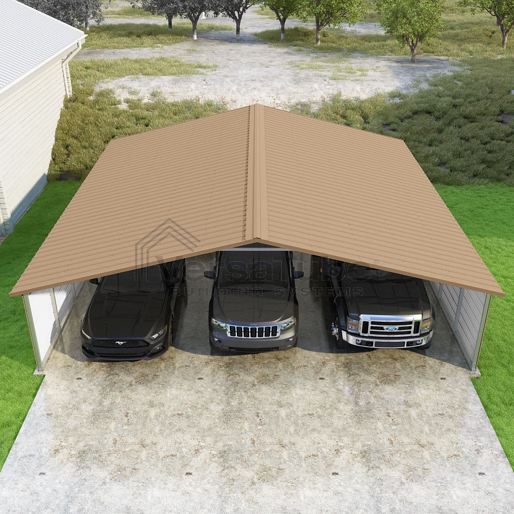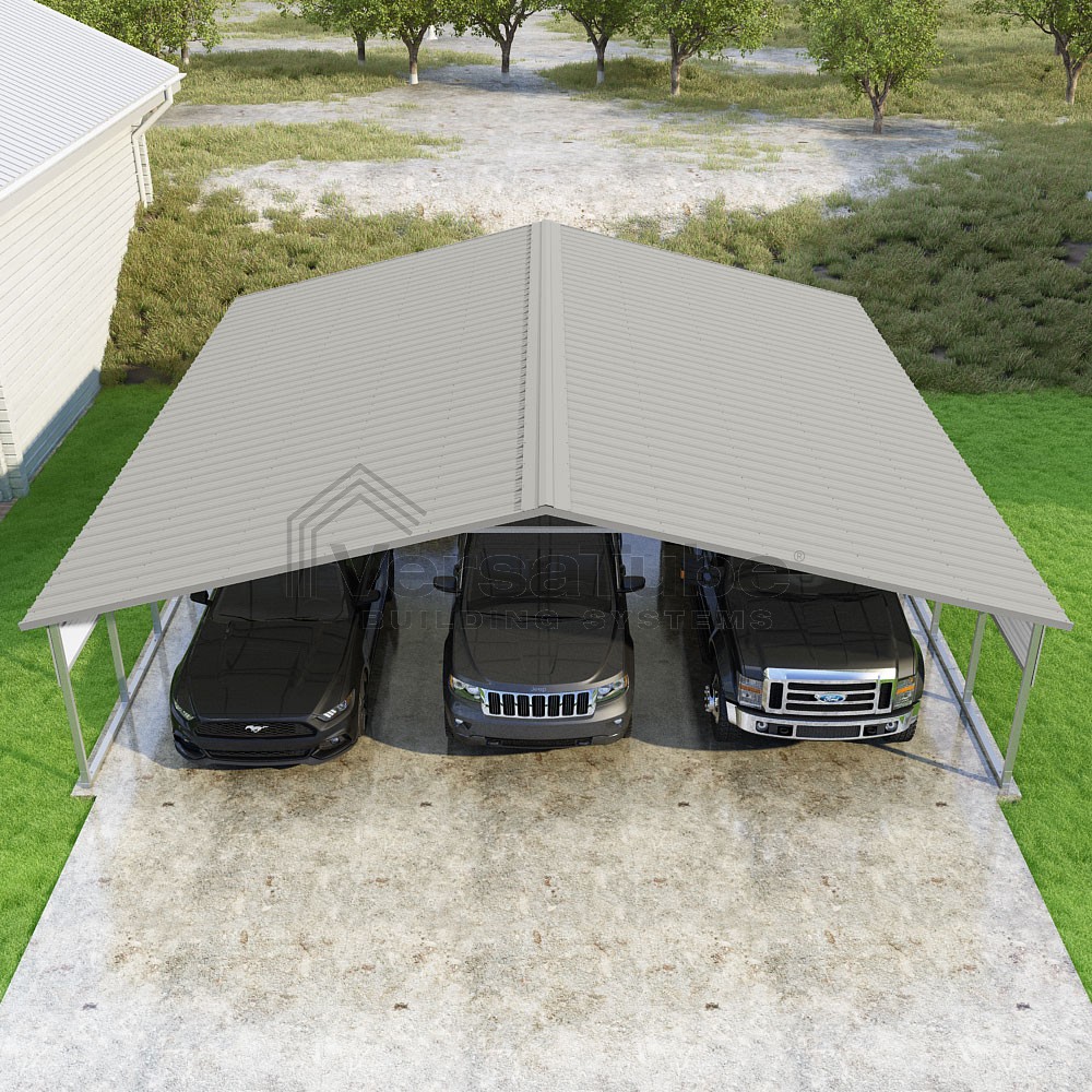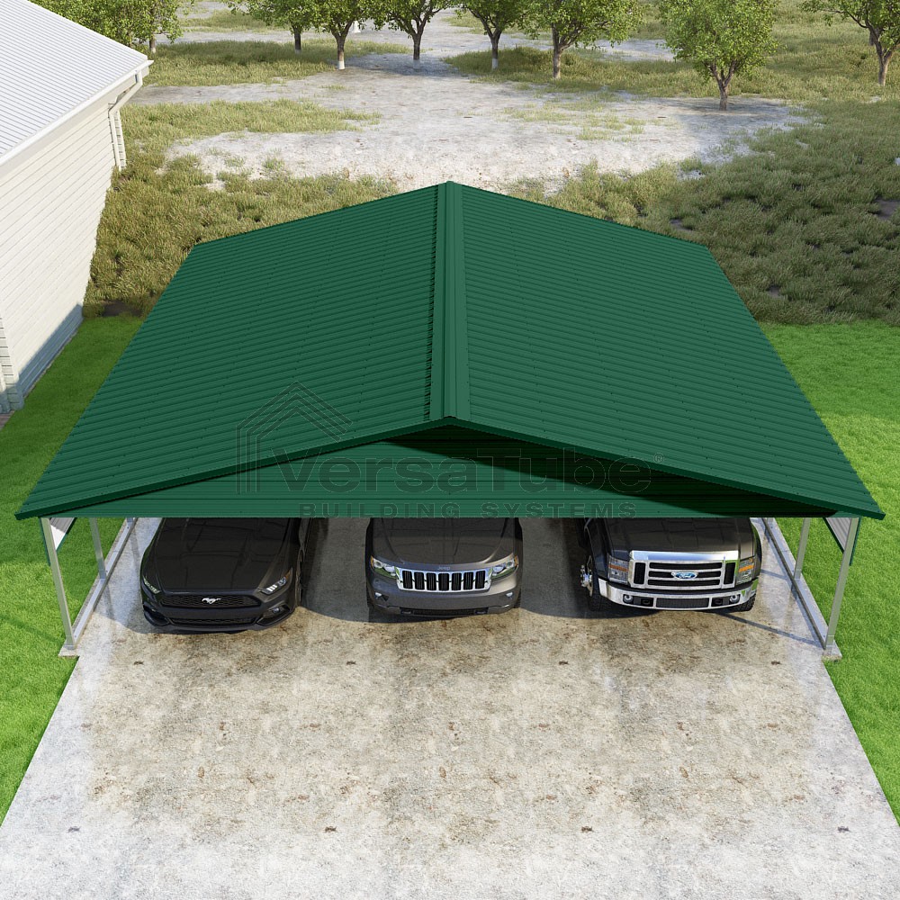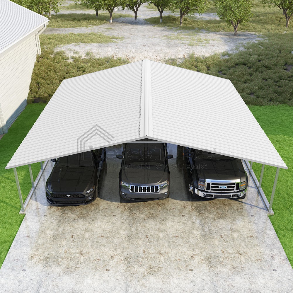 Pinnacle Series DIY carport kit features vertical sheet metal roof panels with ridge cap, gable and eave trim for an A-frame roof style and extended coverage on both ends.