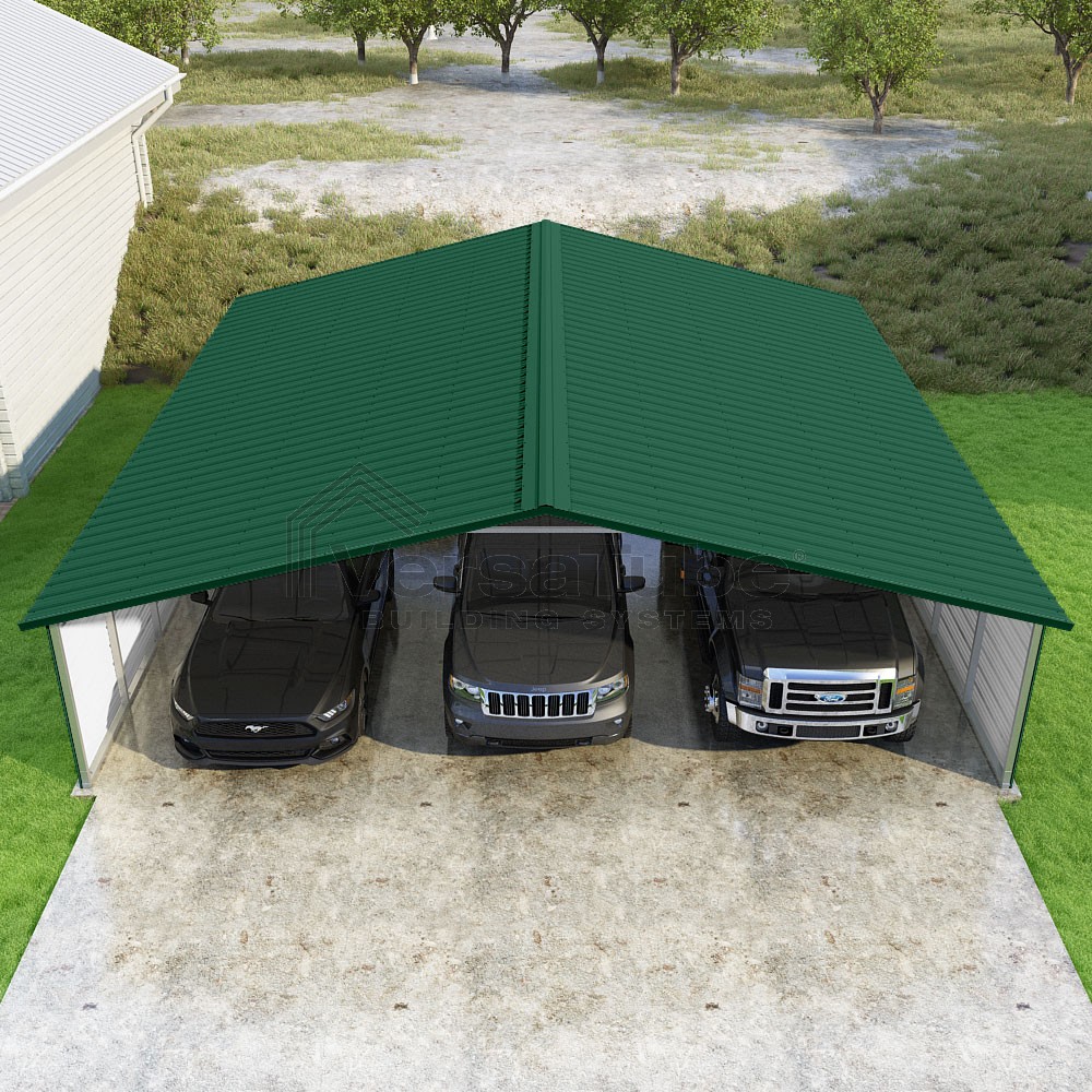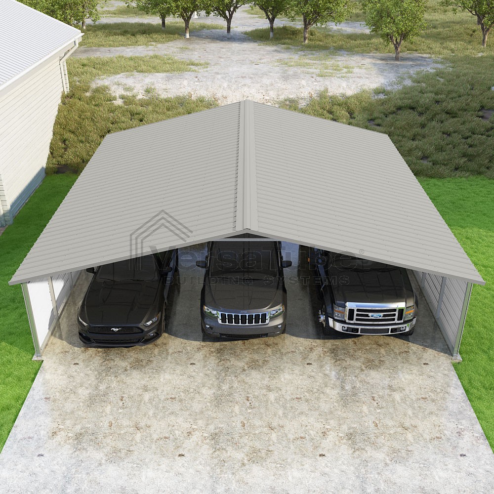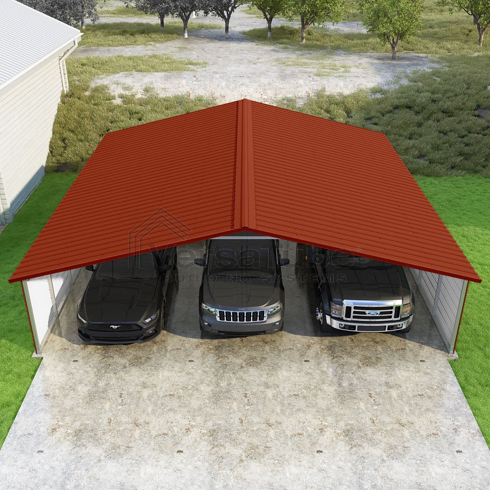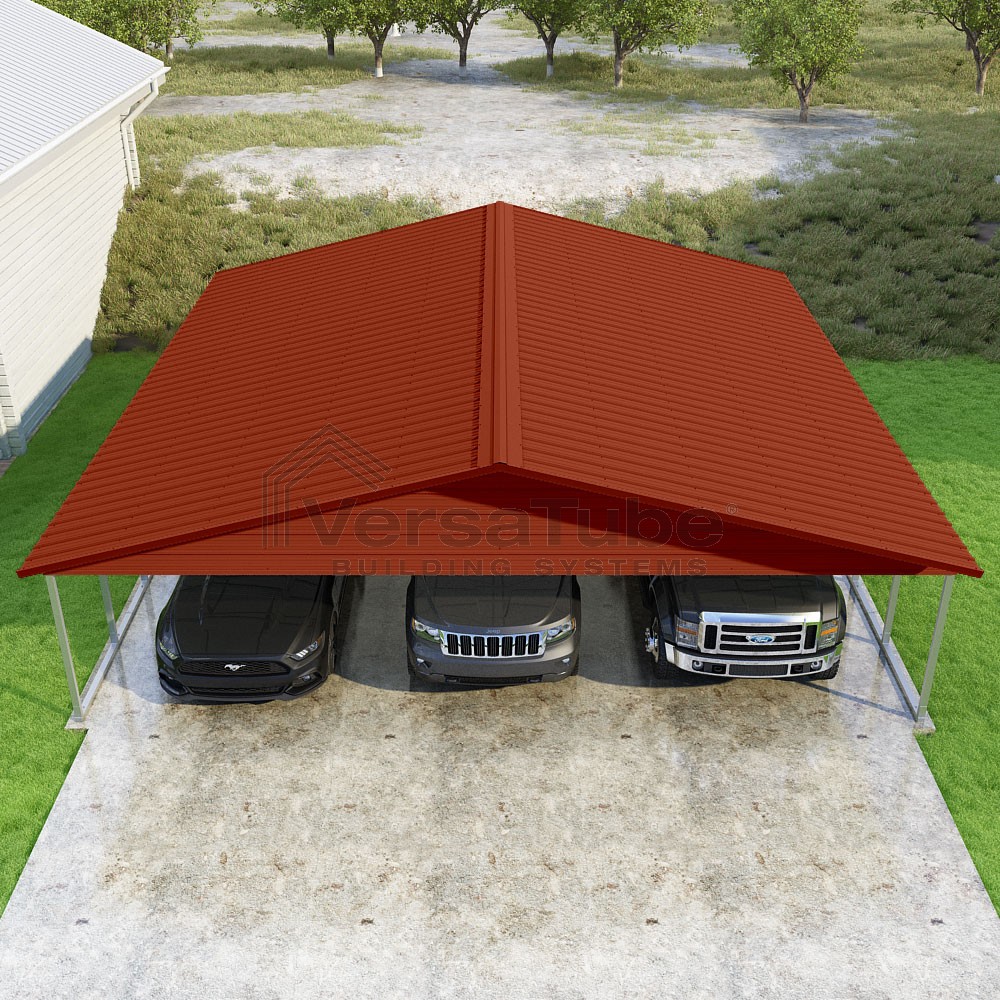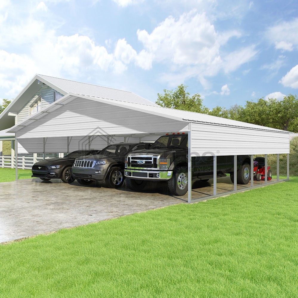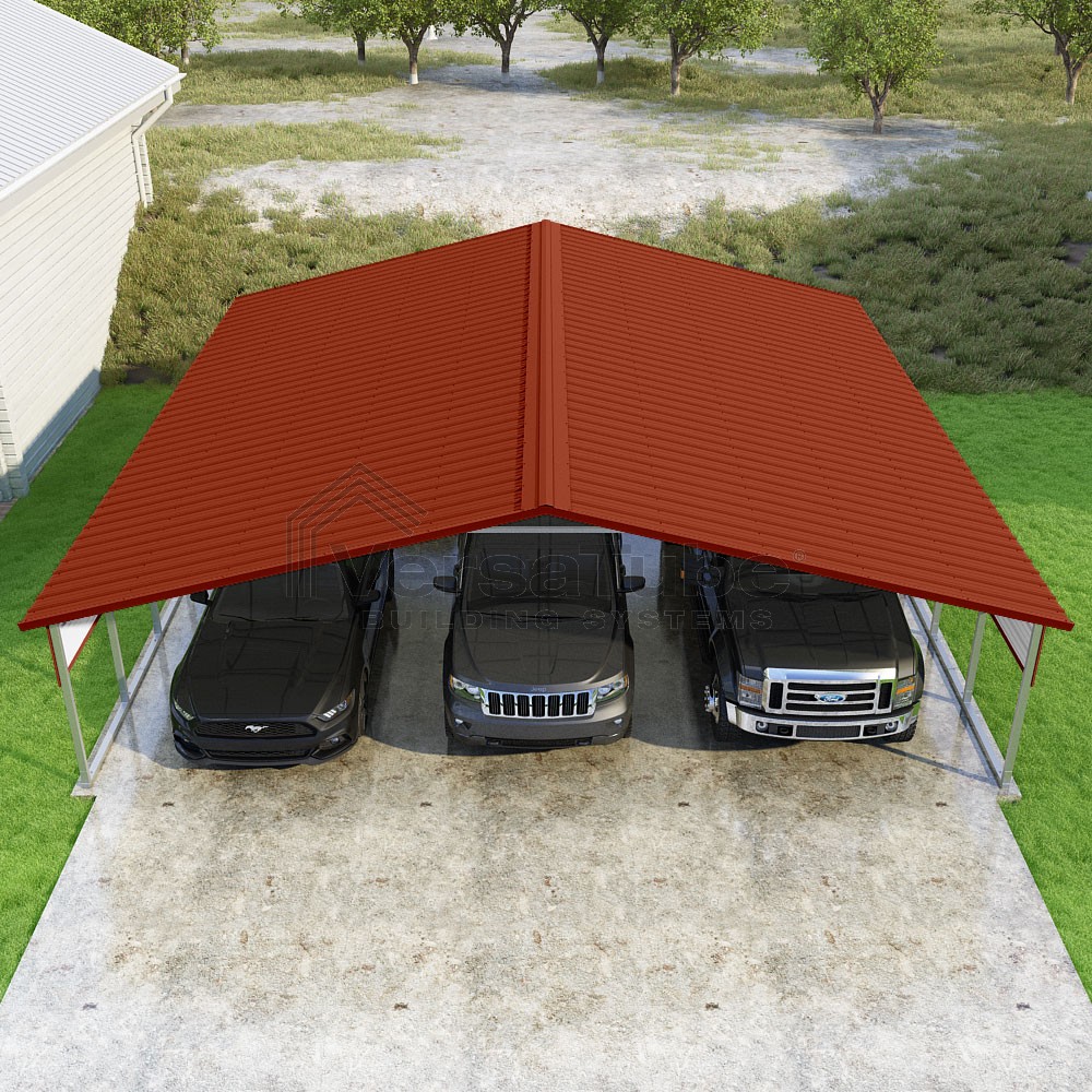 Pinnacle Series DIY carport kit features vertical sheet metal roof panels with ridge cap, gable and eave trim for an A-frame roof style and extended coverage on both ends.
