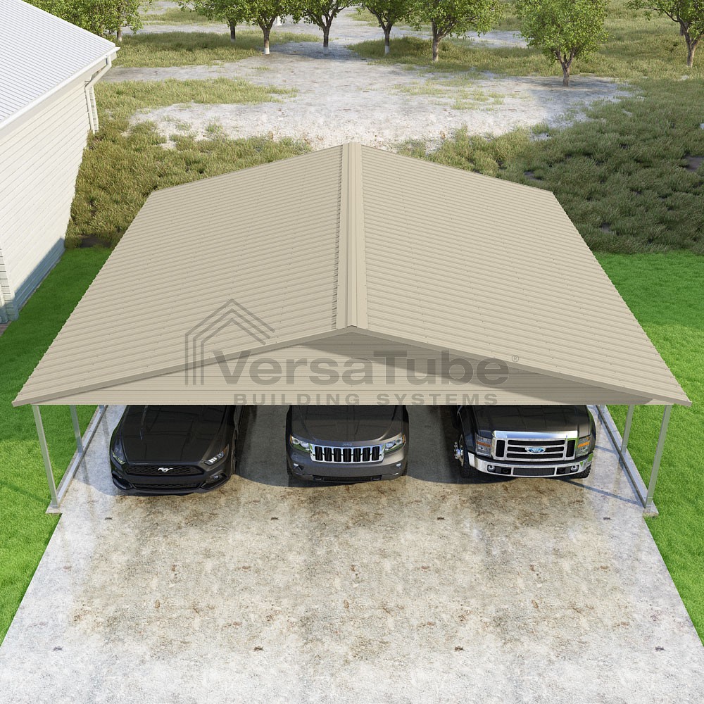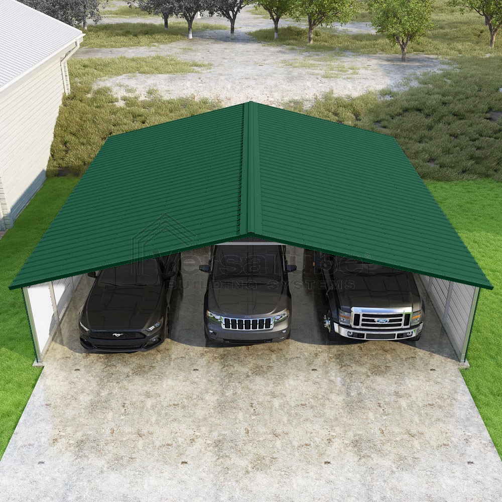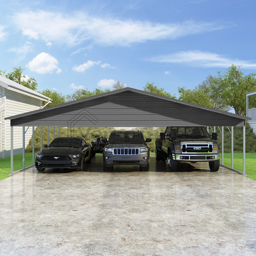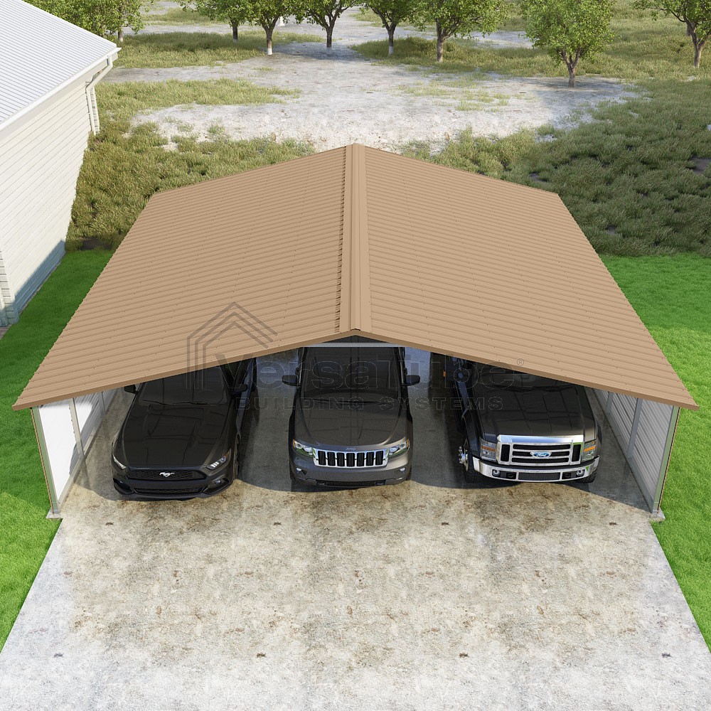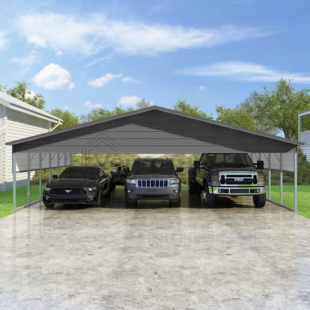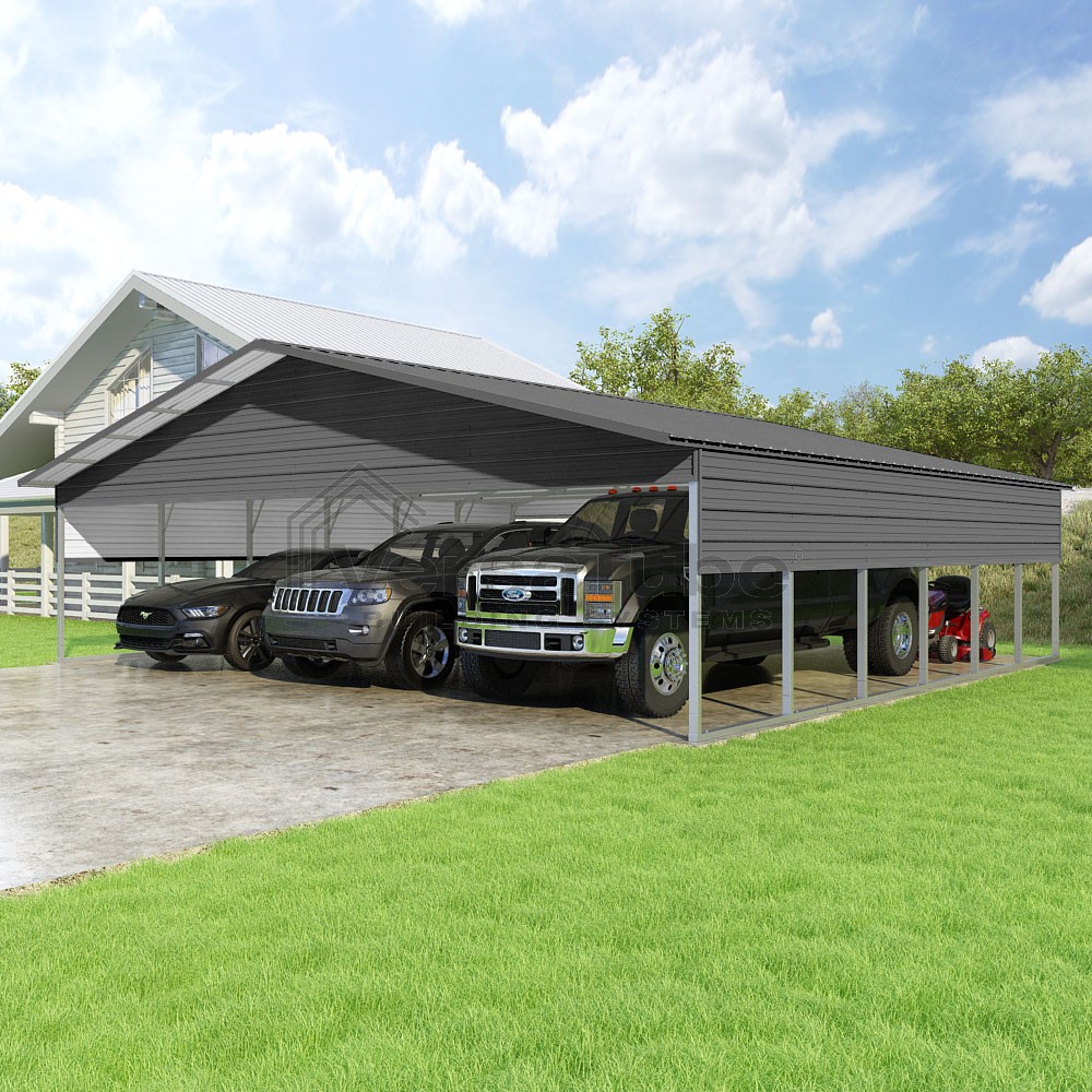 Pinnacle Series DIY carport kit features vertical sheet metal roof panels with ridge cap, gable and eave trim for an A-frame roof style and extended coverage on both ends.