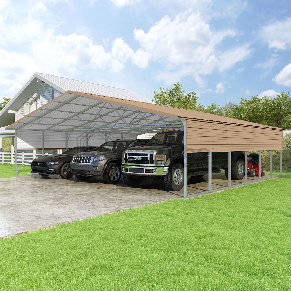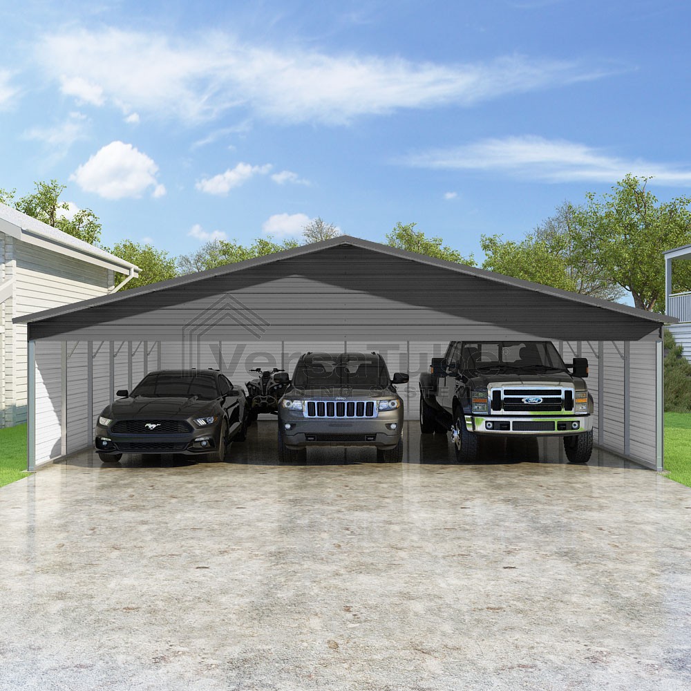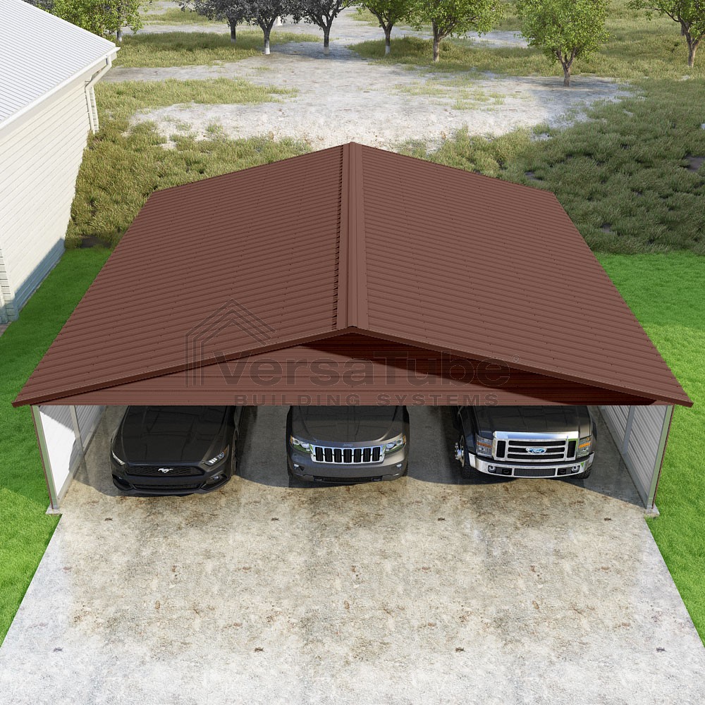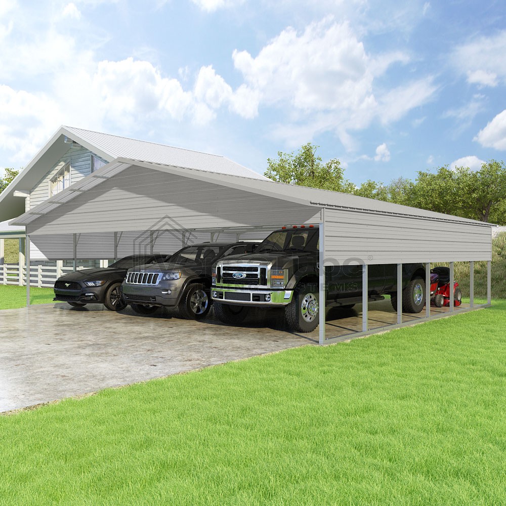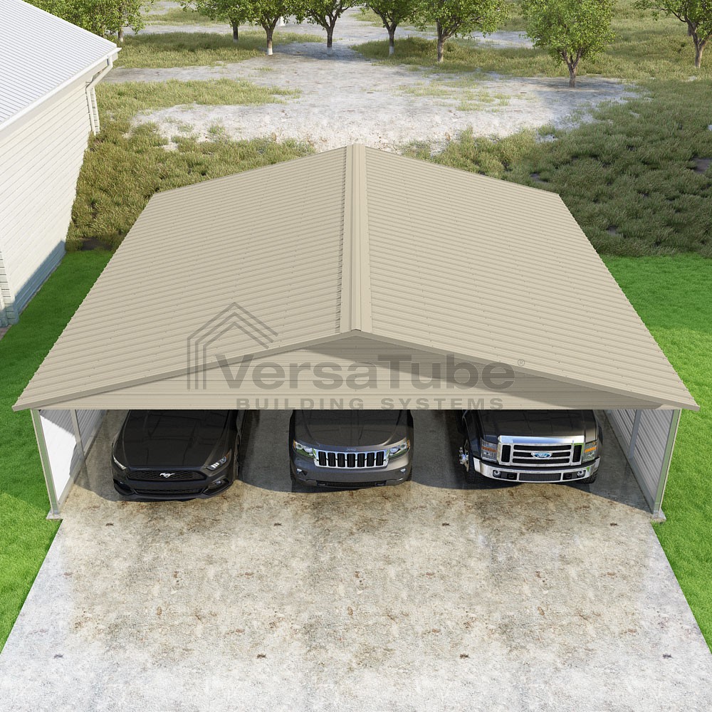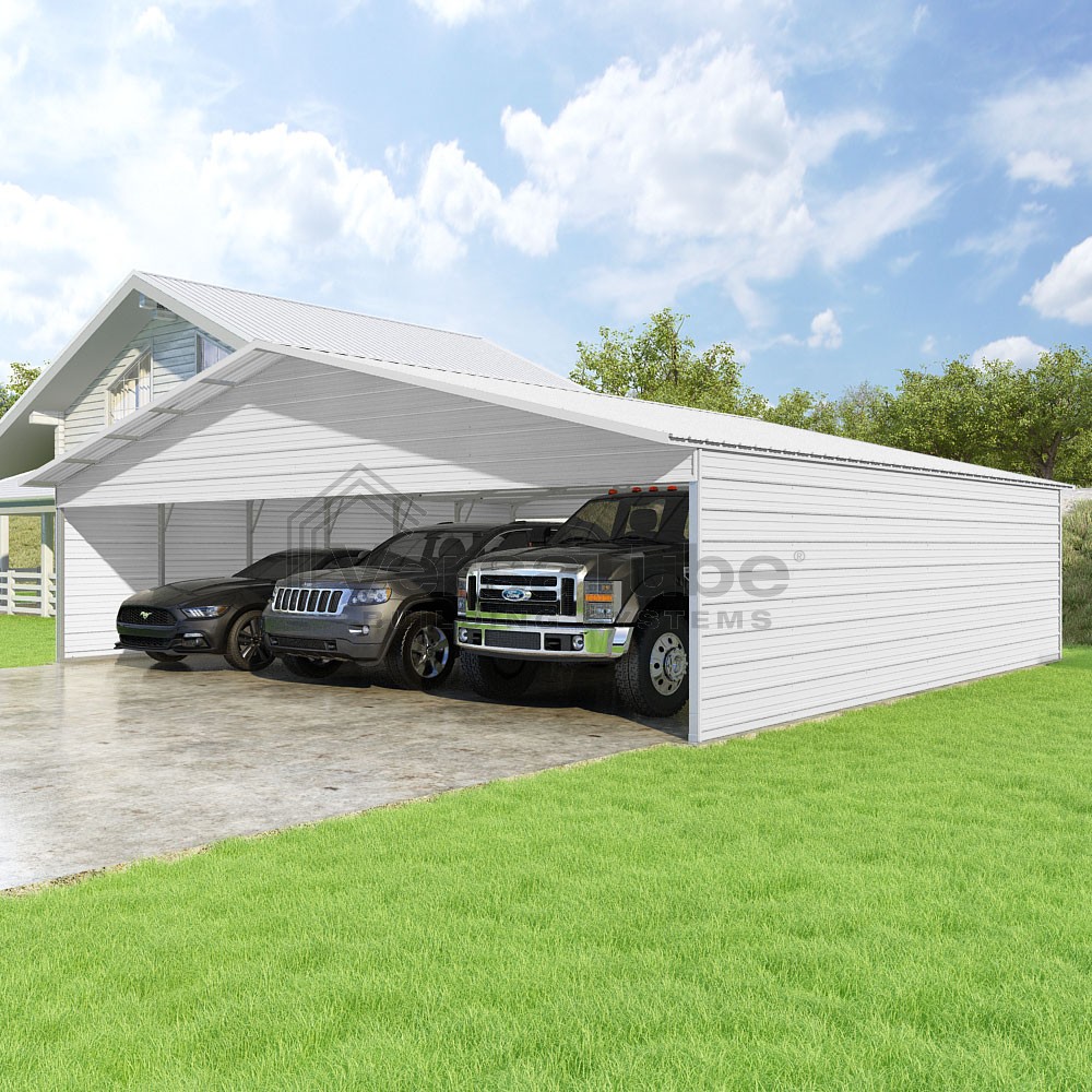 Pinnacle Series DIY carport kit features vertical sheet metal roof panels with ridge cap, gable and eave trim for an A-frame roof style and extended coverage on both ends.