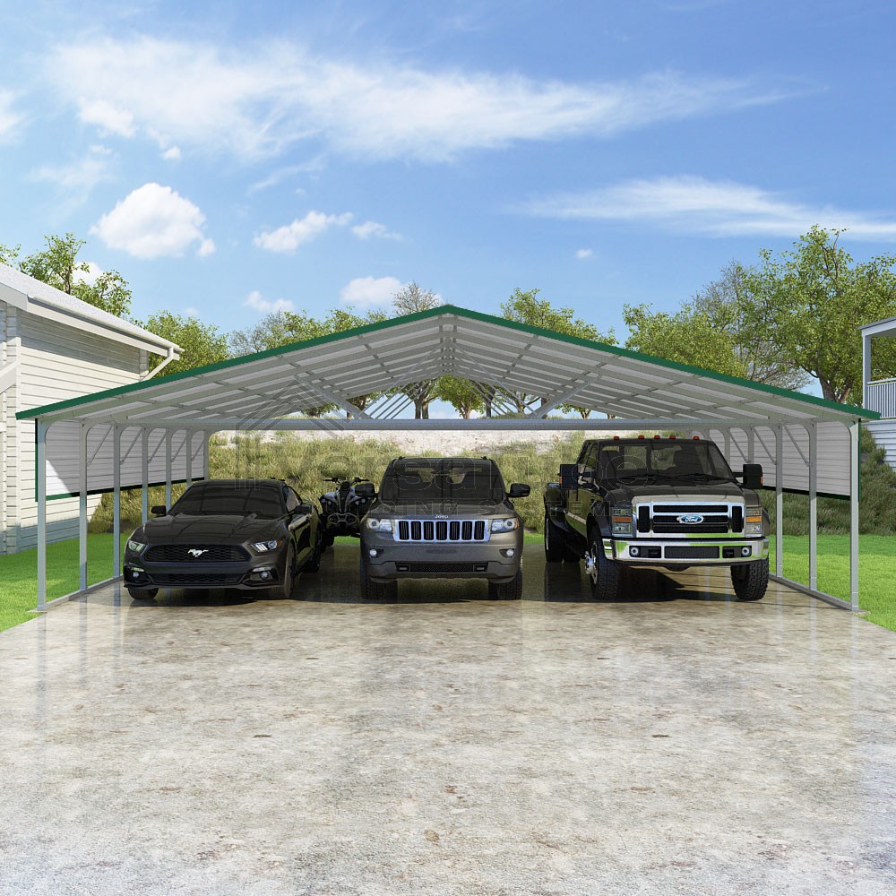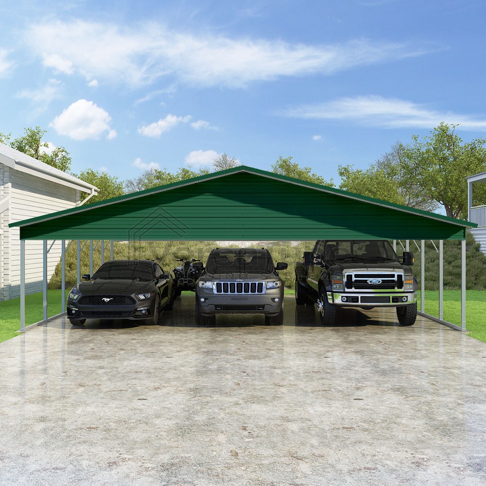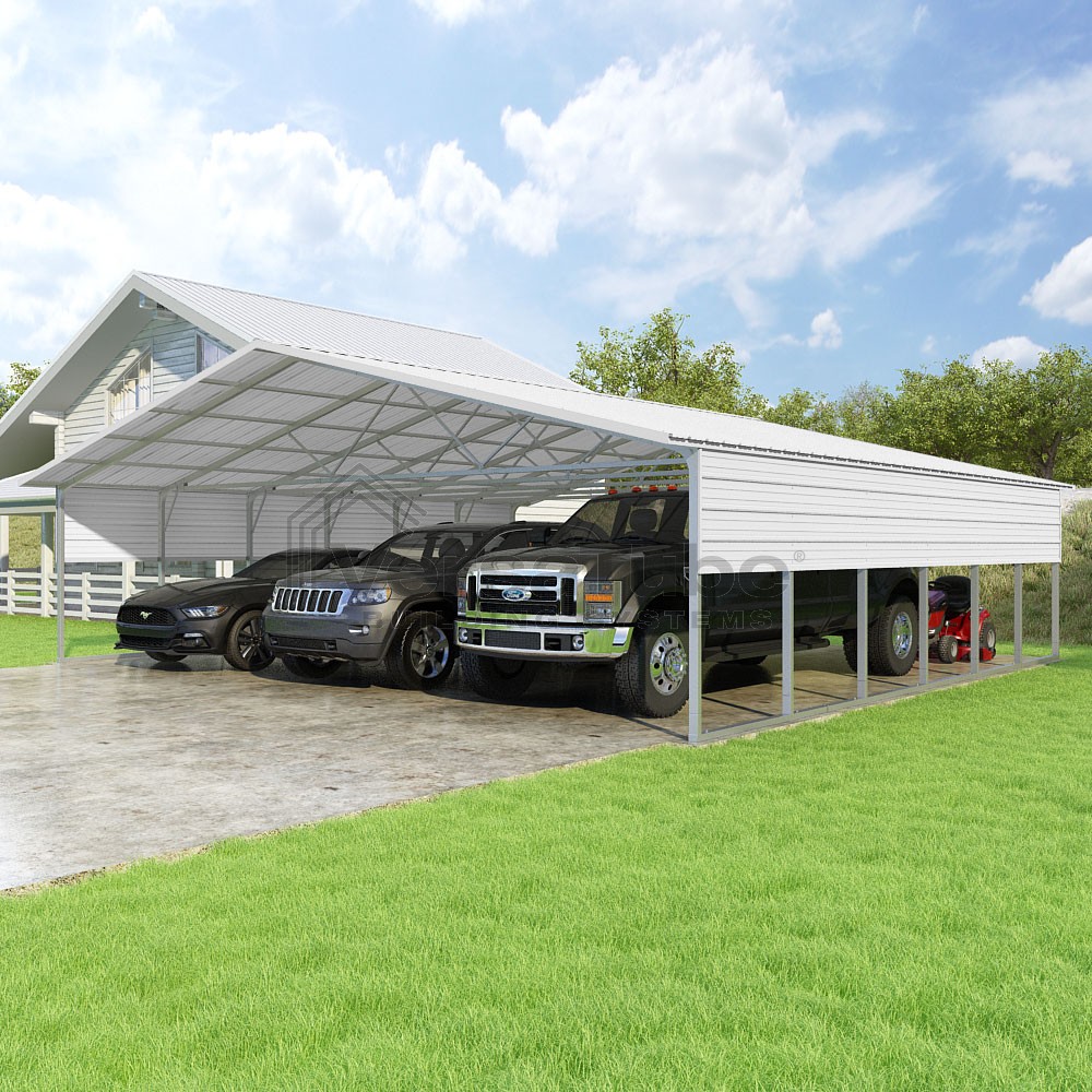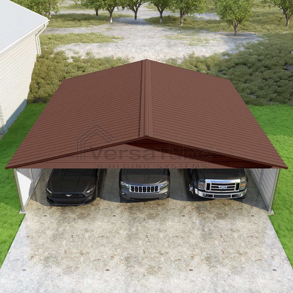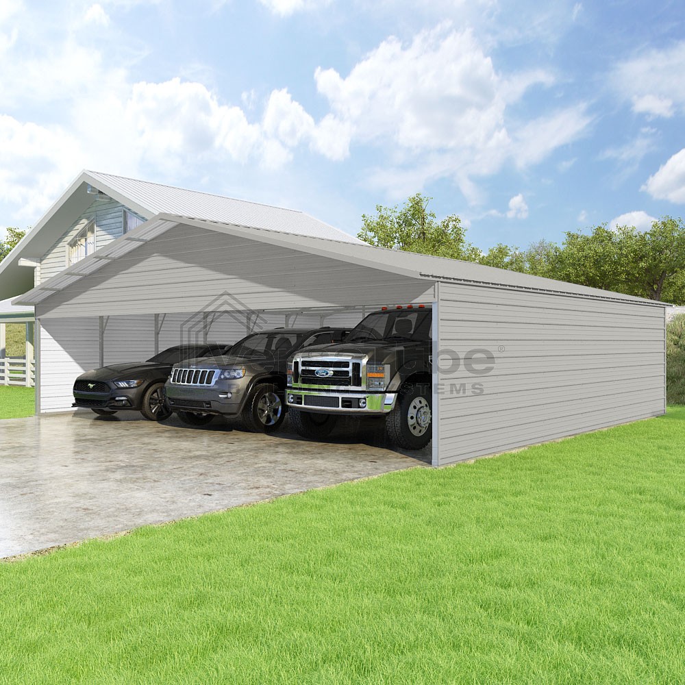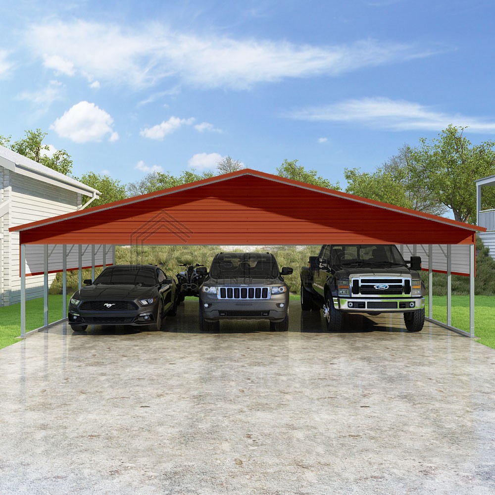 Pinnacle Series DIY carport kit features vertical sheet metal roof panels with ridge cap, gable and eave trim for an A-frame roof style and extended coverage on both ends.