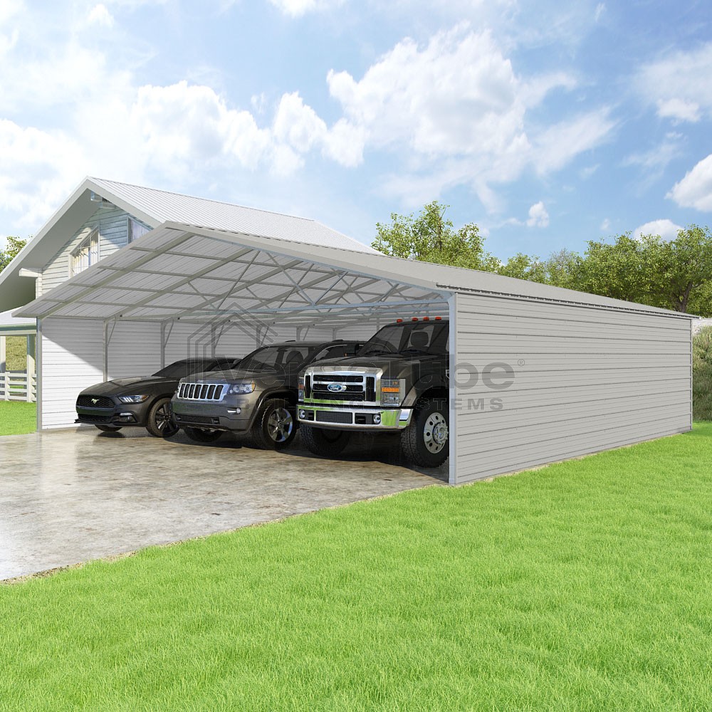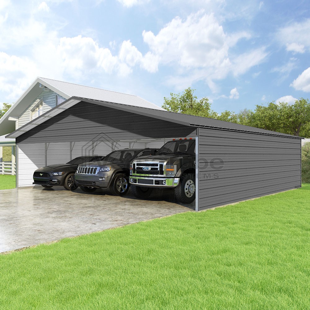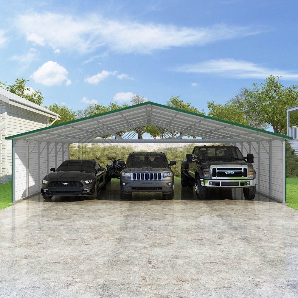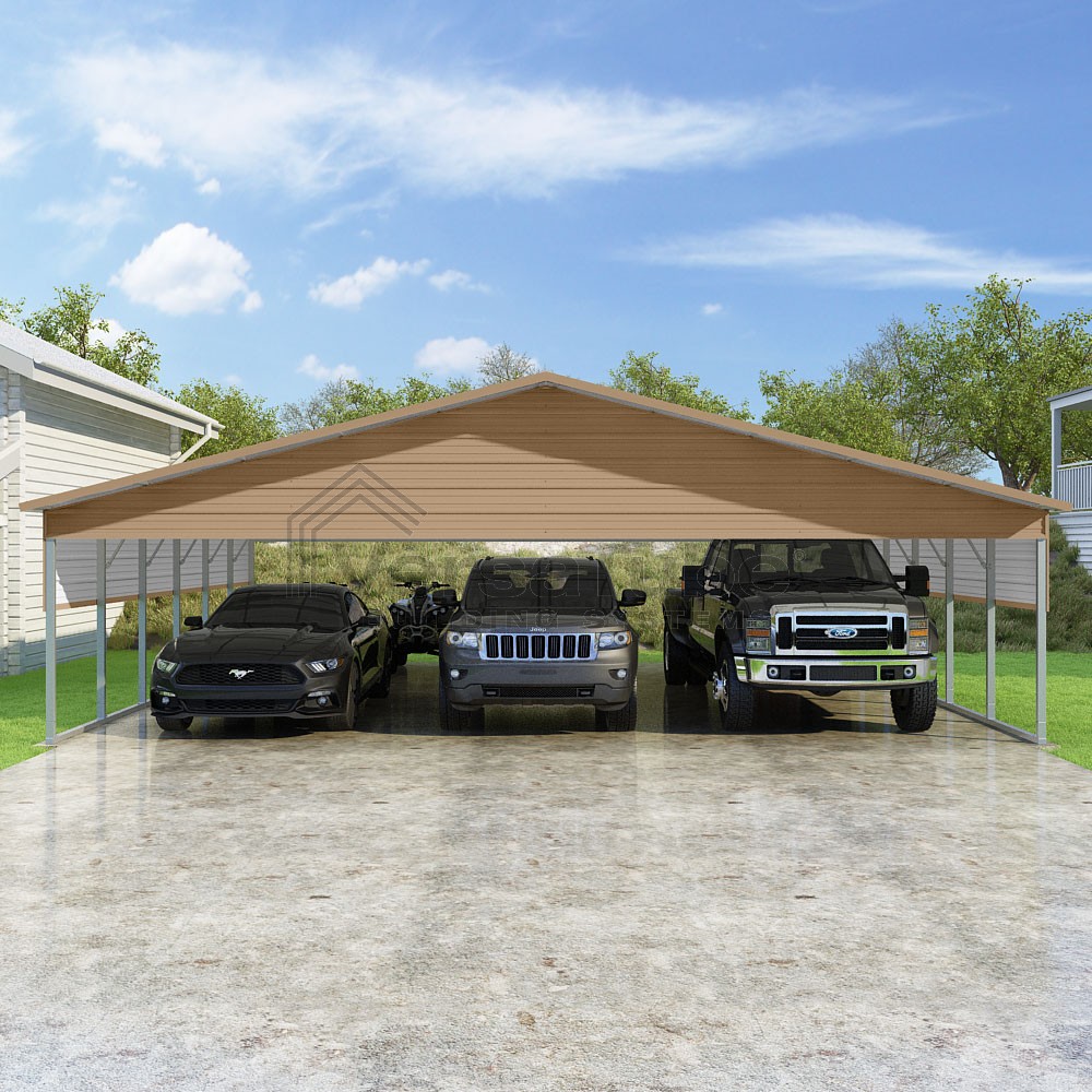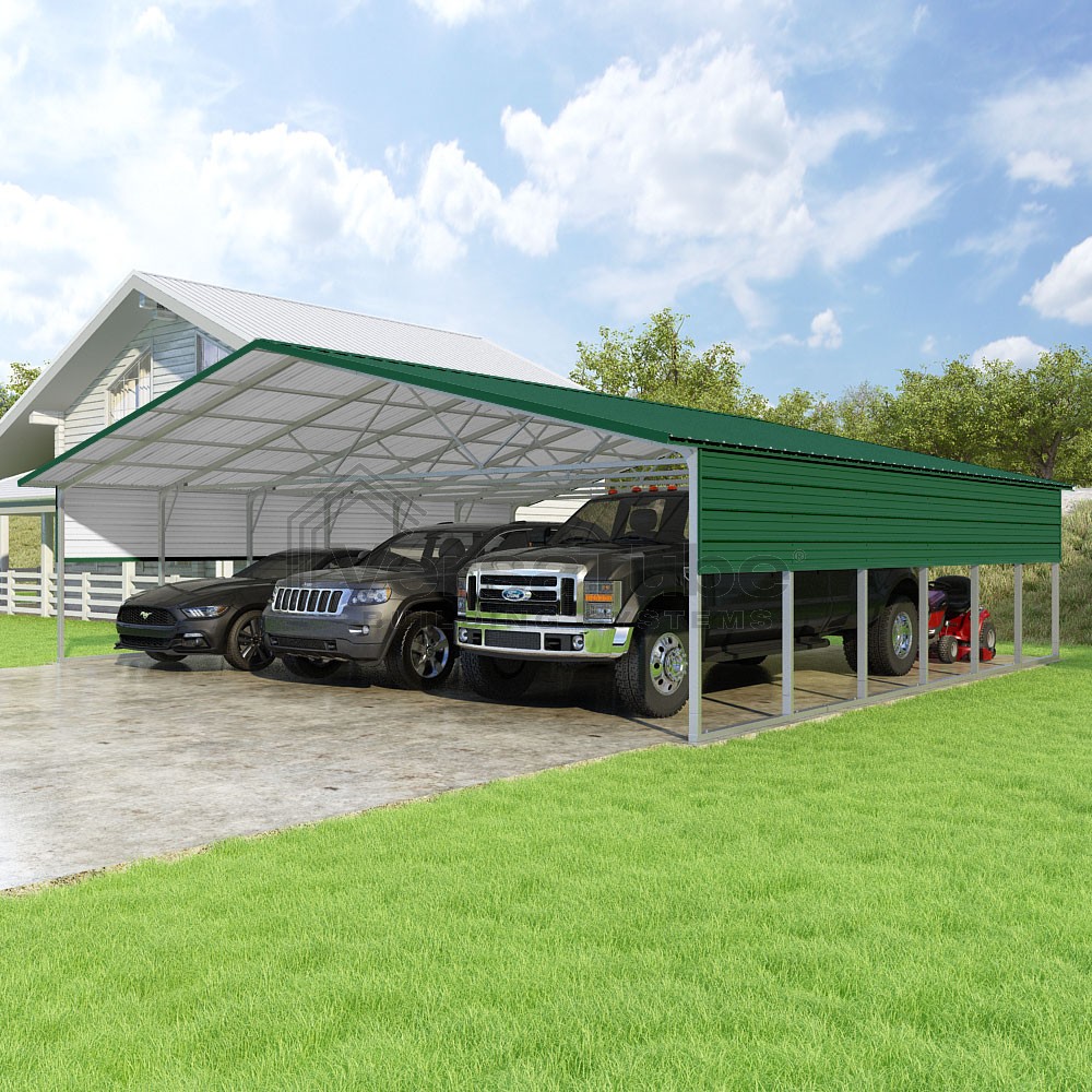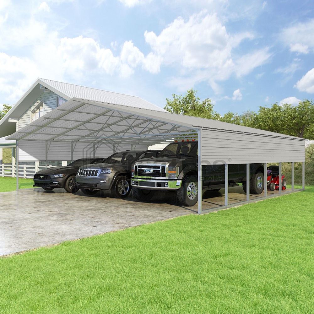 Pinnacle Series DIY carport kit features vertical sheet metal roof panels with ridge cap, gable and eave trim for an A-frame roof style and extended coverage on both ends.
