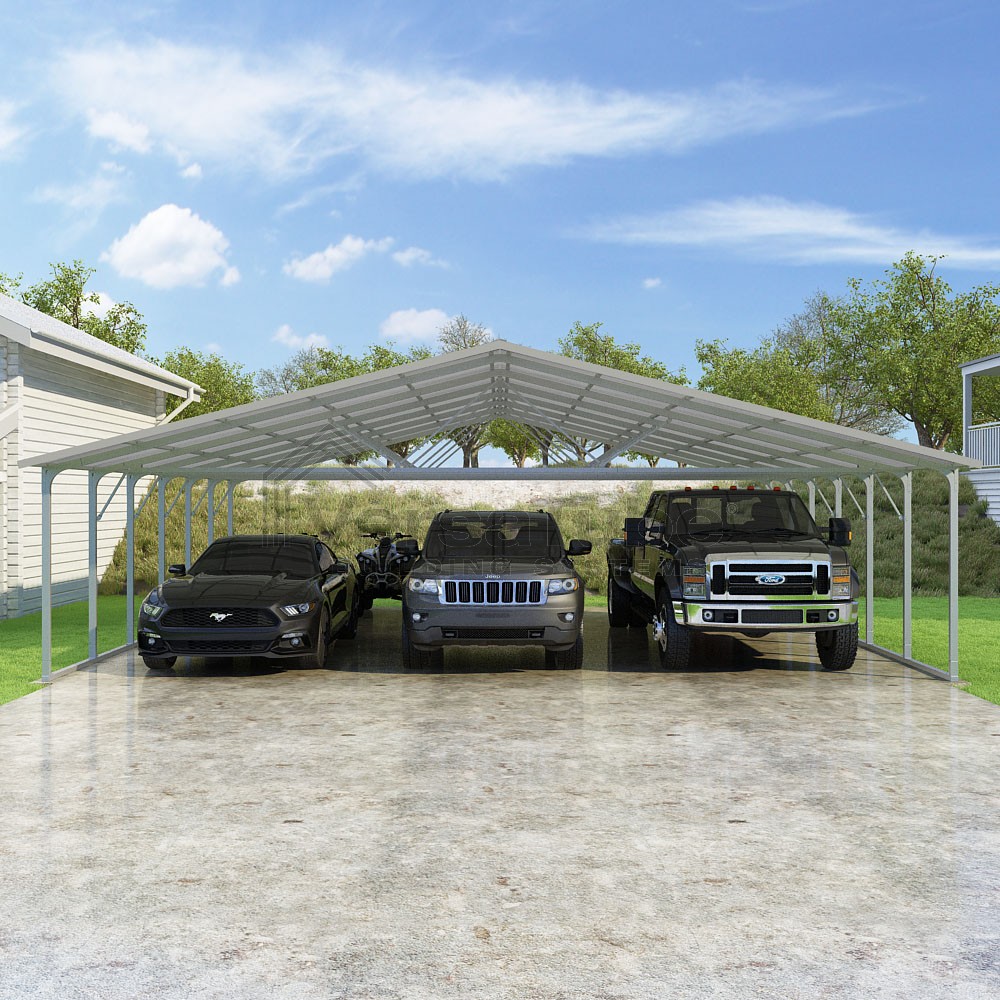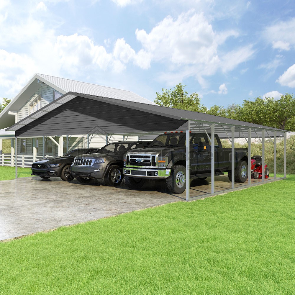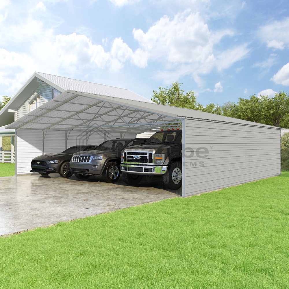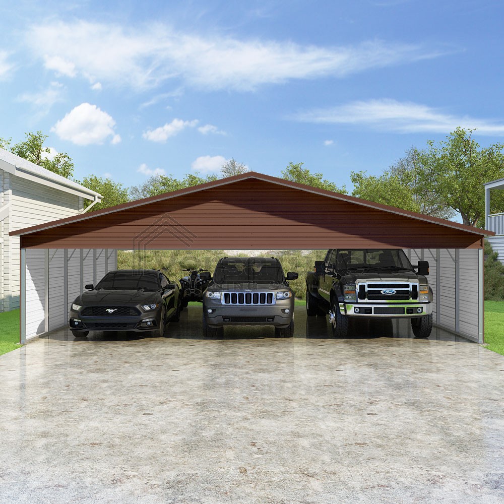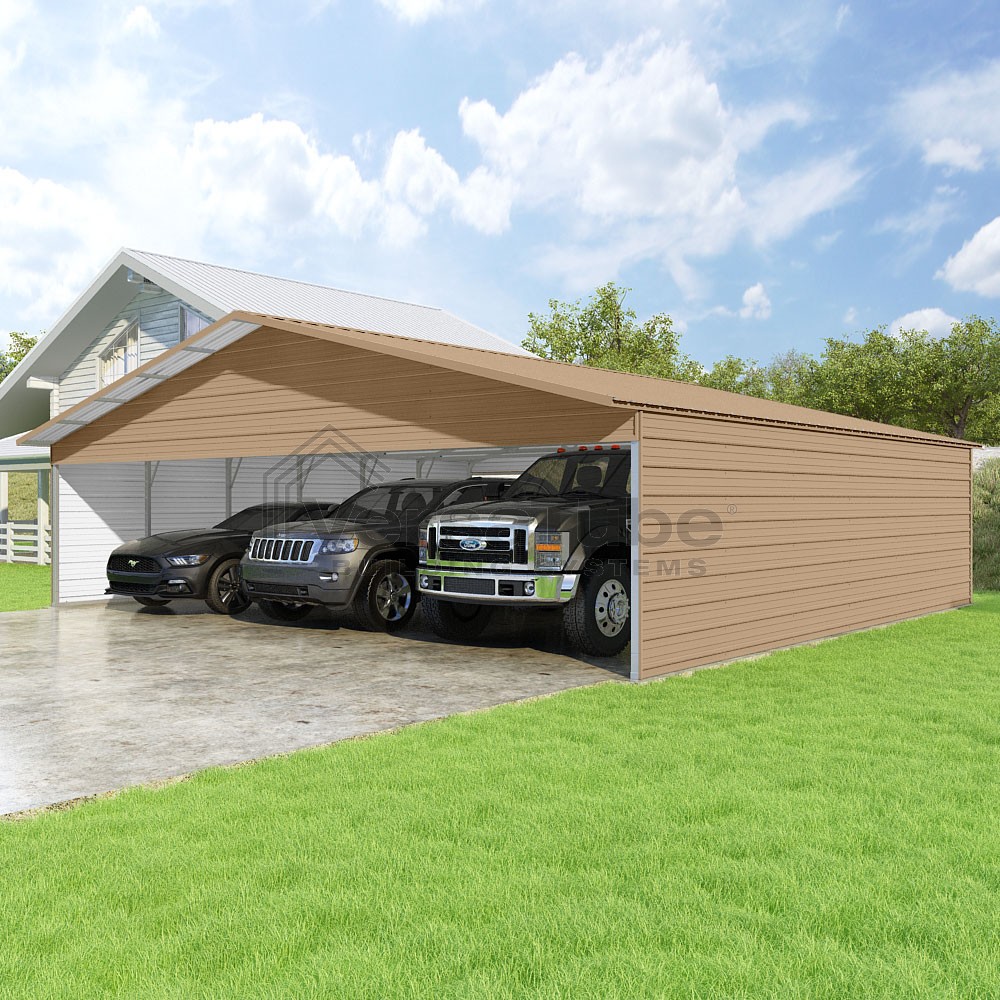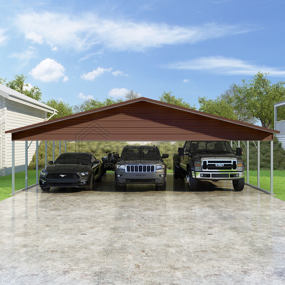 Pinnacle Series DIY carport kit features vertical sheet metal roof panels with ridge cap, gable and eave trim for an A-frame roof style and extended coverage on both ends.