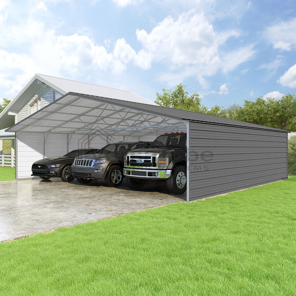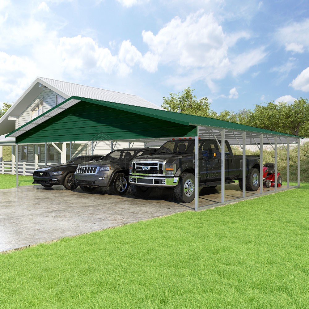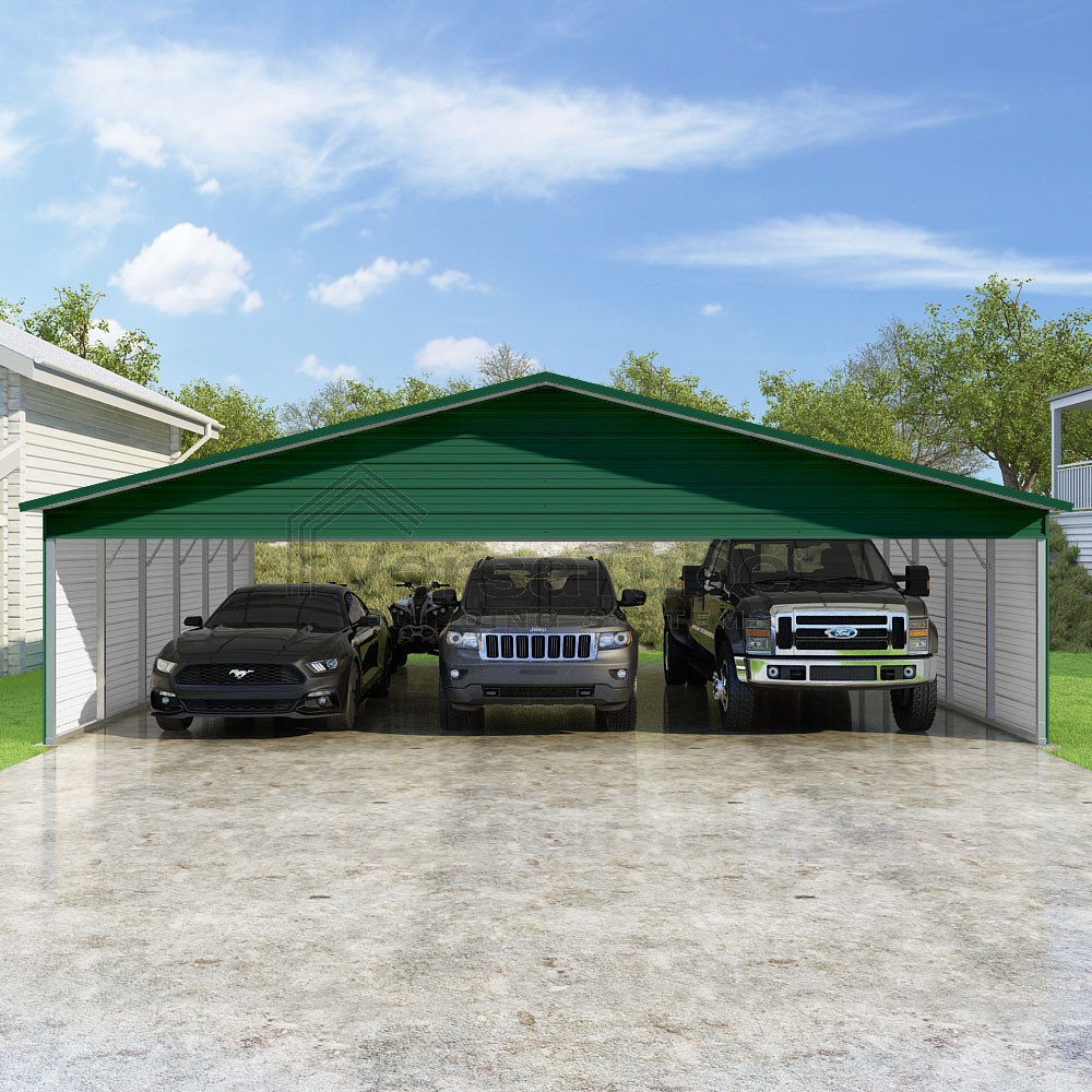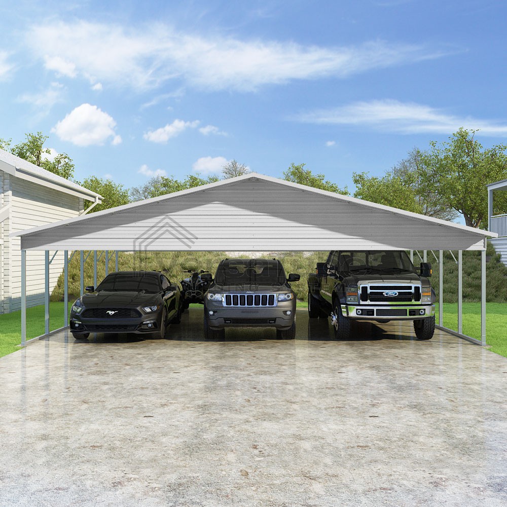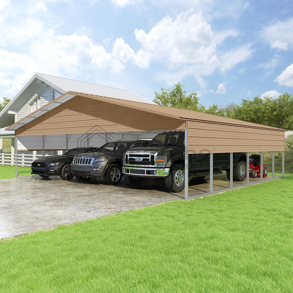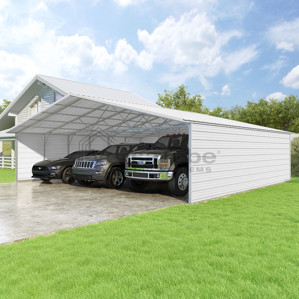 Pinnacle Series DIY carport kit features vertical sheet metal roof panels with ridge cap, gable and eave trim for an A-frame roof style and extended coverage on both ends.