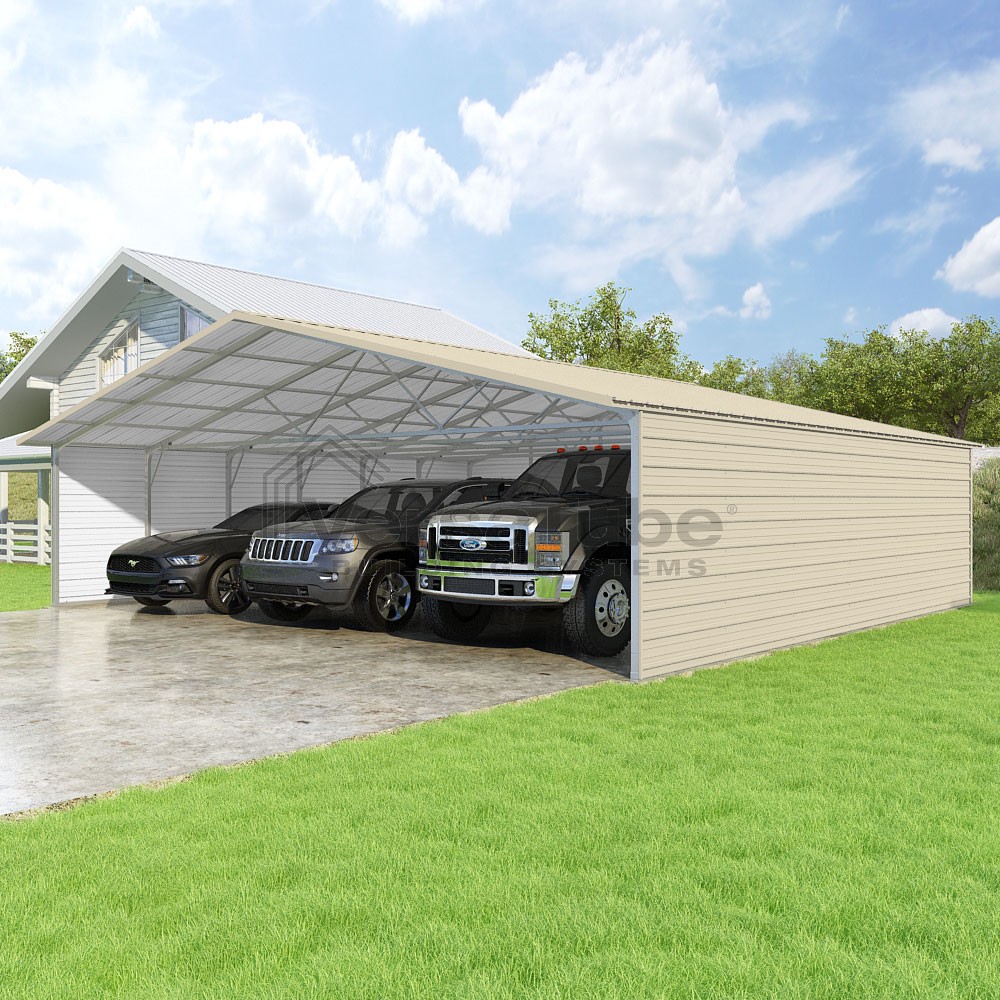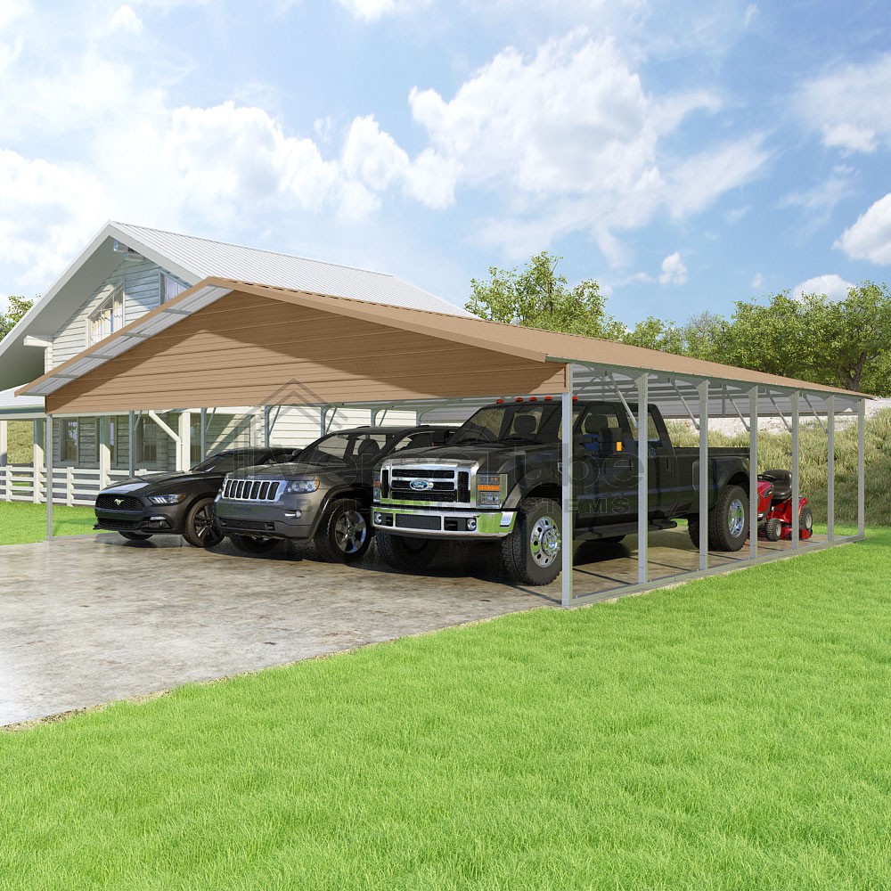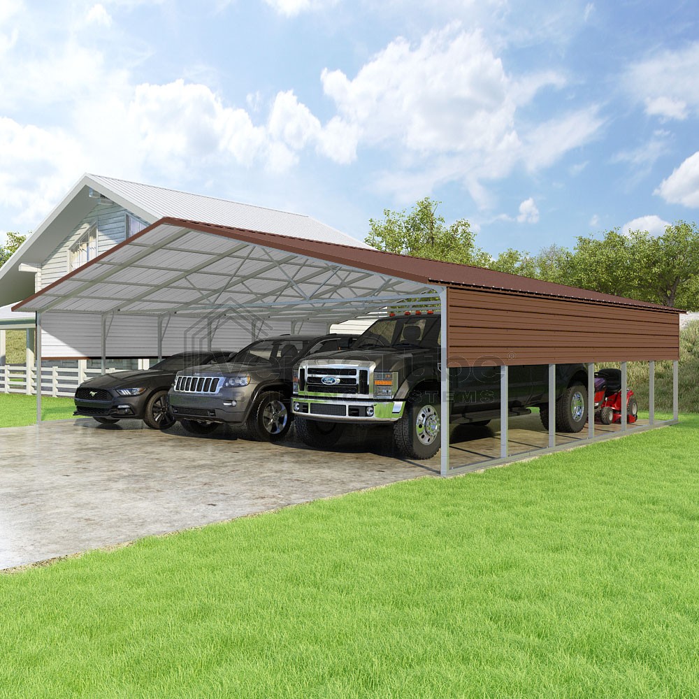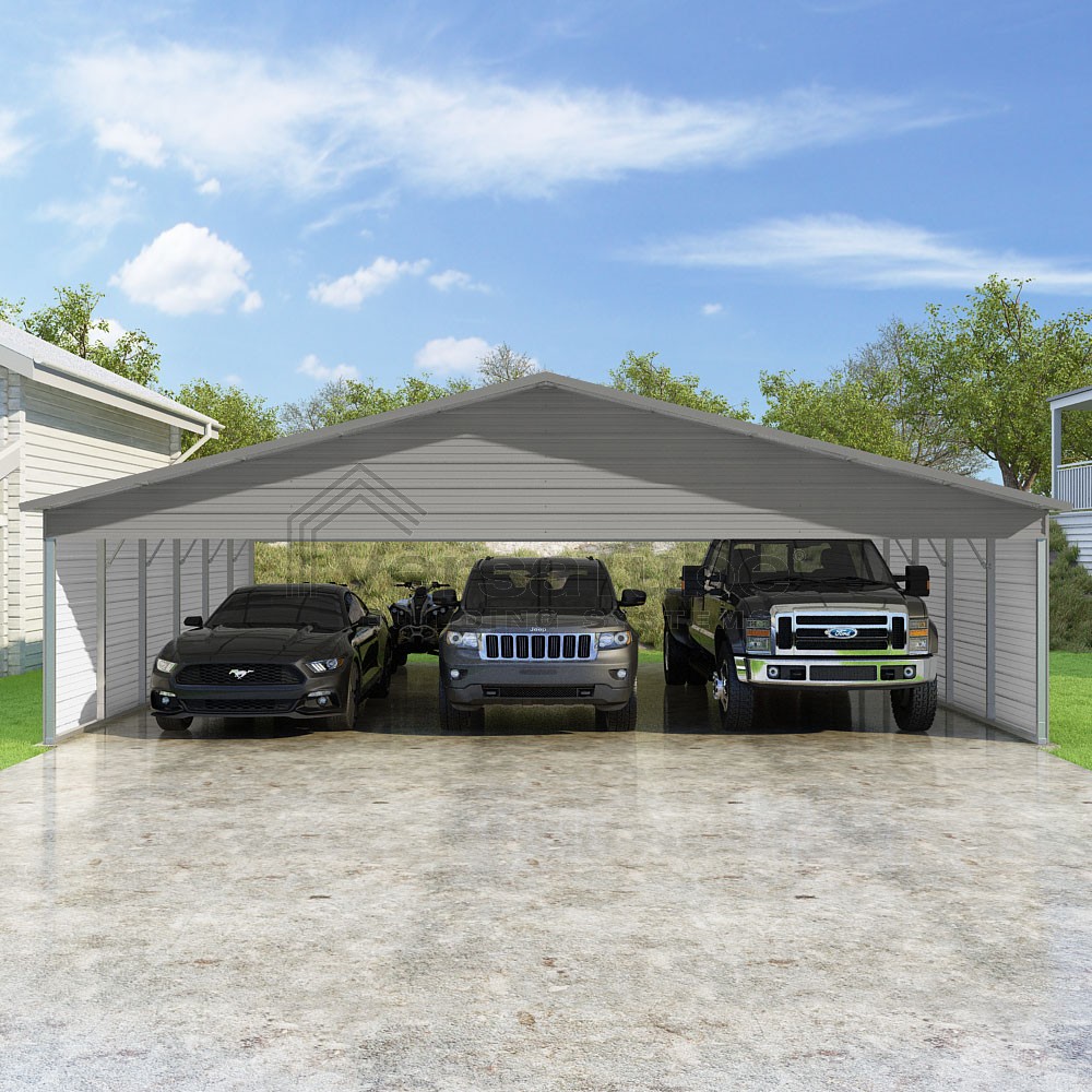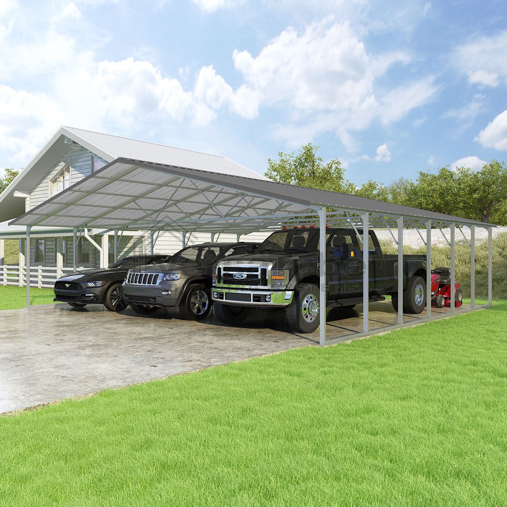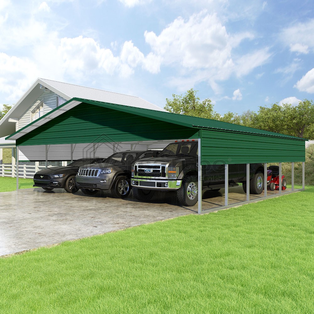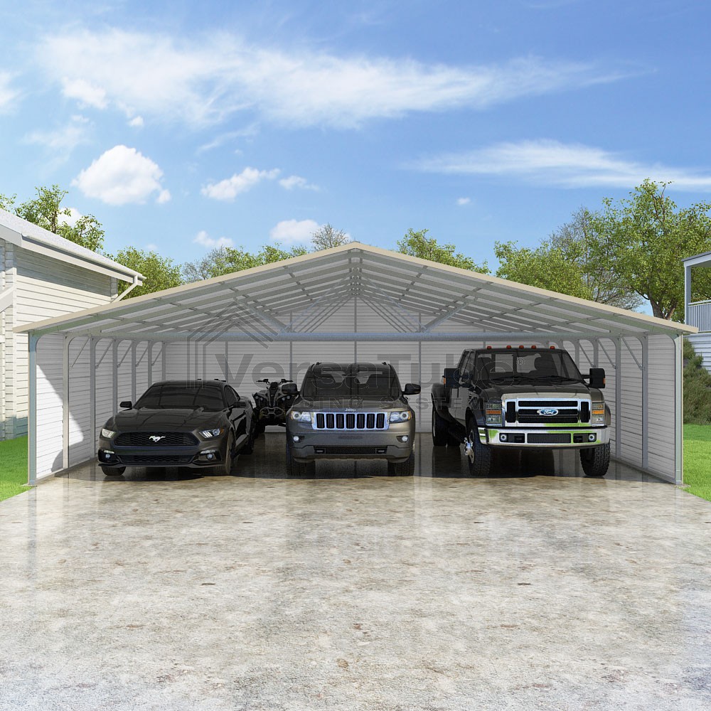 Pinnacle Series DIY carport kit features vertical sheet metal roof panels with ridge cap, gable and eave trim for an A-frame roof style and extended coverage on both ends.