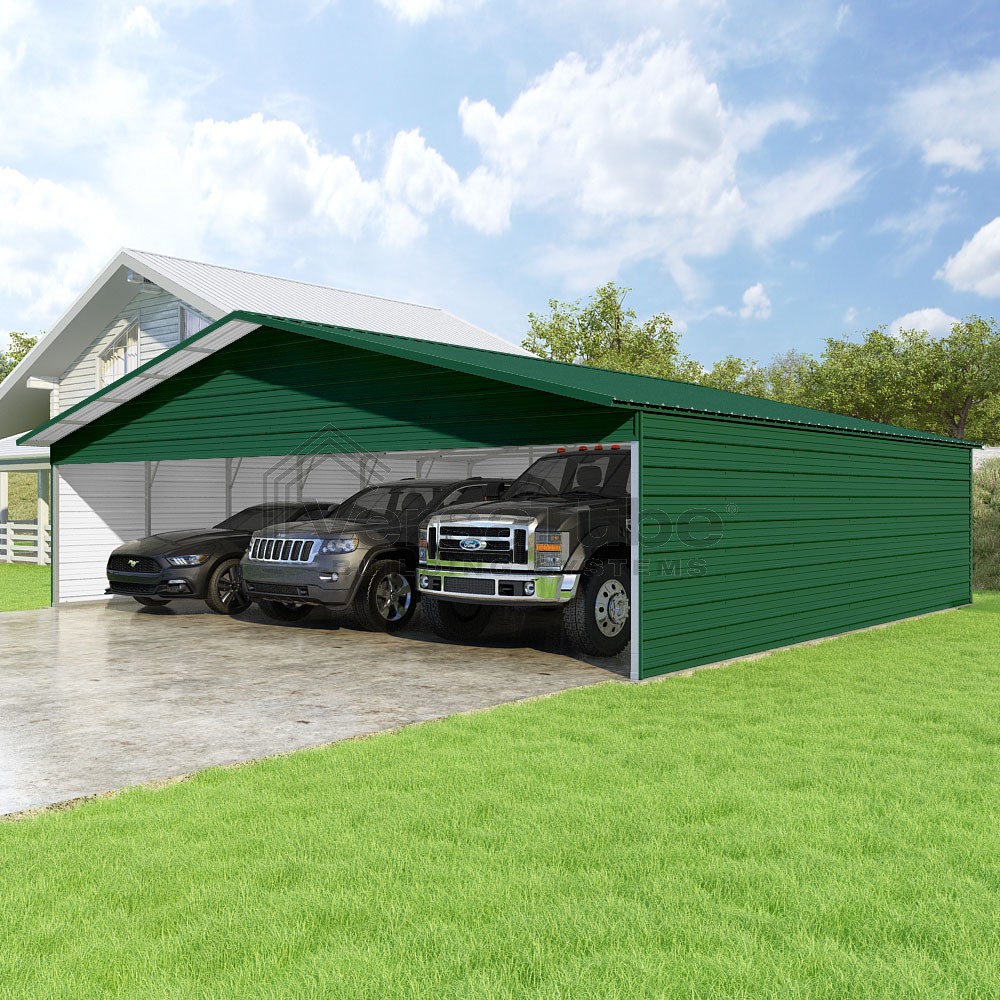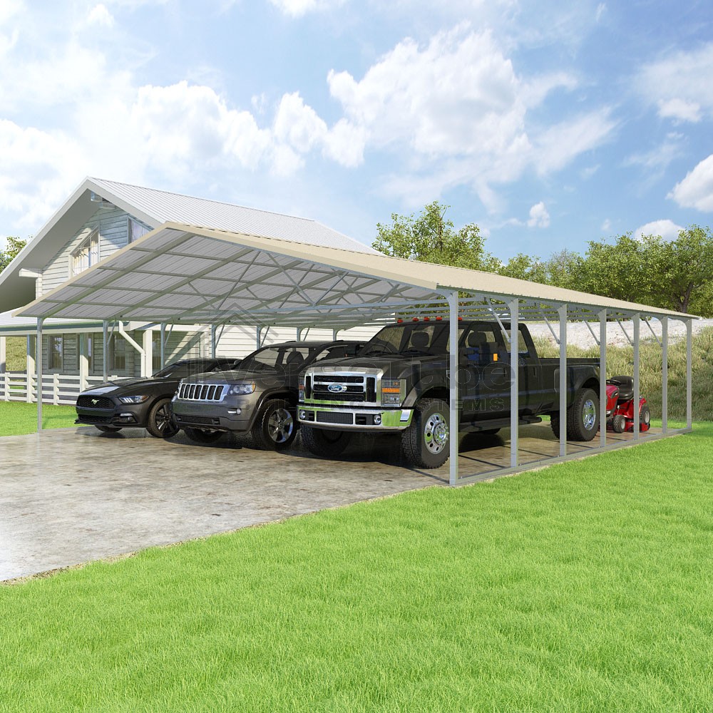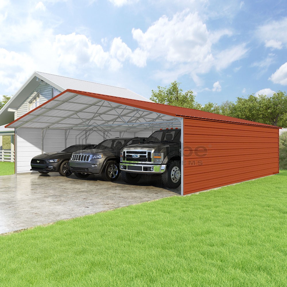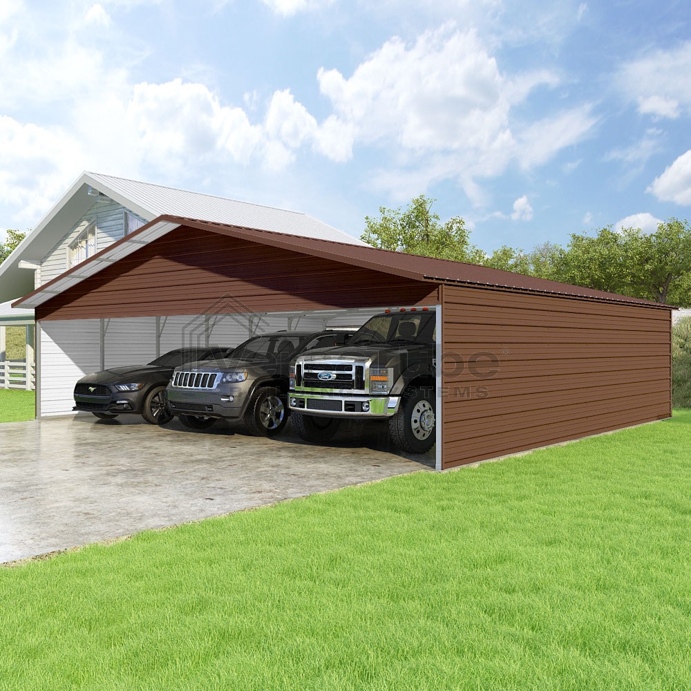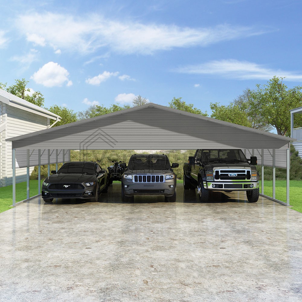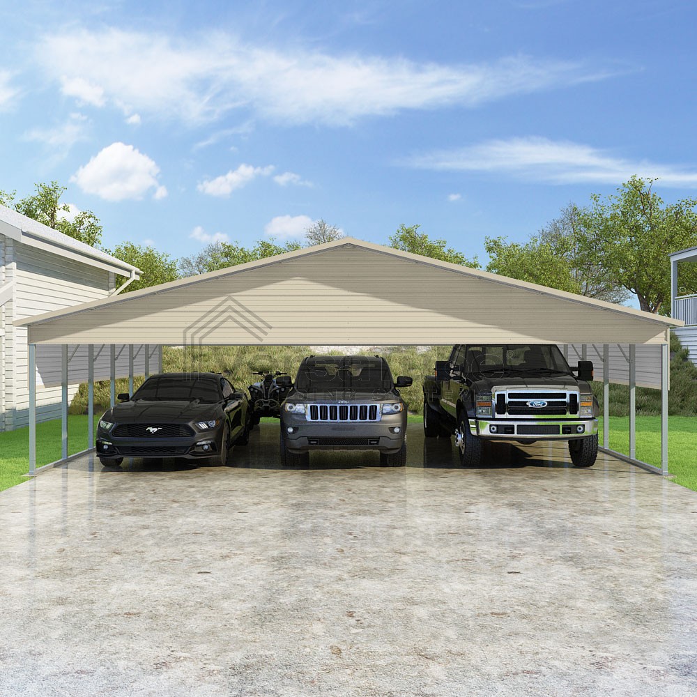 Pinnacle Series DIY carport kit features vertical sheet metal roof panels with ridge cap, gable and eave trim for an A-frame roof style and extended coverage on both ends.