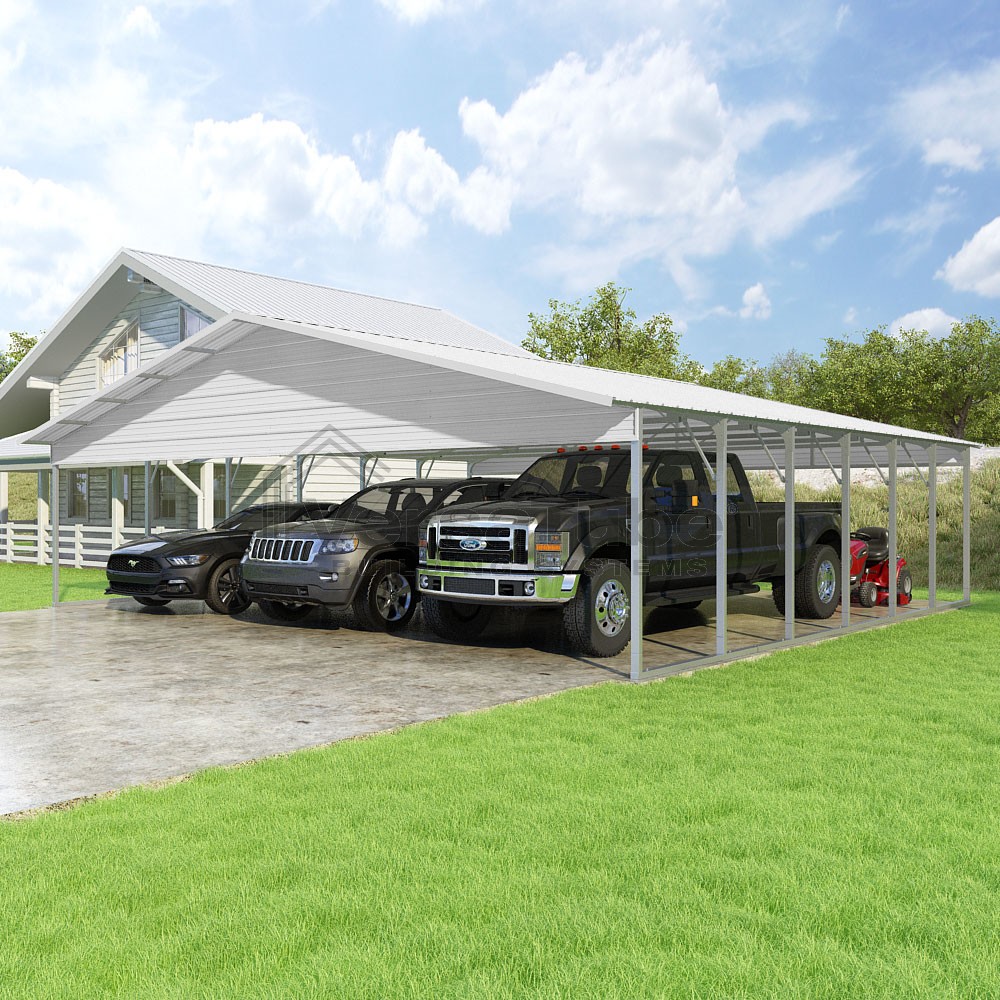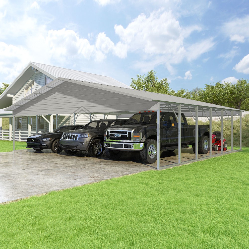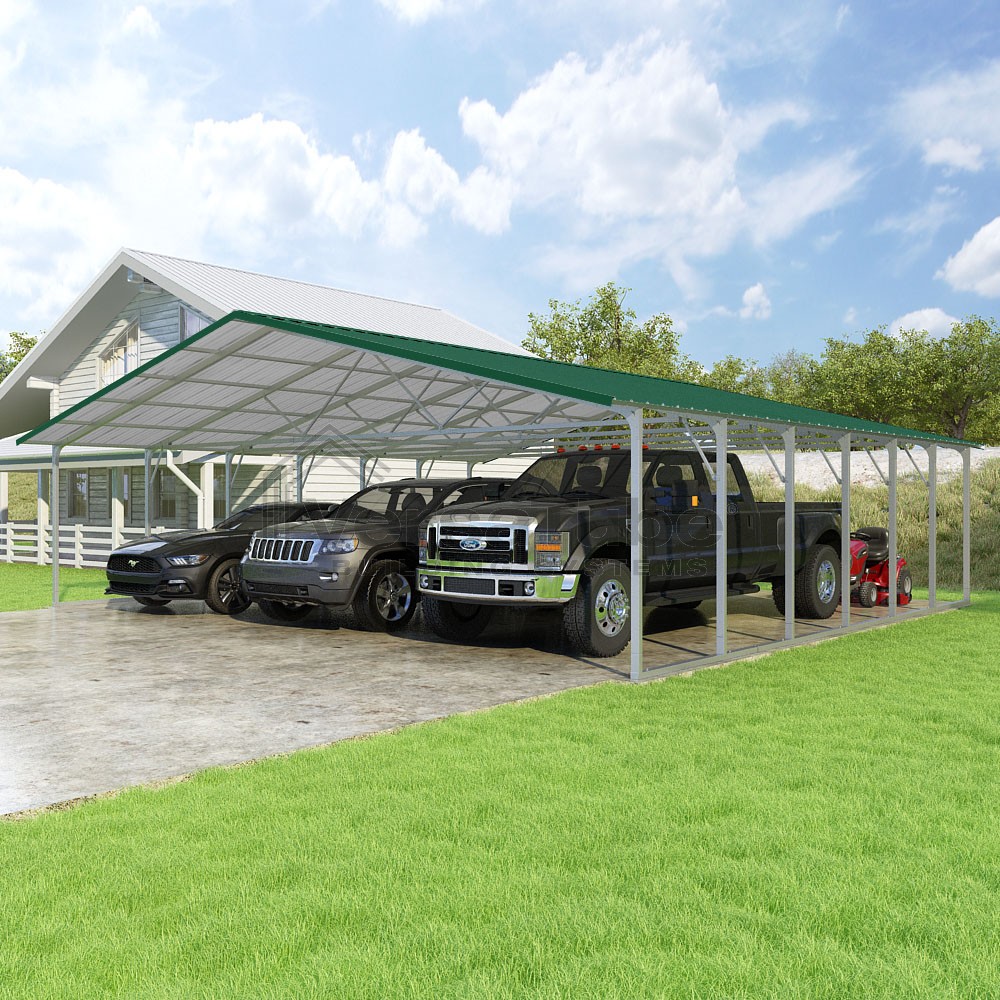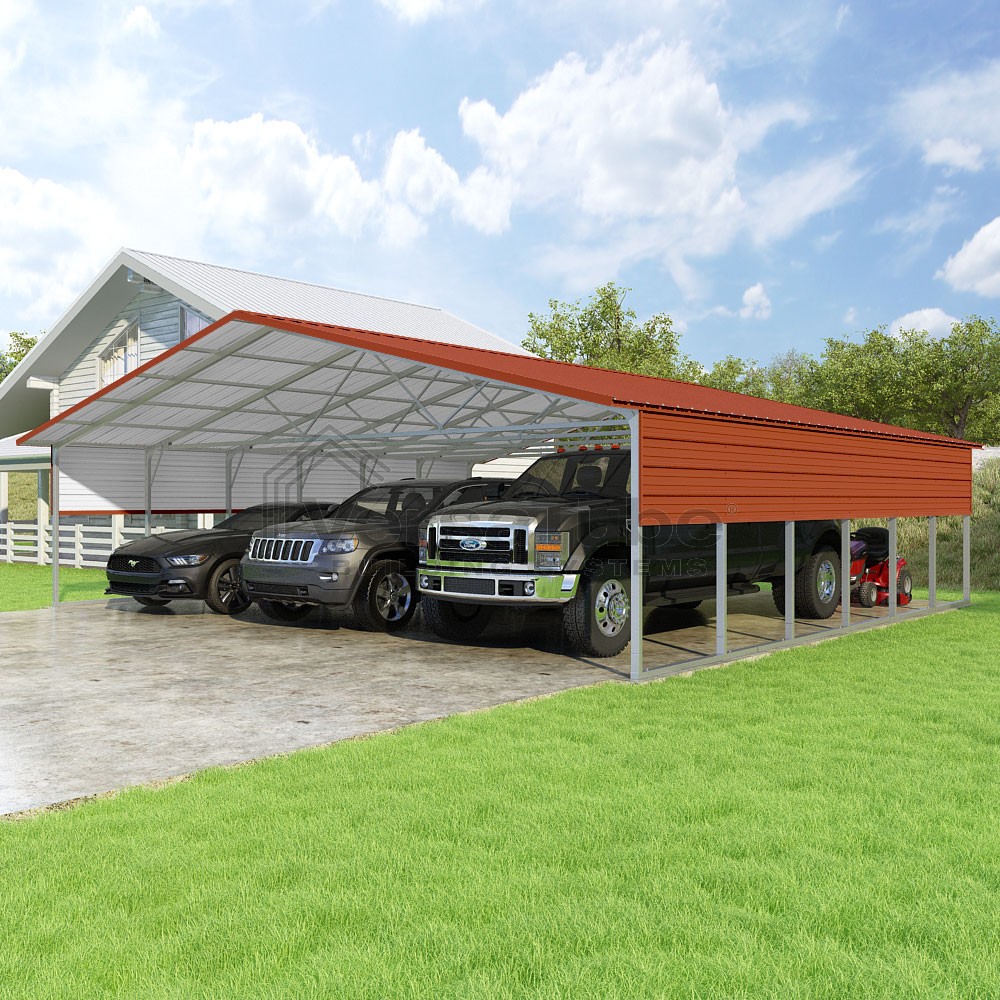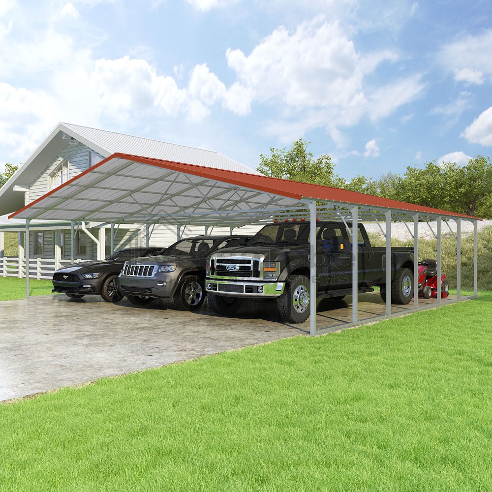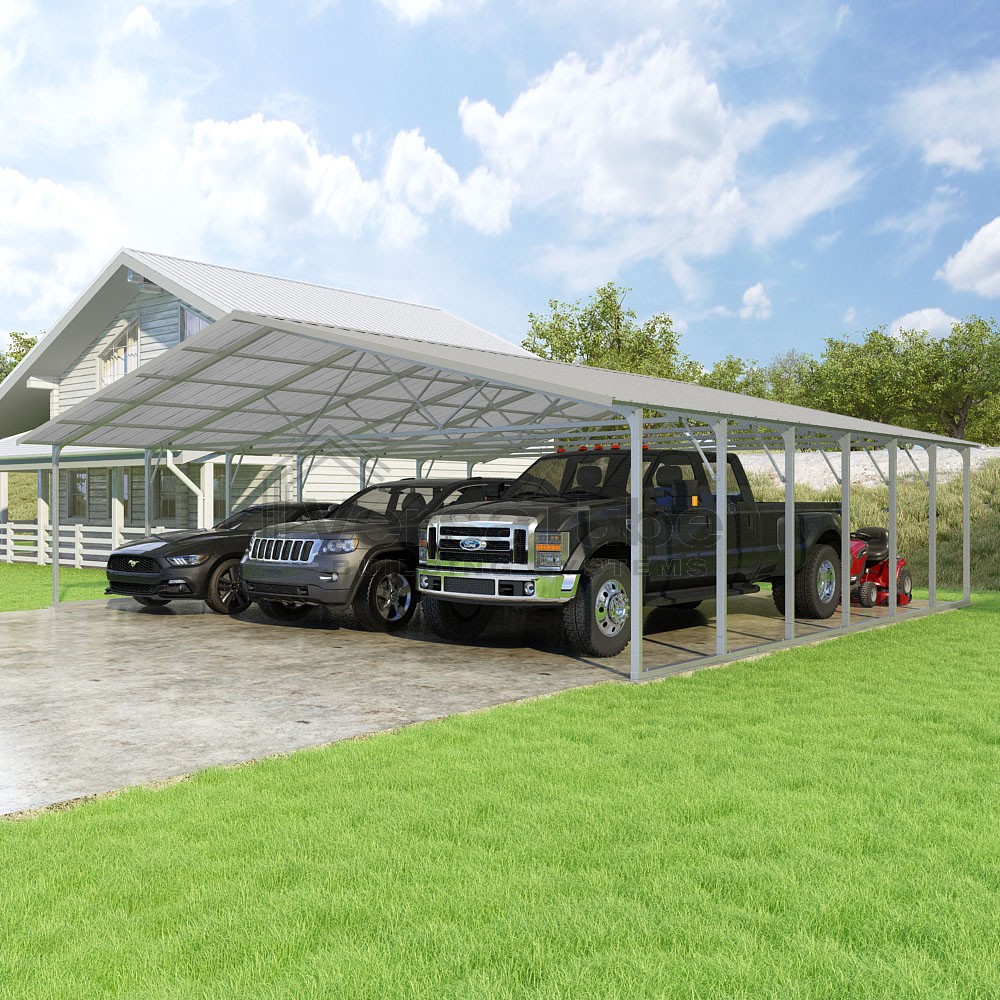 Pinnacle Series DIY carport kit features vertical sheet metal roof panels with ridge cap, gable and eave trim for an A-frame roof style and extended coverage on both ends.