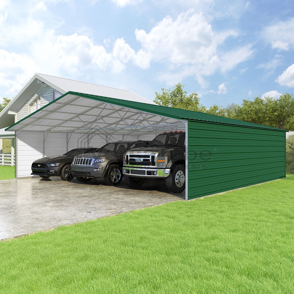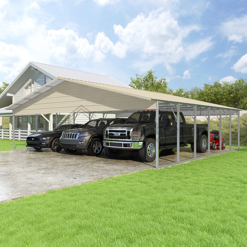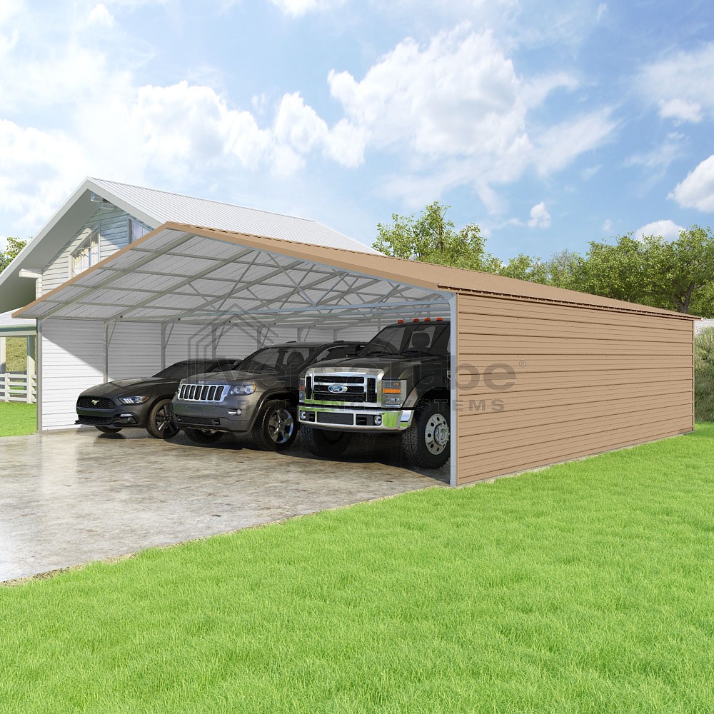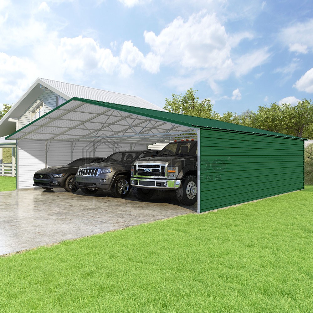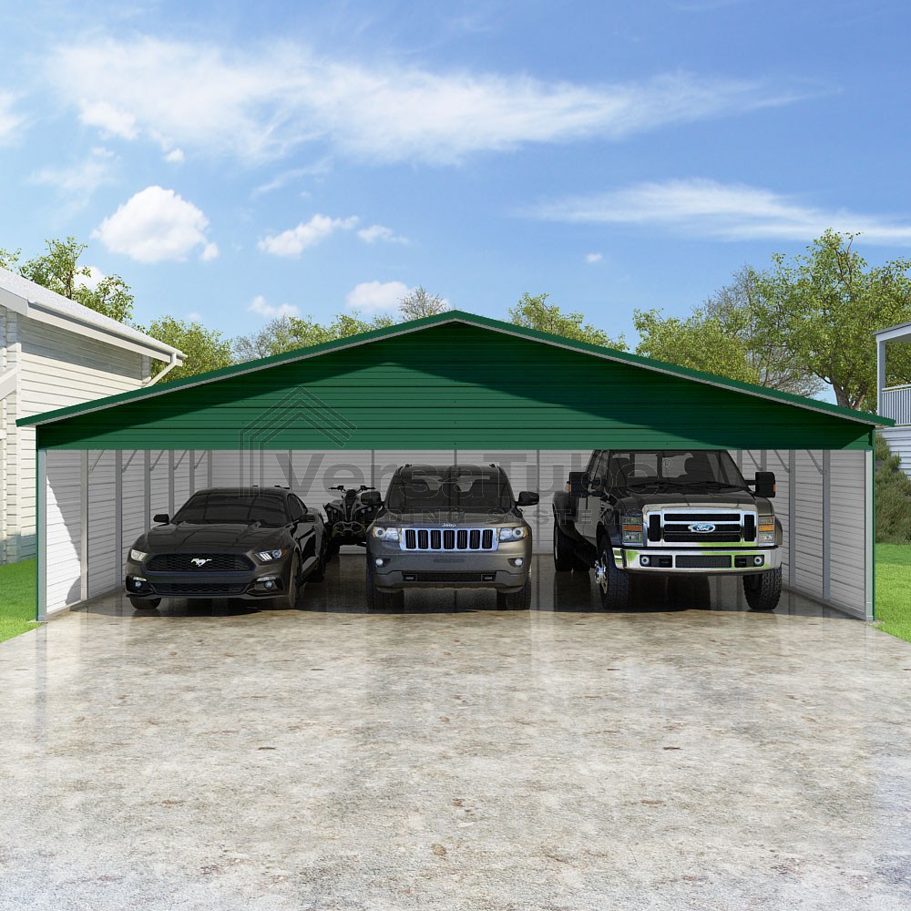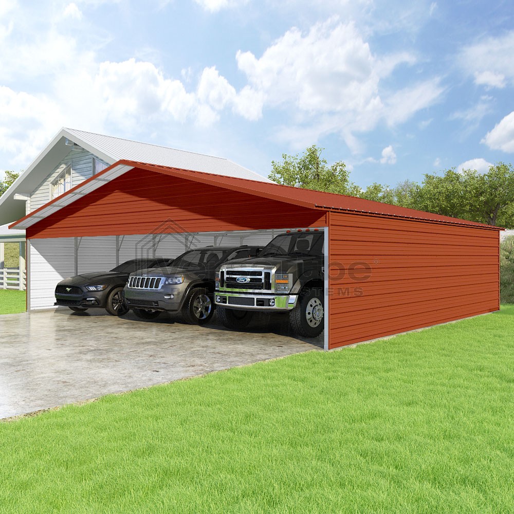 Pinnacle Series DIY carport kit features vertical sheet metal roof panels with ridge cap, gable and eave trim for an A-frame roof style and extended coverage on both ends.