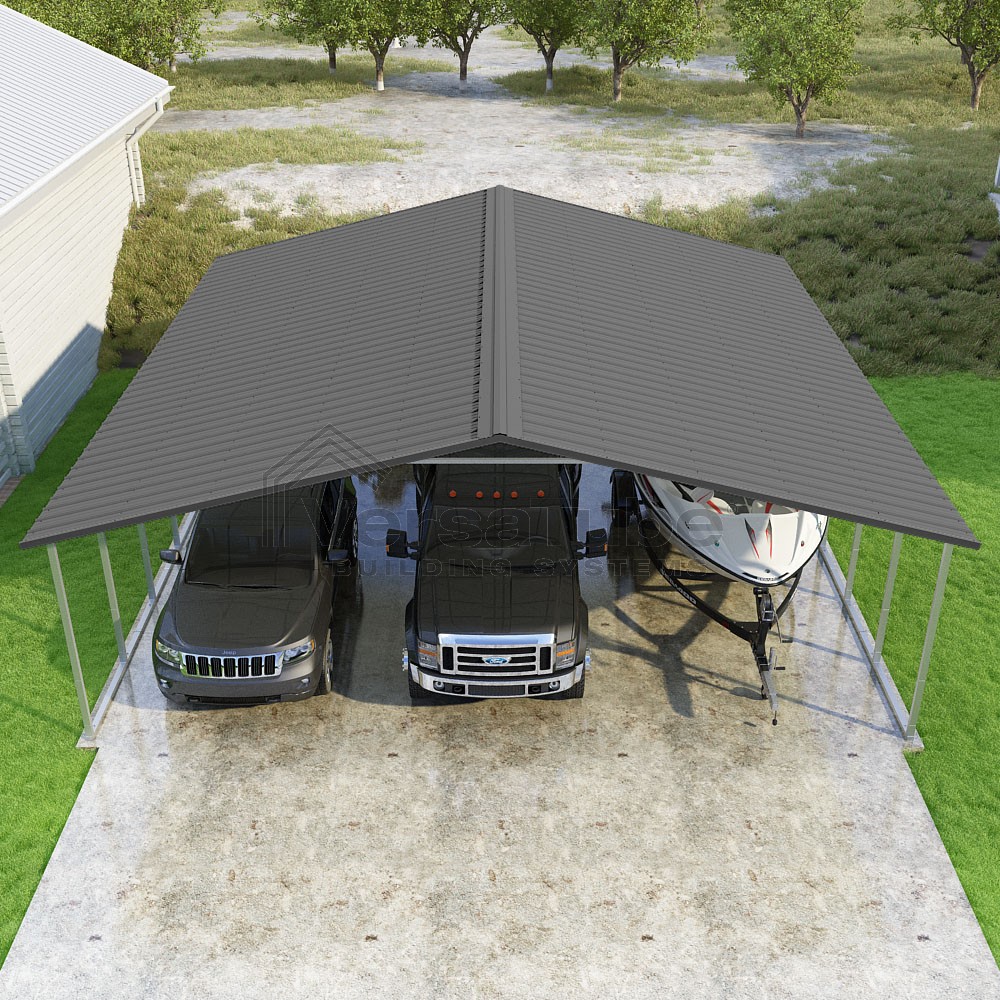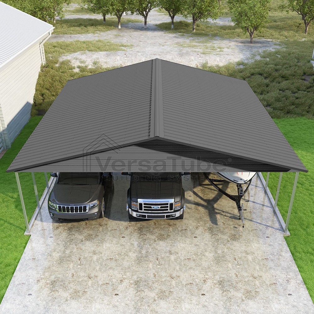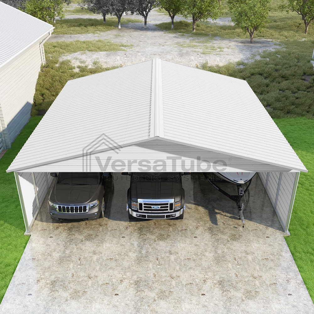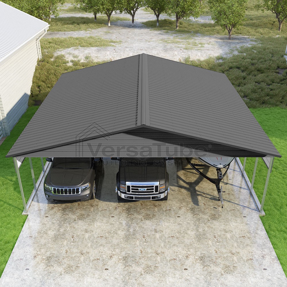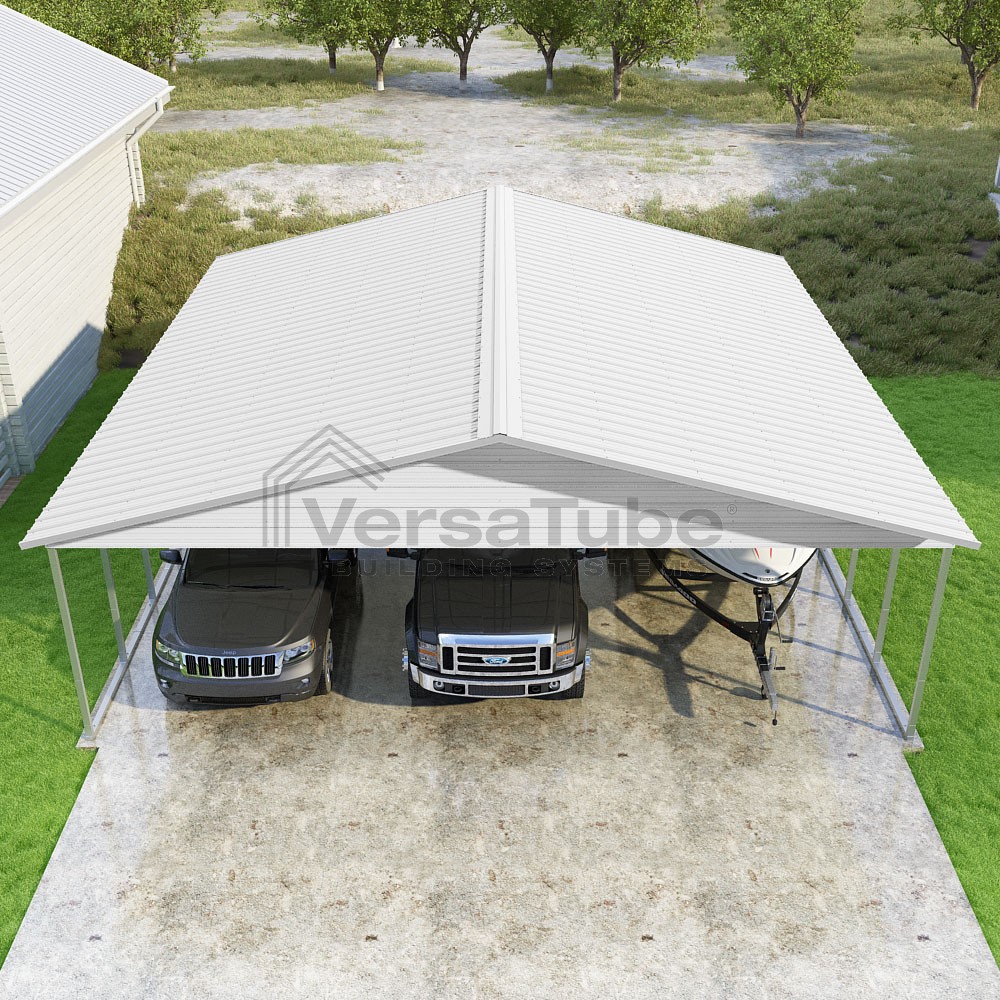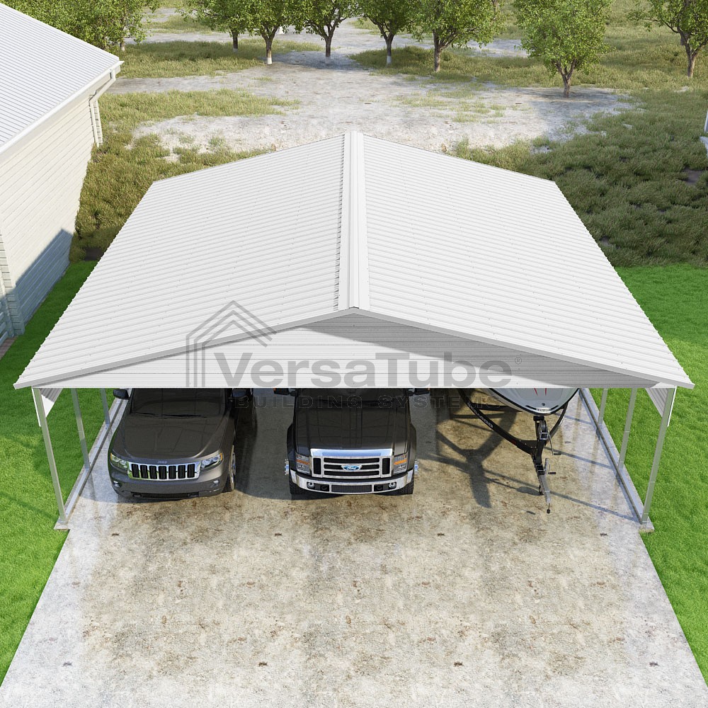 Pinnacle Series DIY carport kit features vertical sheet metal roof panels with ridge cap, gable and eave trim for an A-frame roof style and extended coverage on both ends.