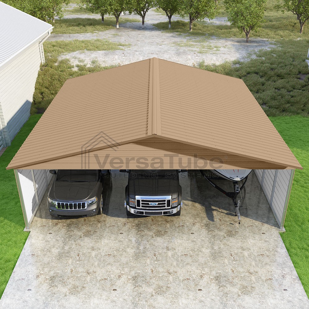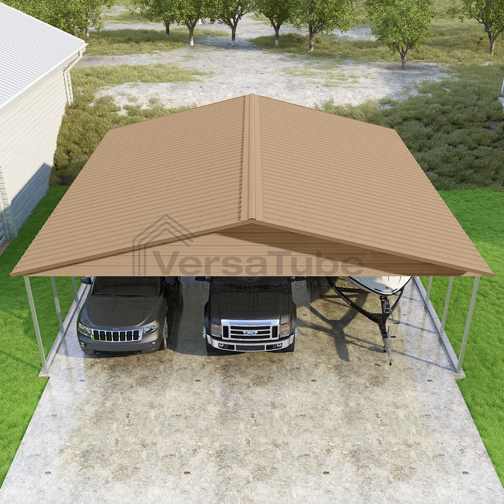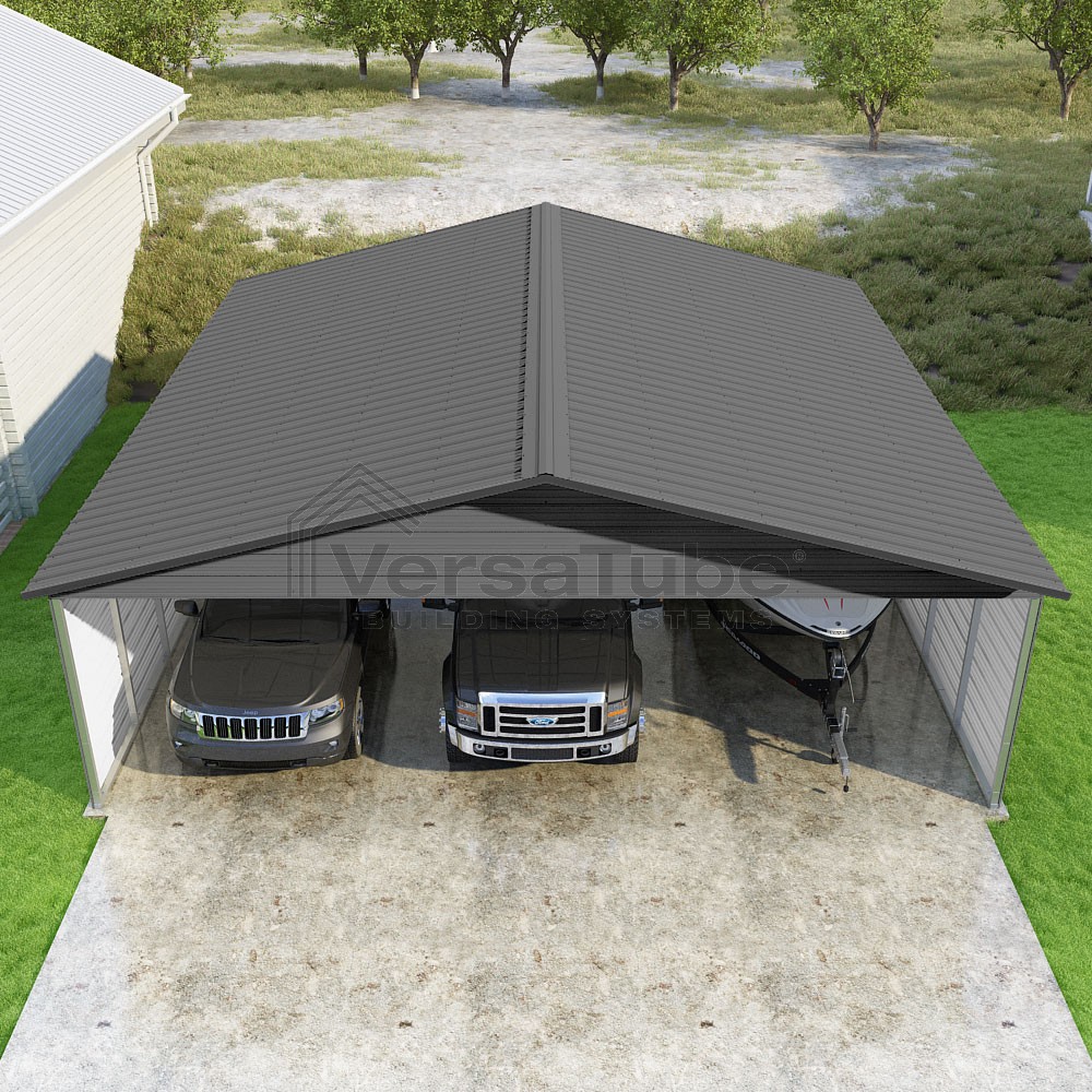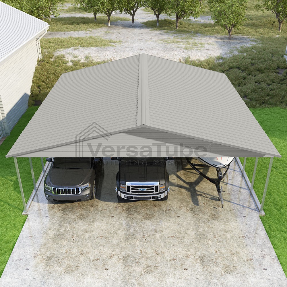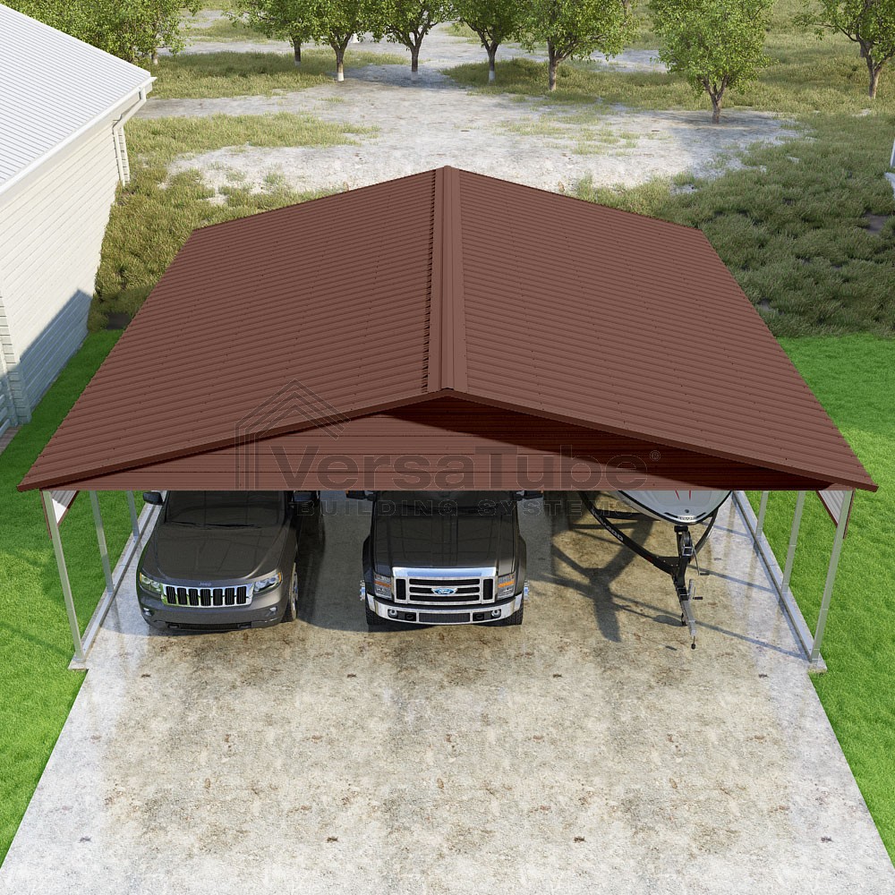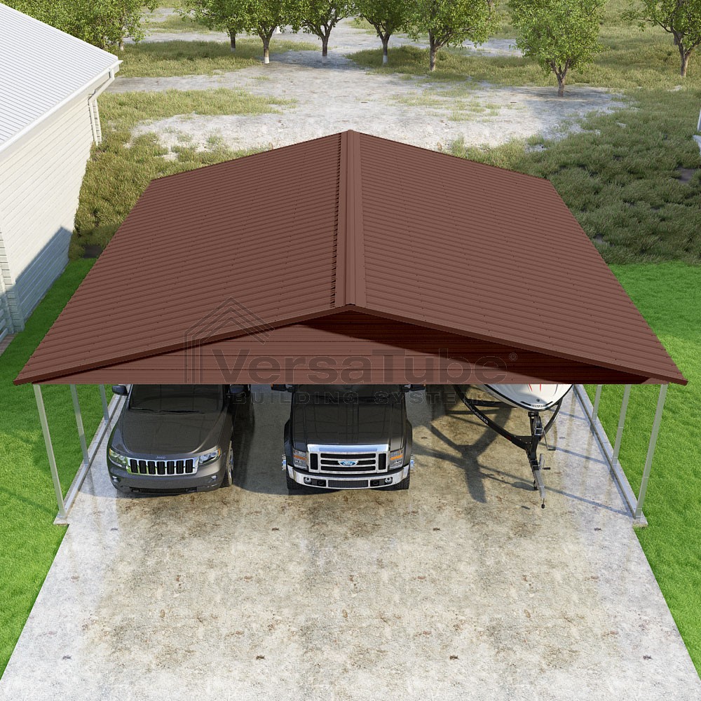 Pinnacle Series DIY carport kit features vertical sheet metal roof panels with ridge cap, gable and eave trim for an A-frame roof style and extended coverage on both ends.
