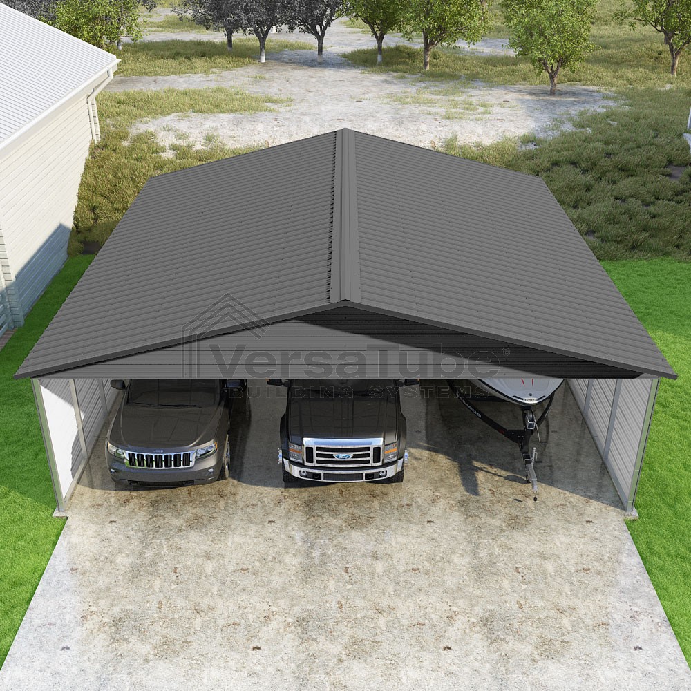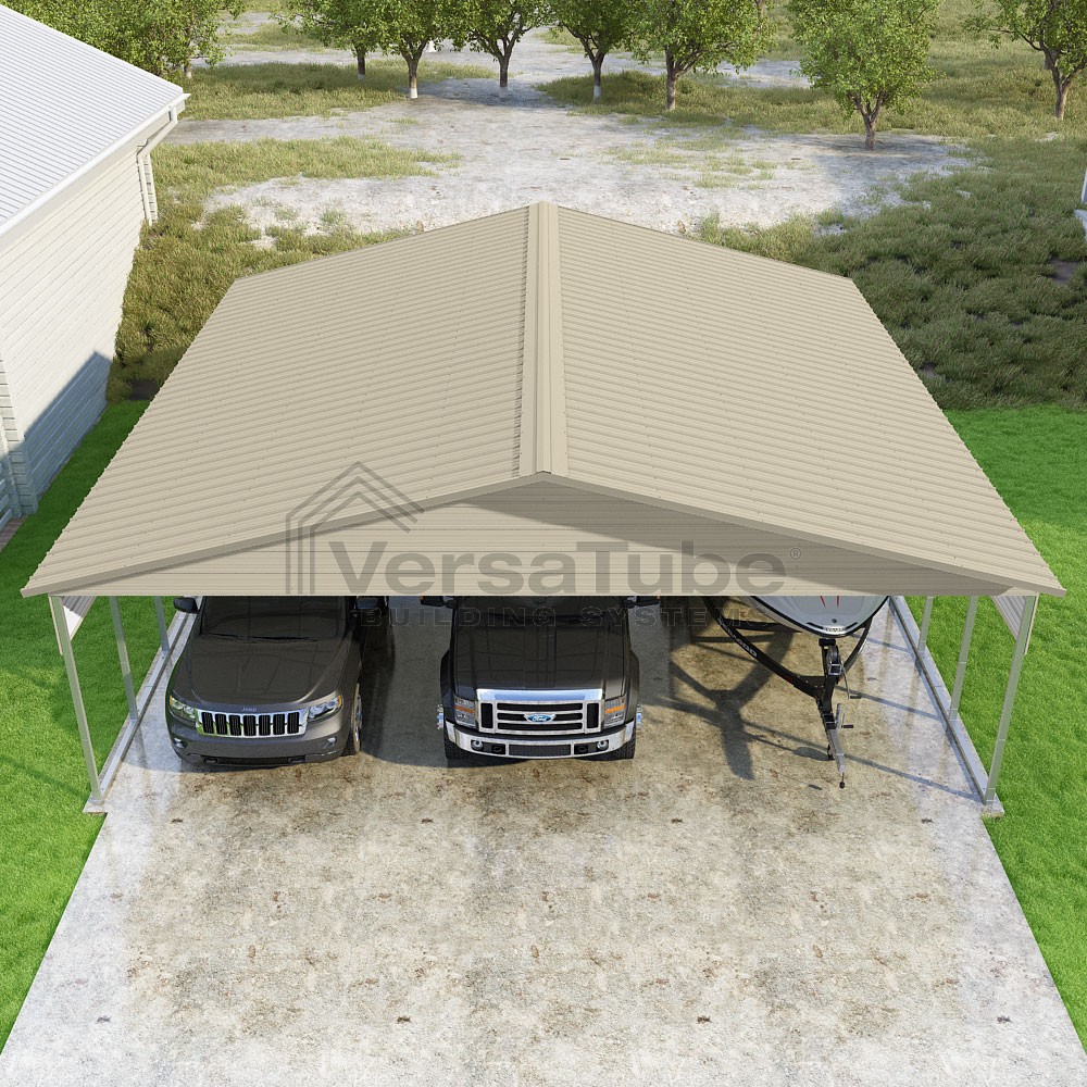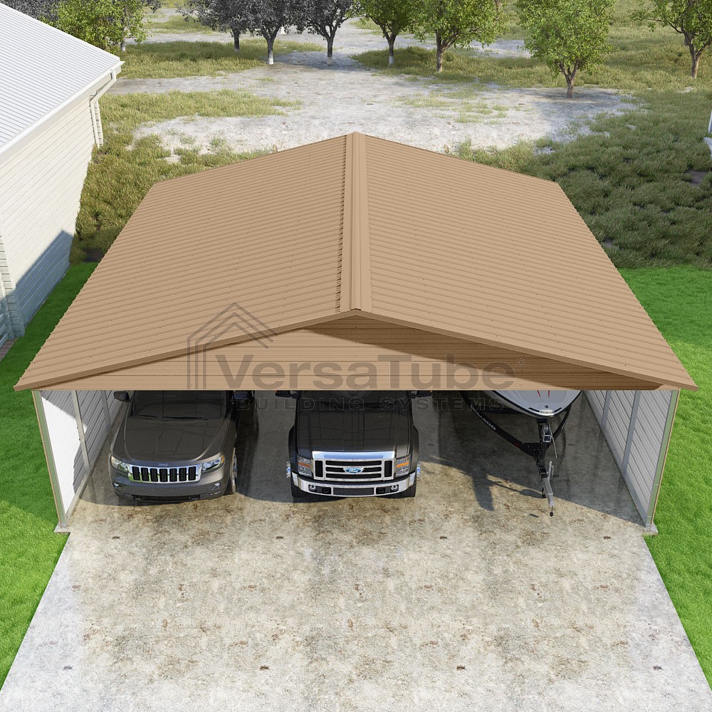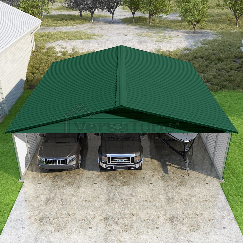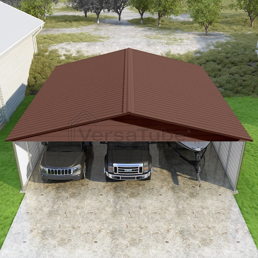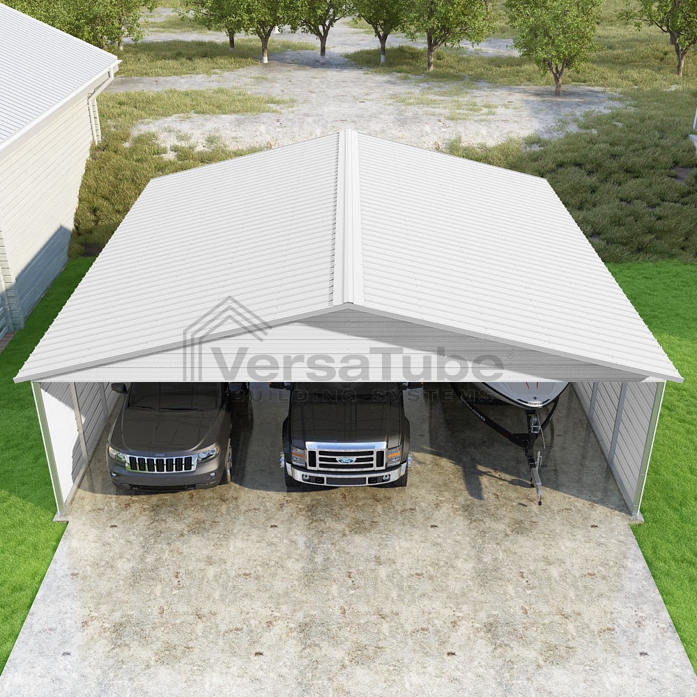 Pinnacle Series DIY carport kit features vertical sheet metal roof panels with ridge cap, gable and eave trim for an A-frame roof style and extended coverage on both ends.