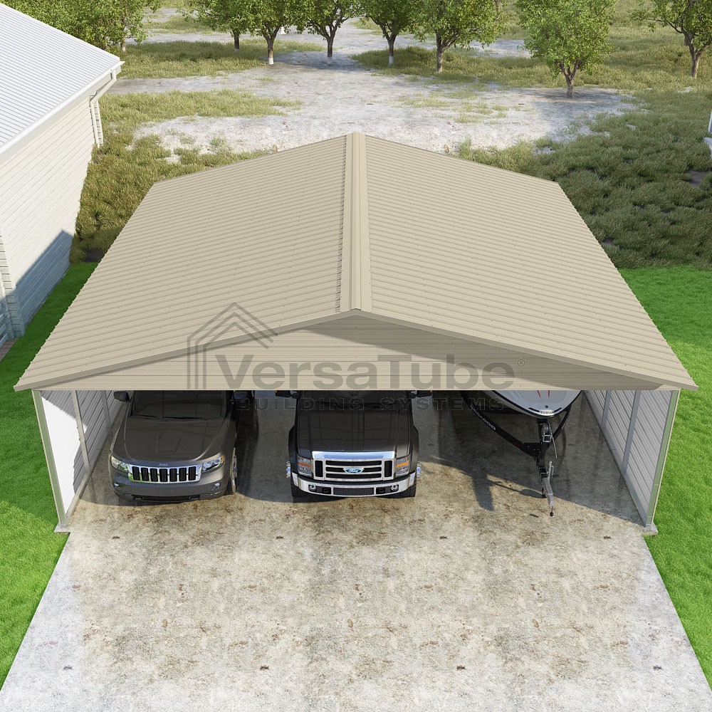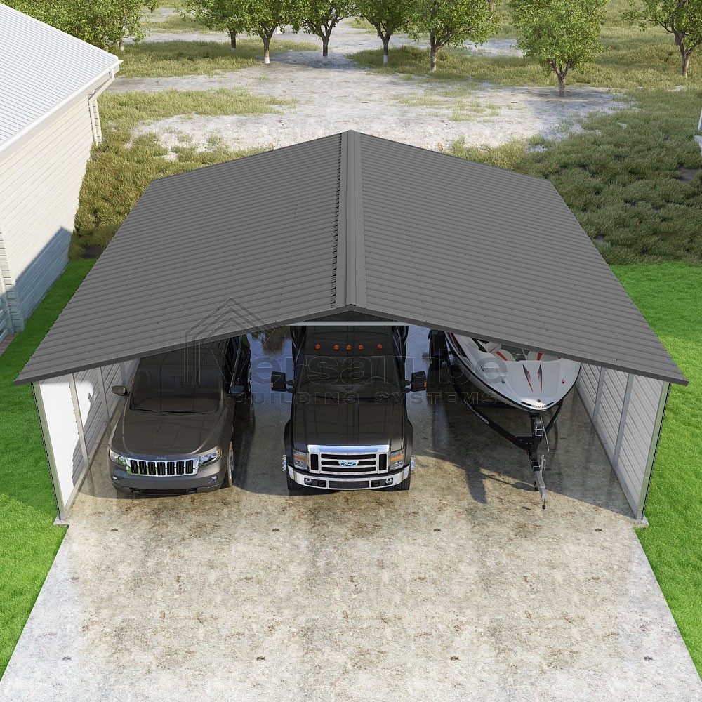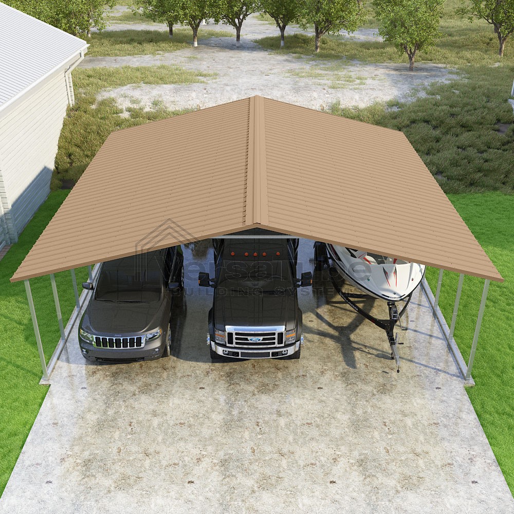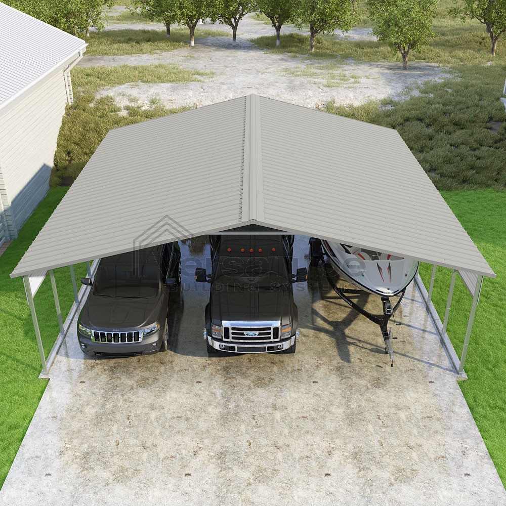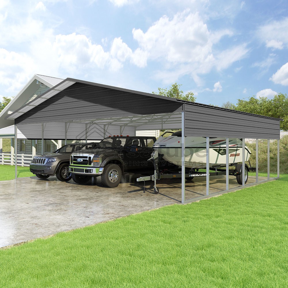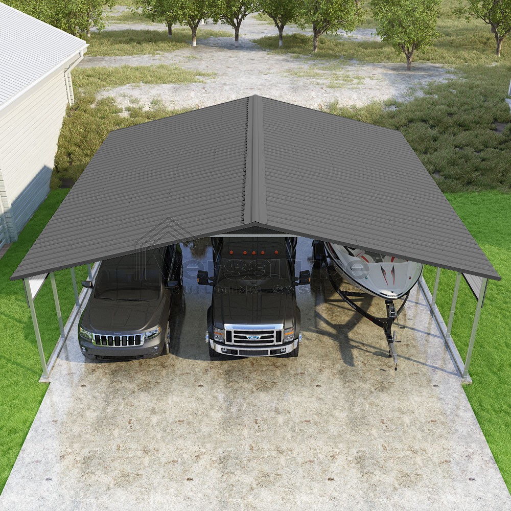 Pinnacle Series DIY carport kit features vertical sheet metal roof panels with ridge cap, gable and eave trim for an A-frame roof style and extended coverage on both ends.