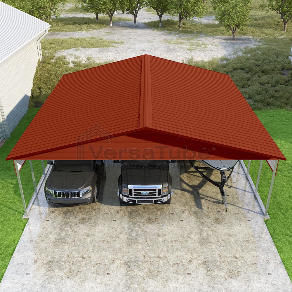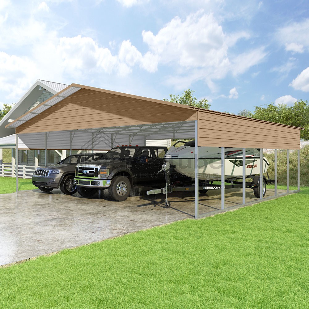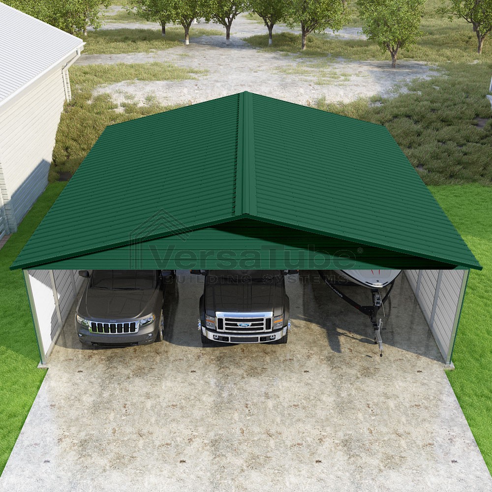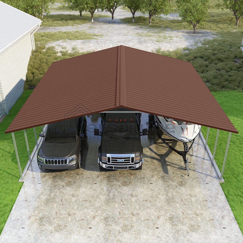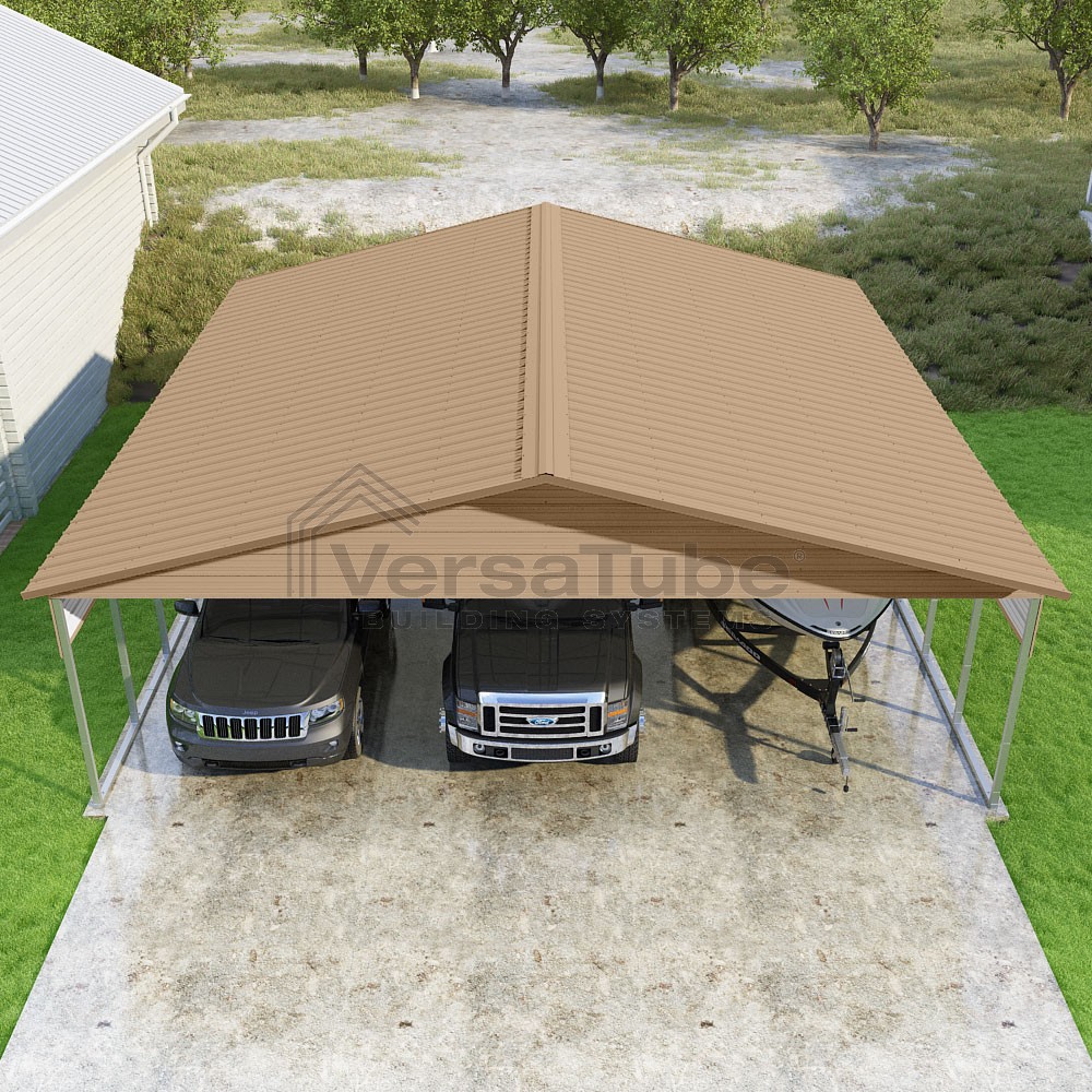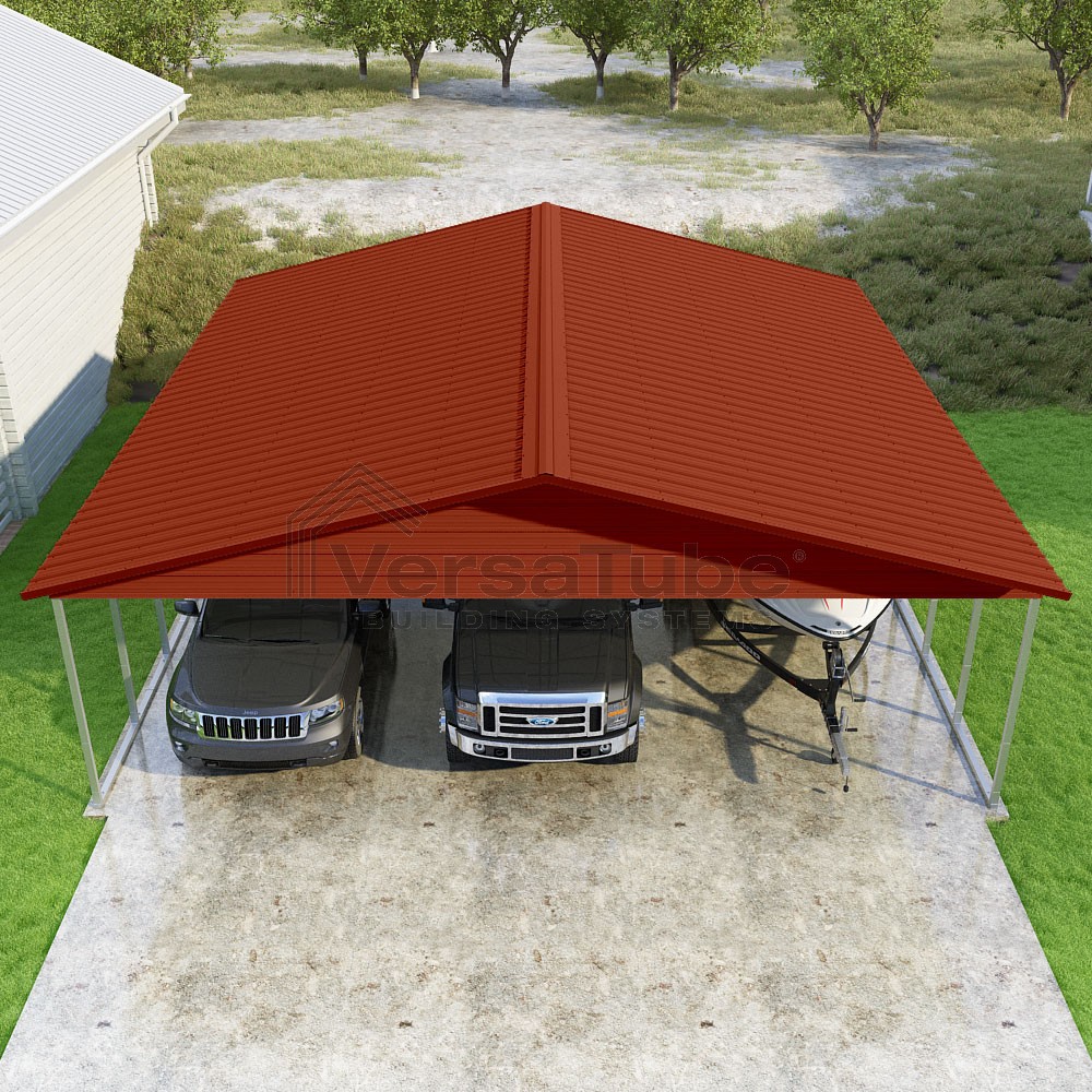 Pinnacle Series DIY carport kit features vertical sheet metal roof panels with ridge cap, gable and eave trim for an A-frame roof style and extended coverage on both ends.