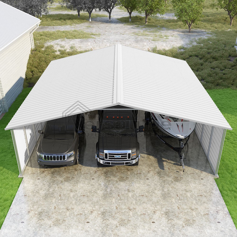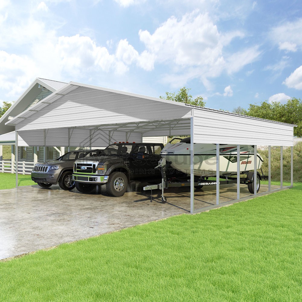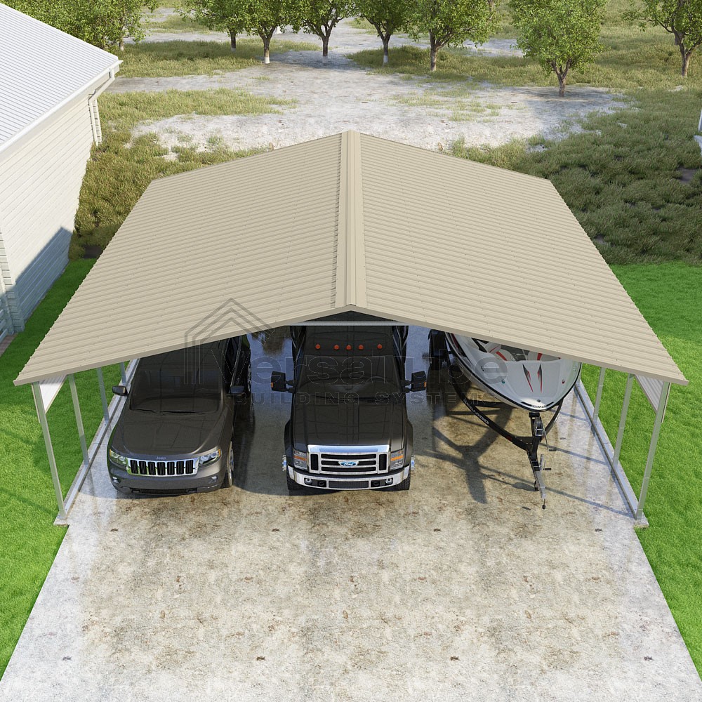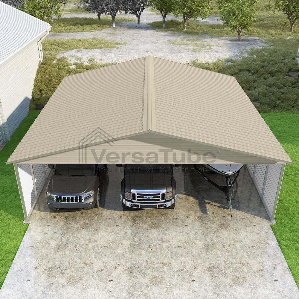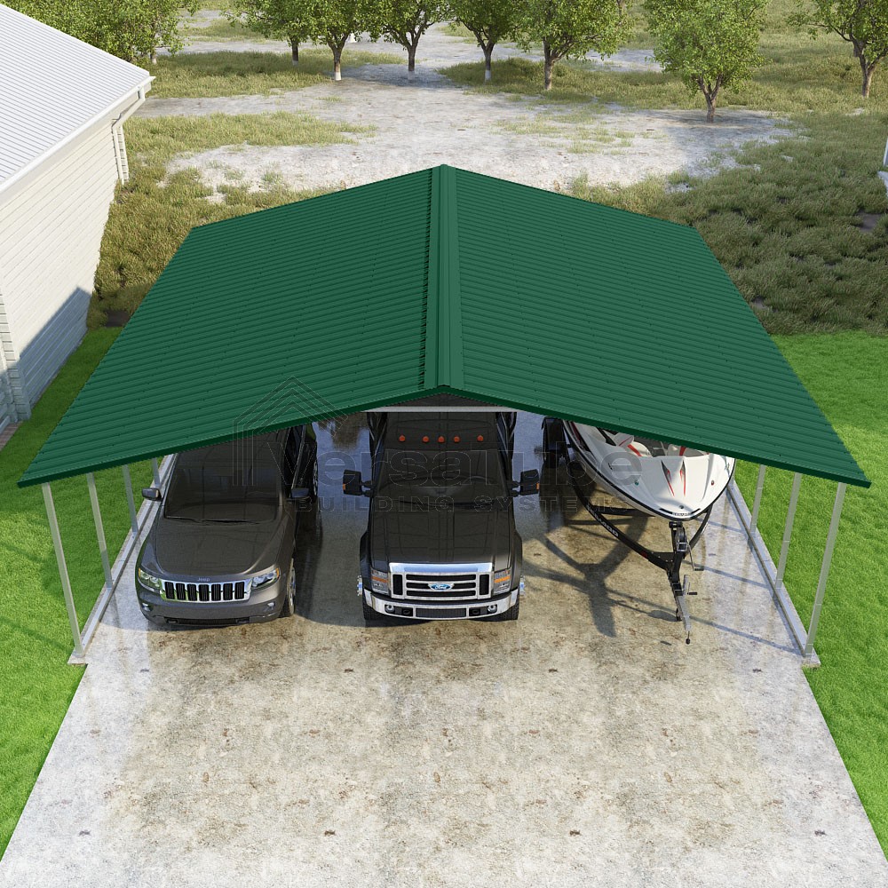 Pinnacle Series DIY carport kit features vertical sheet metal roof panels with ridge cap, gable and eave trim for an A-frame roof style and extended coverage on both ends.