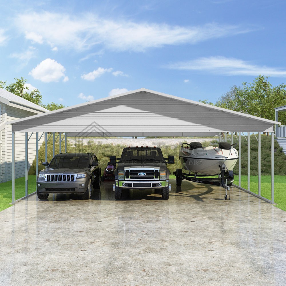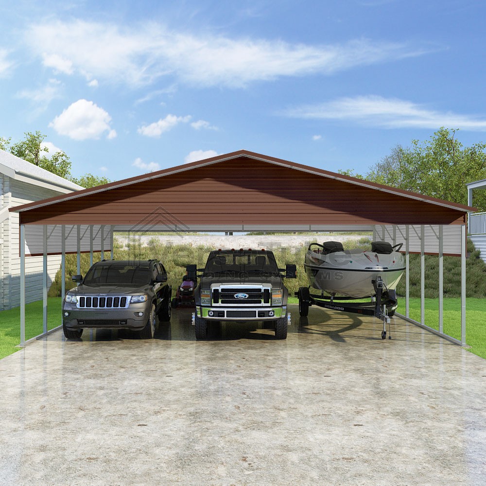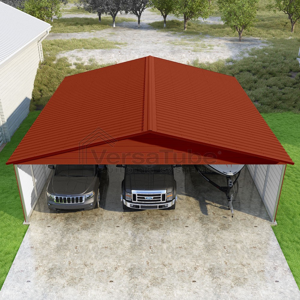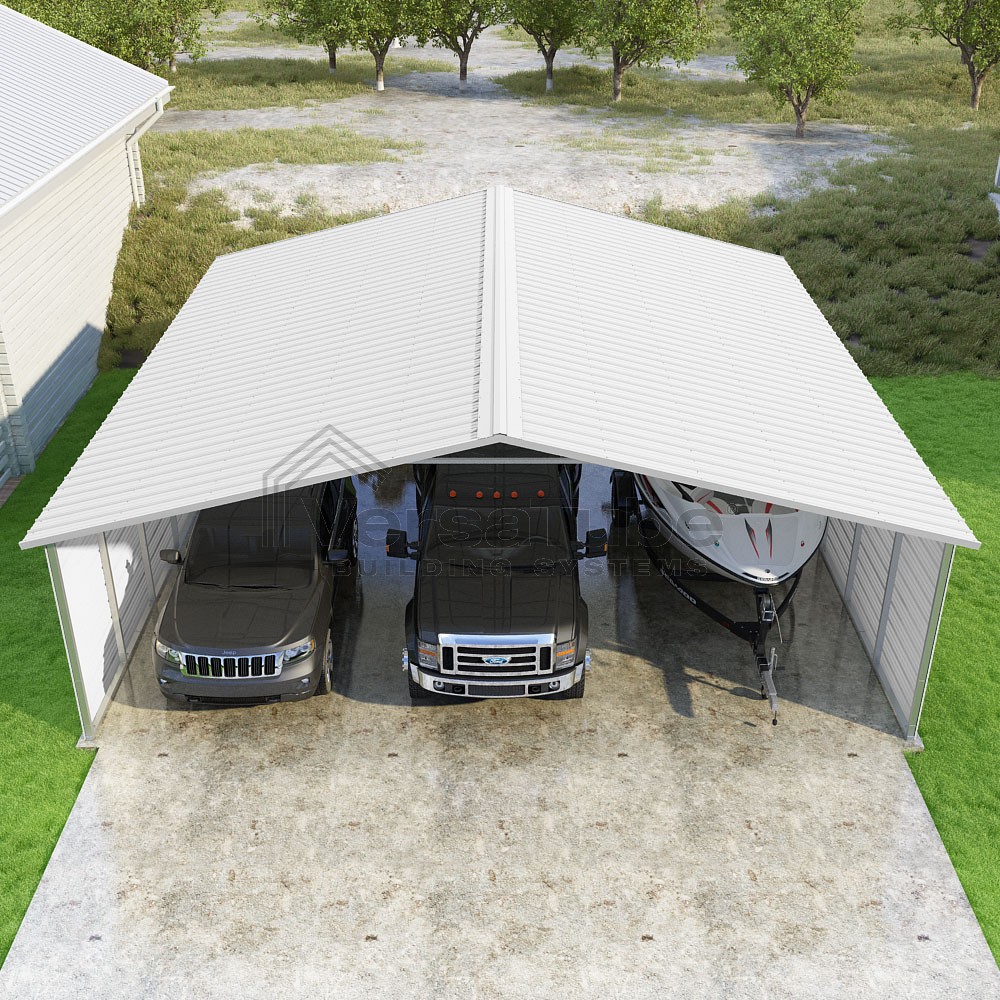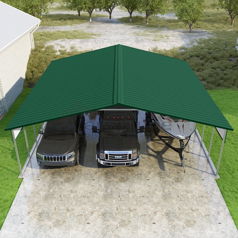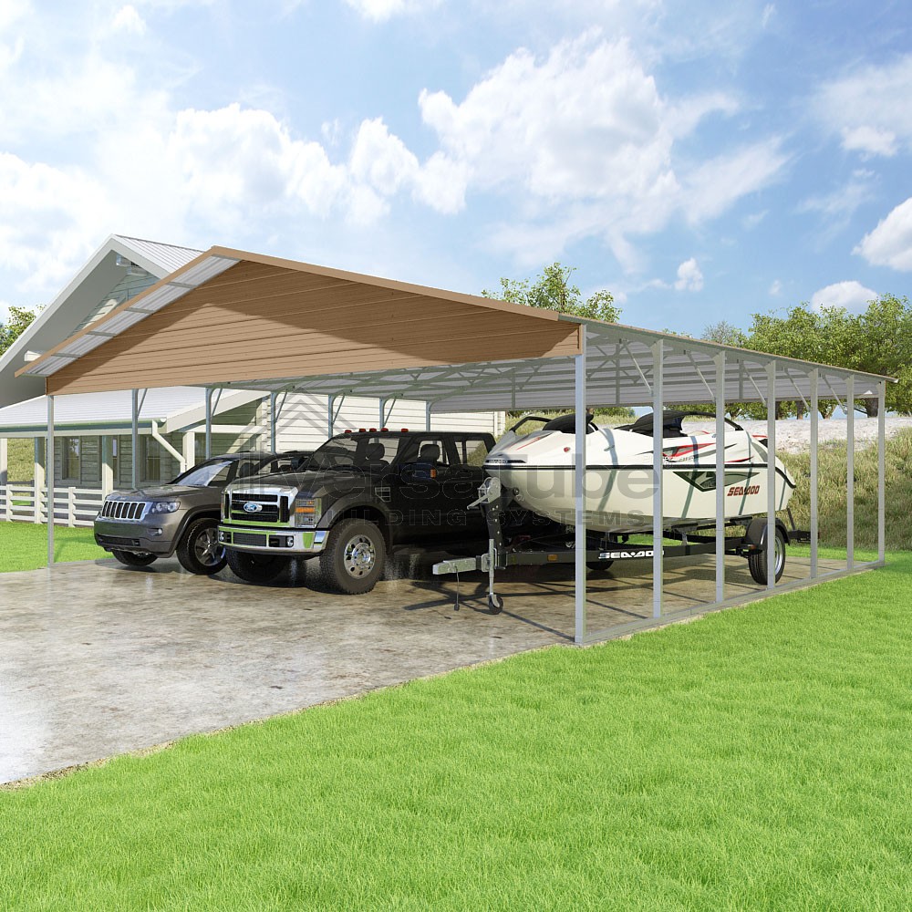 Pinnacle Series DIY carport kit features vertical sheet metal roof panels with ridge cap, gable and eave trim for an A-frame roof style and extended coverage on both ends.