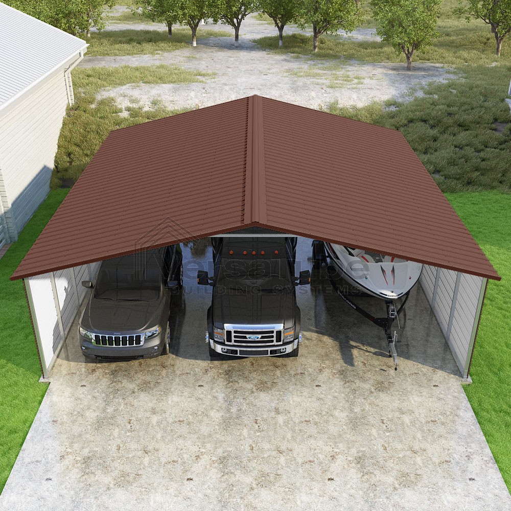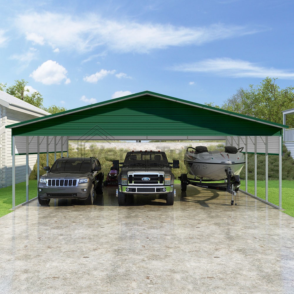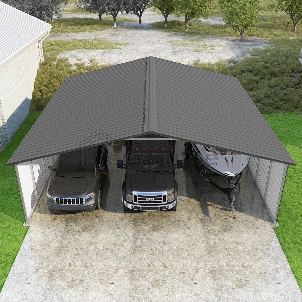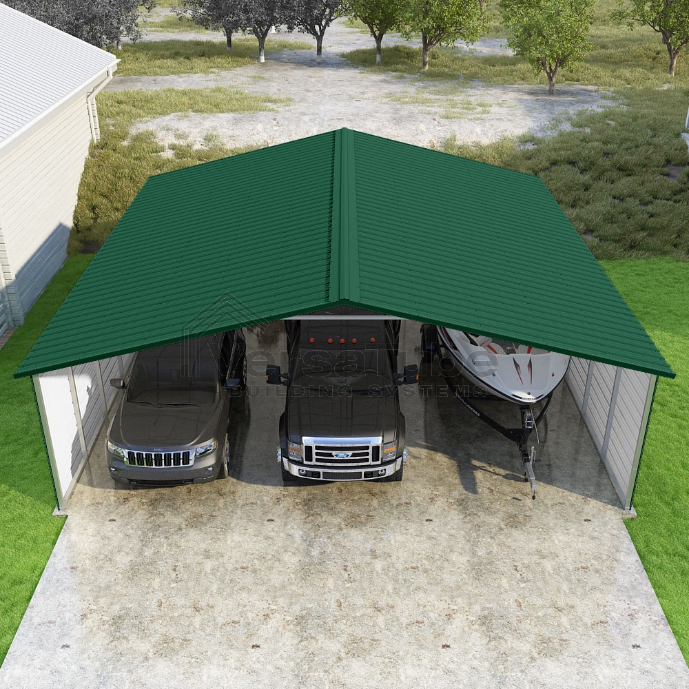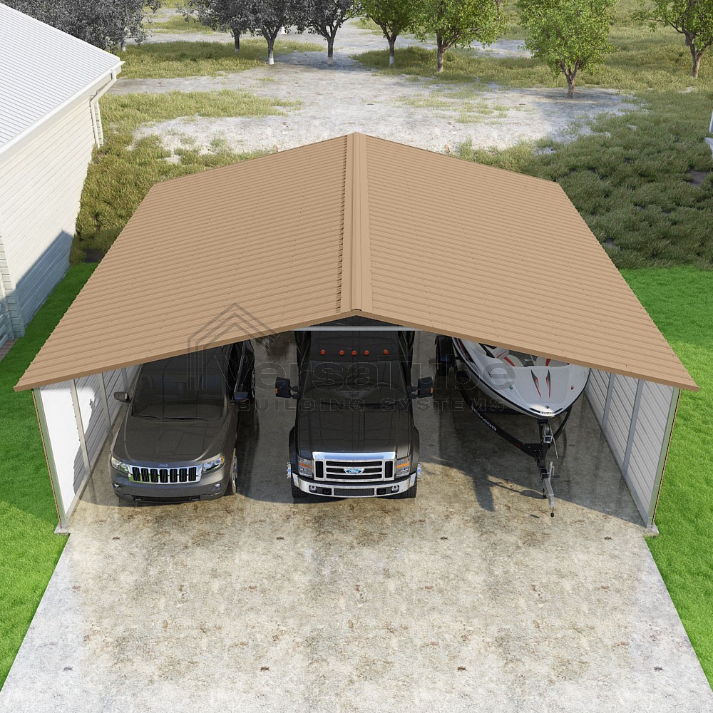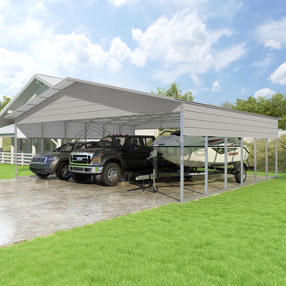 Pinnacle Series DIY carport kit features vertical sheet metal roof panels with ridge cap, gable and eave trim for an A-frame roof style and extended coverage on both ends.
