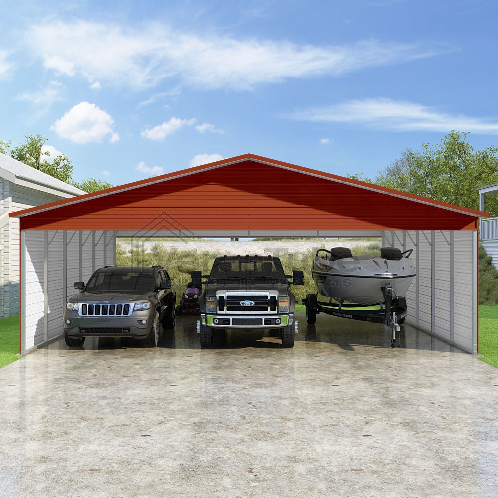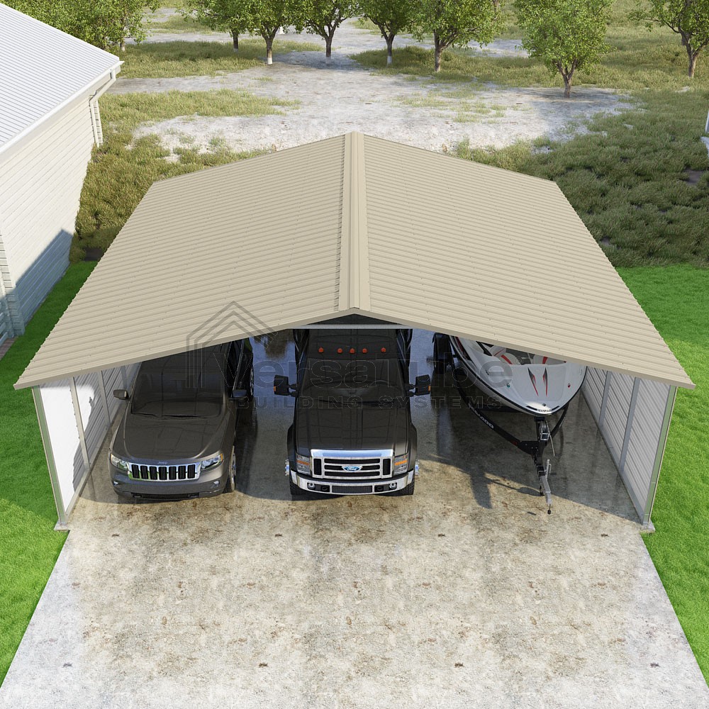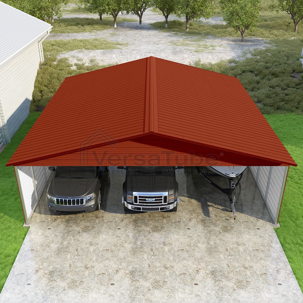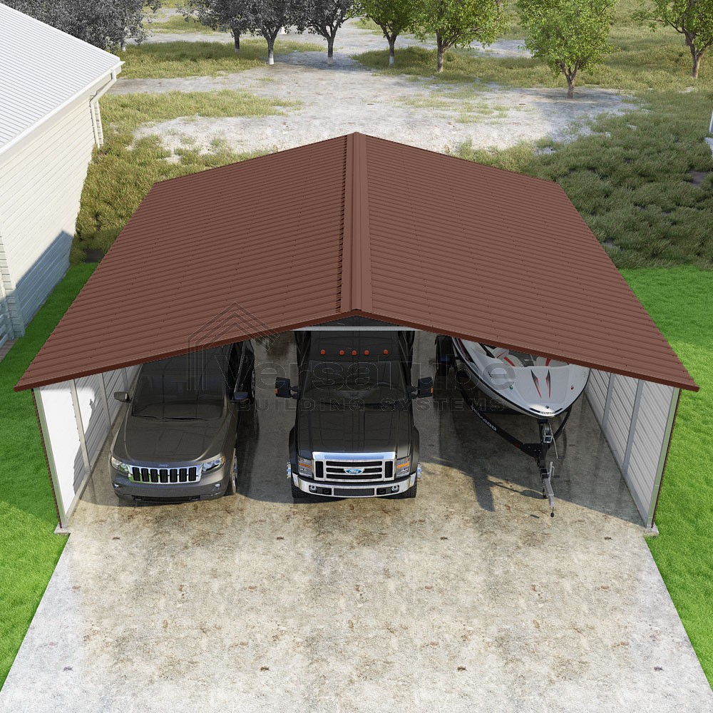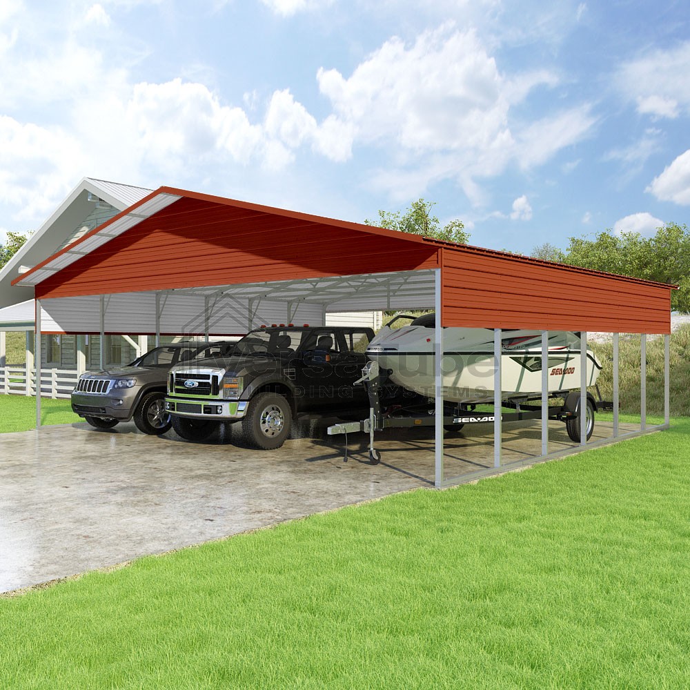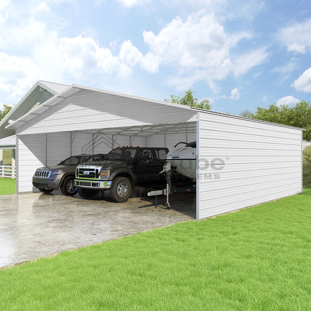 Pinnacle Series DIY carport kit features vertical sheet metal roof panels with ridge cap, gable and eave trim for an A-frame roof style and extended coverage on both ends.