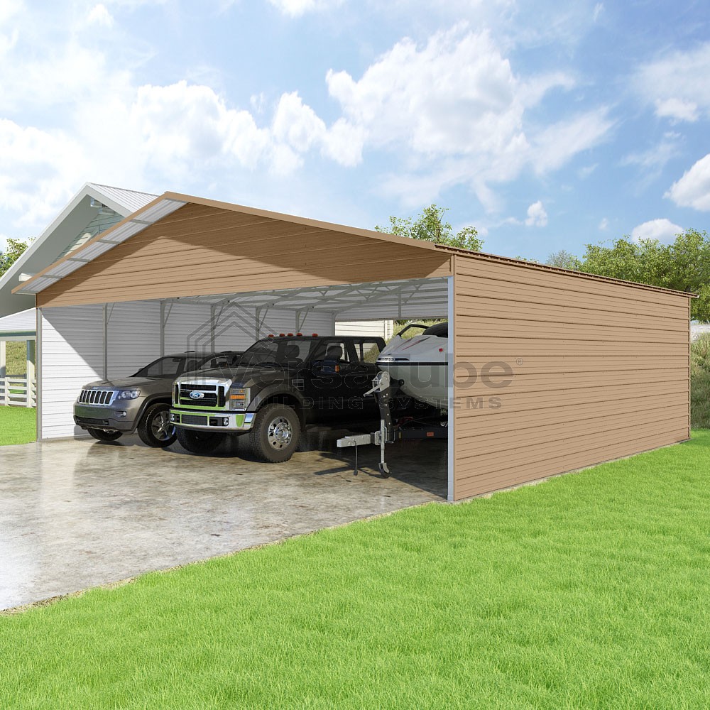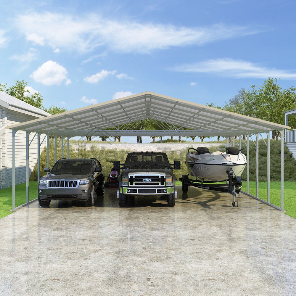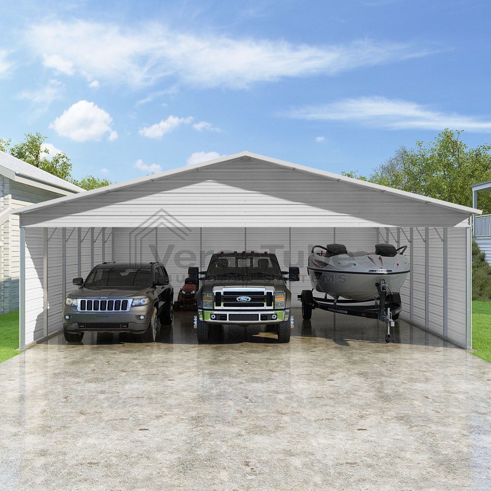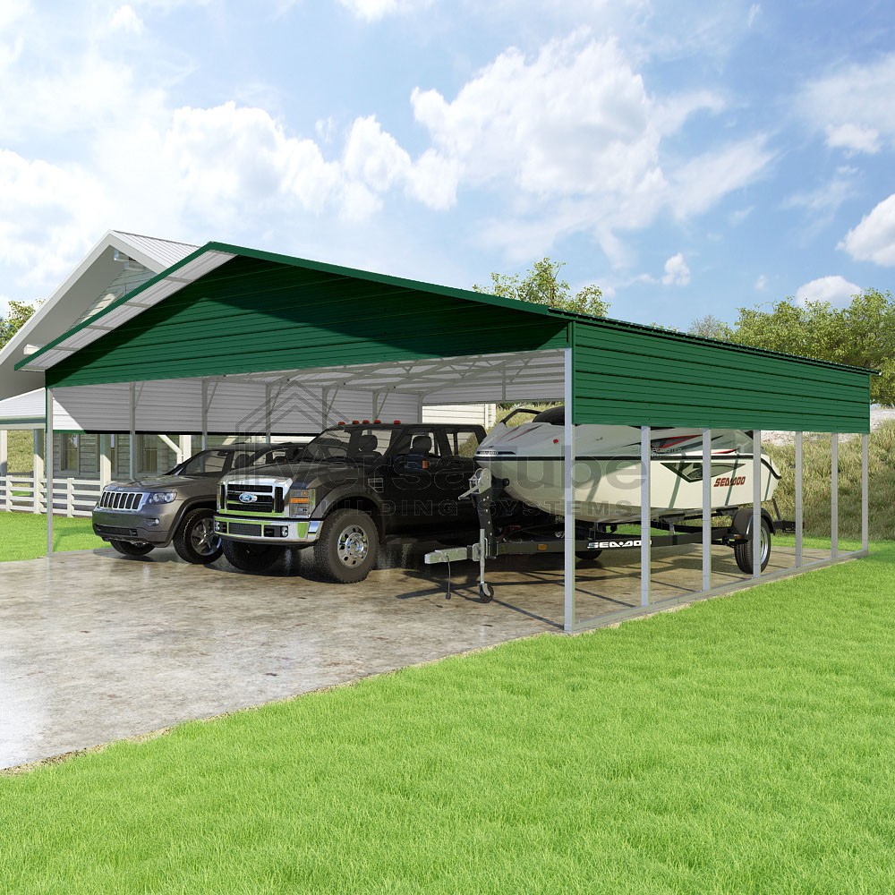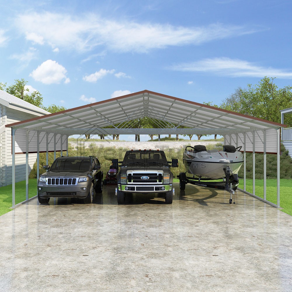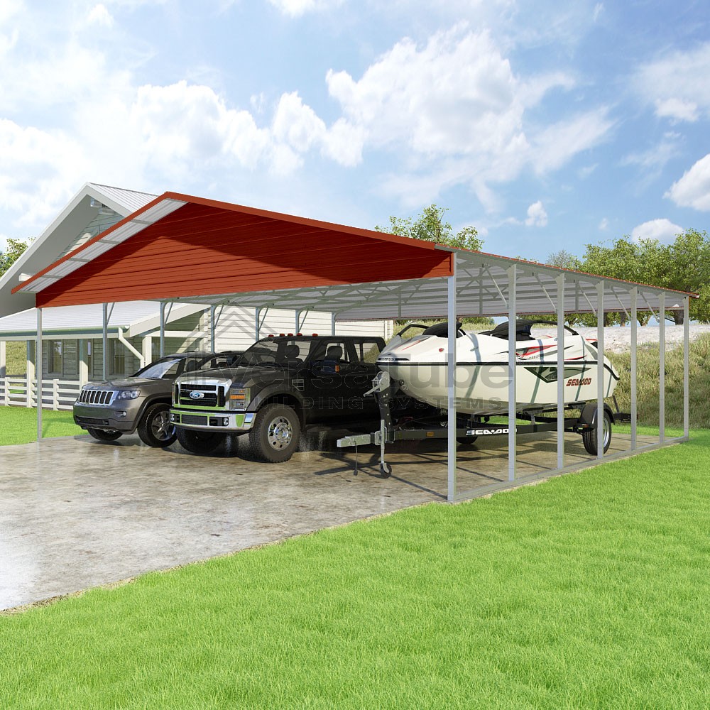Pinnacle Series DIY carport kit features vertical sheet metal roof panels with ridge cap, gable and eave trim for an A-frame roof style and extended coverage on both ends.