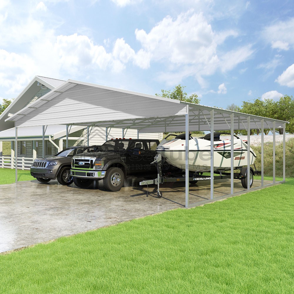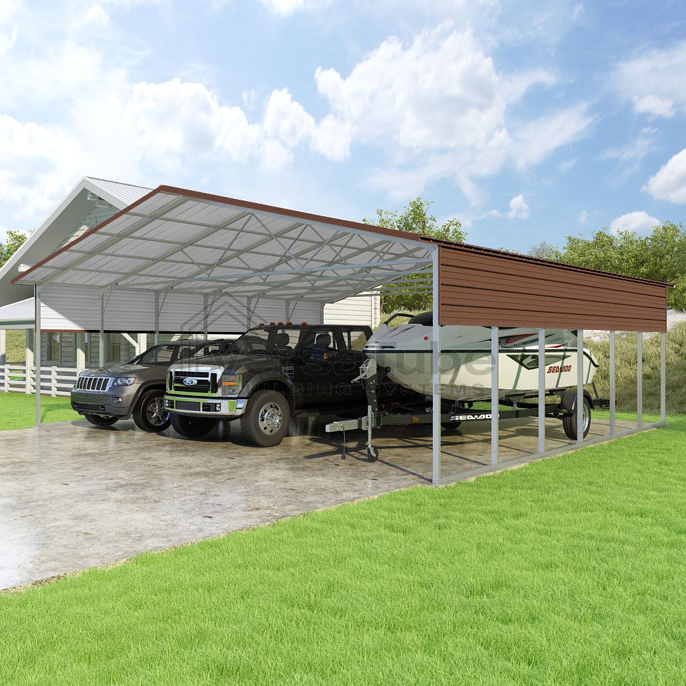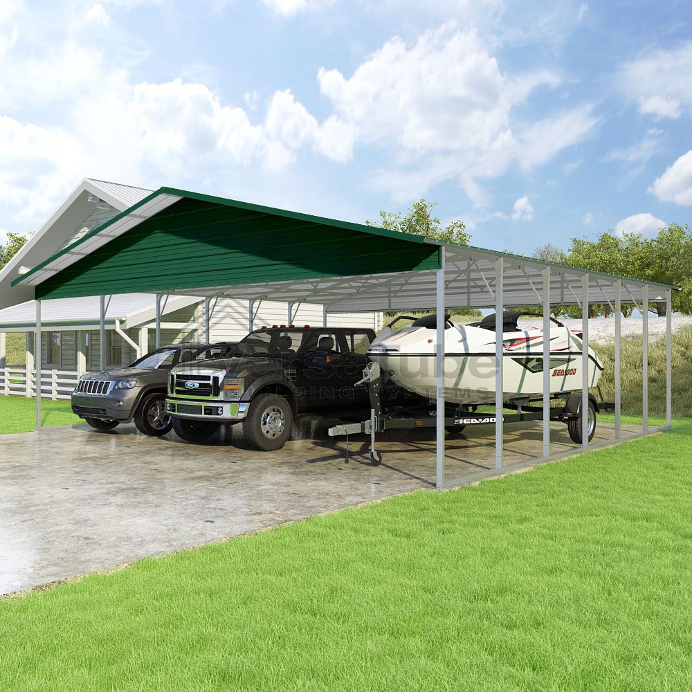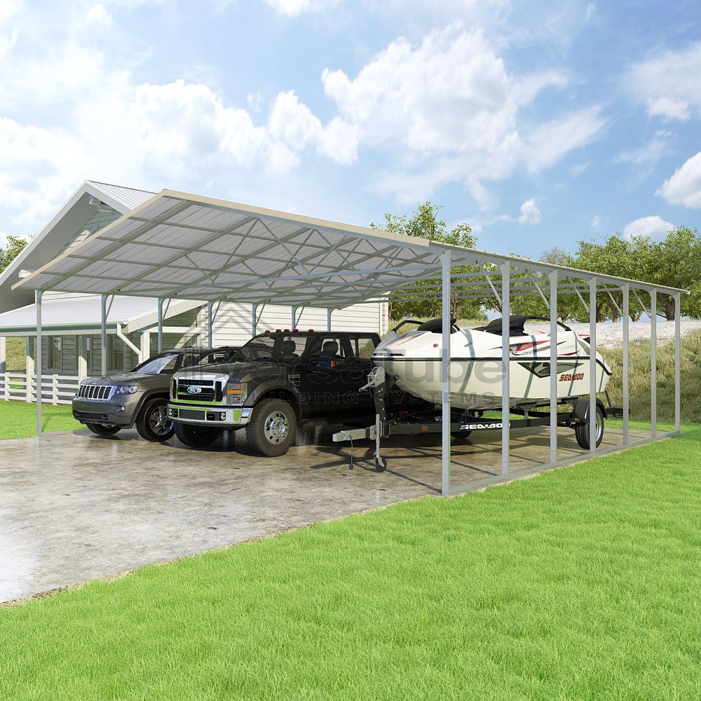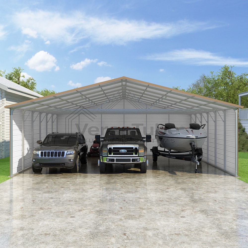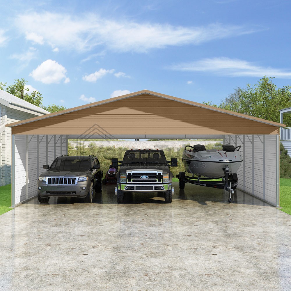 Pinnacle Series DIY carport kit features vertical sheet metal roof panels with ridge cap, gable and eave trim for an A-frame roof style and extended coverage on both ends.