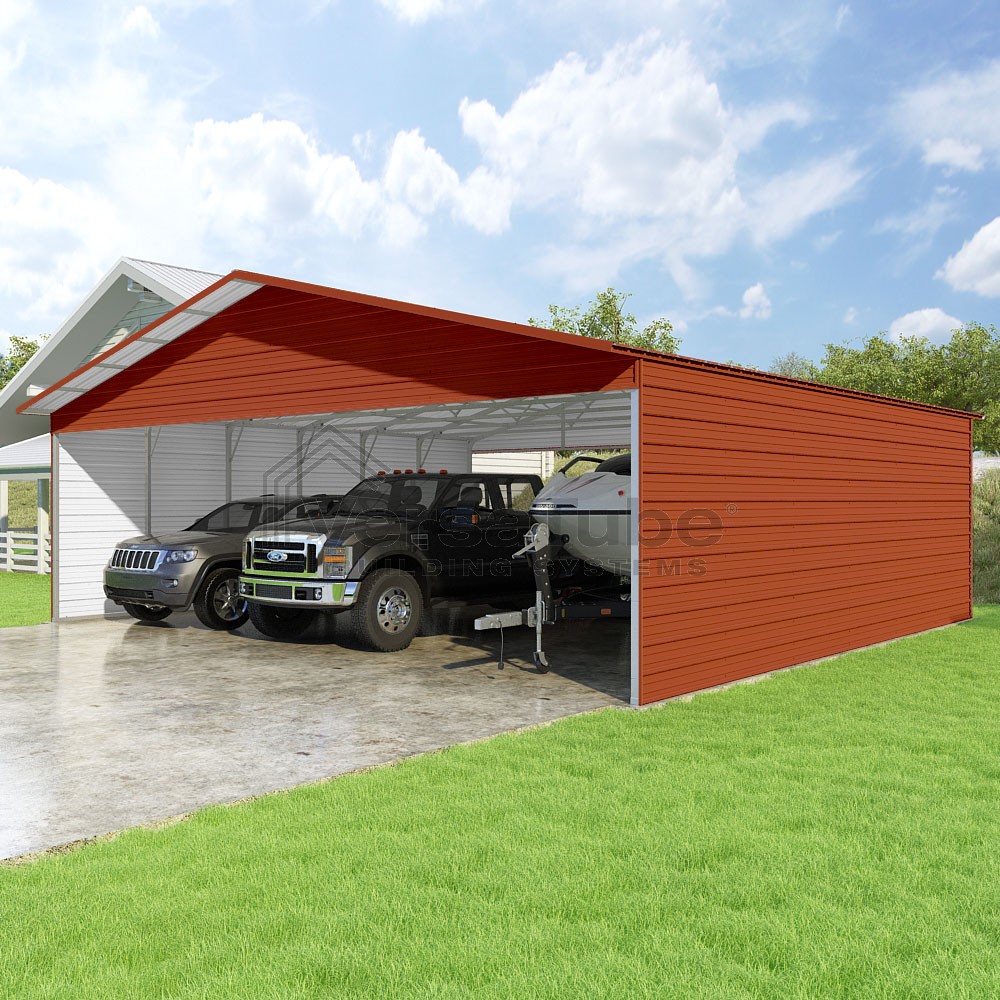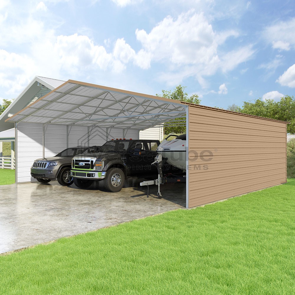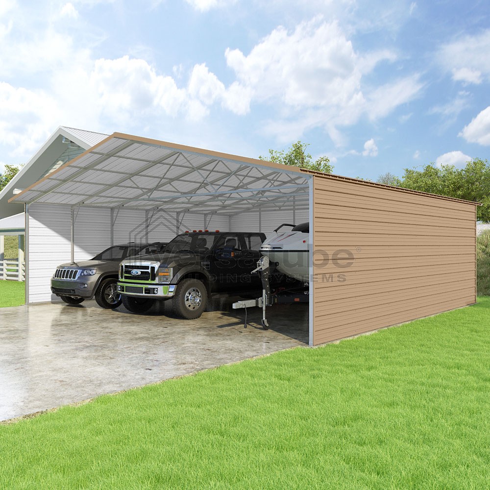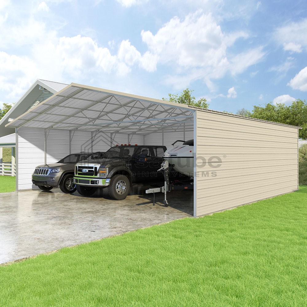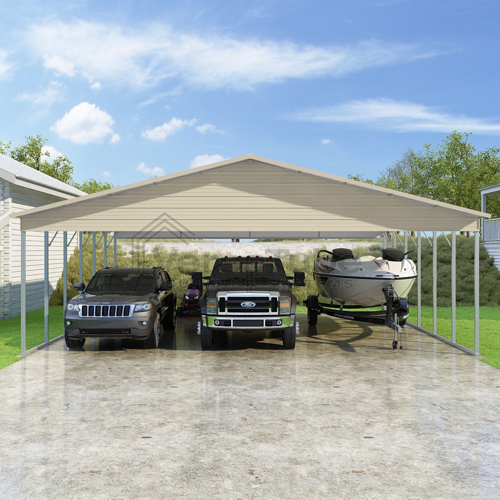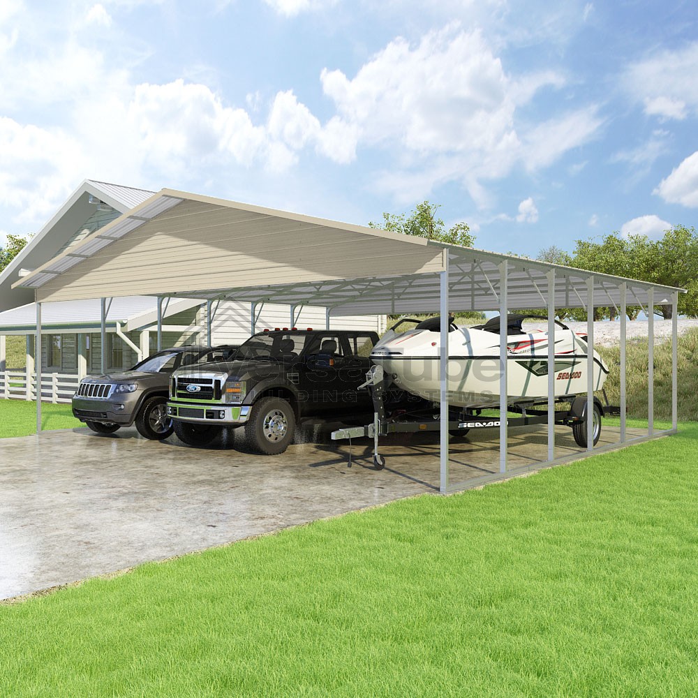 Pinnacle Series DIY carport kit features vertical sheet metal roof panels with ridge cap, gable and eave trim for an A-frame roof style and extended coverage on both ends.