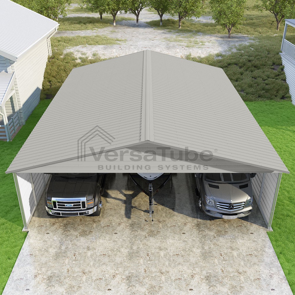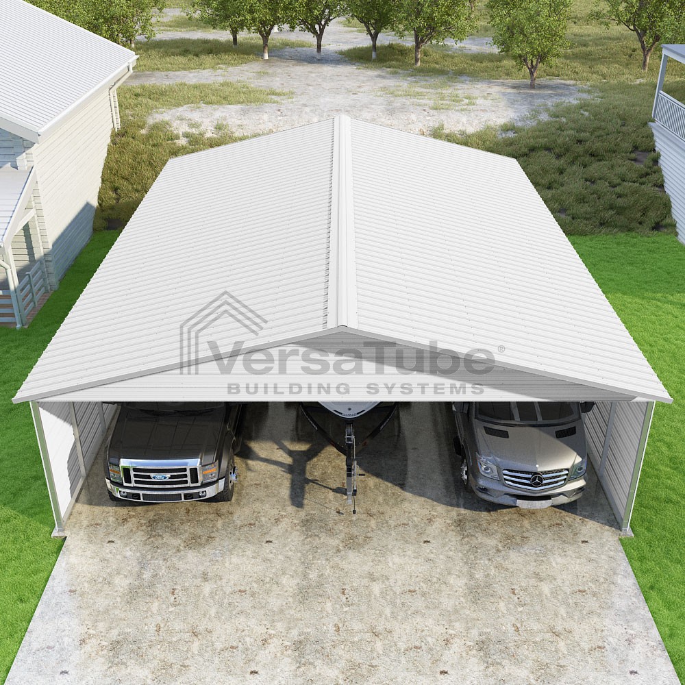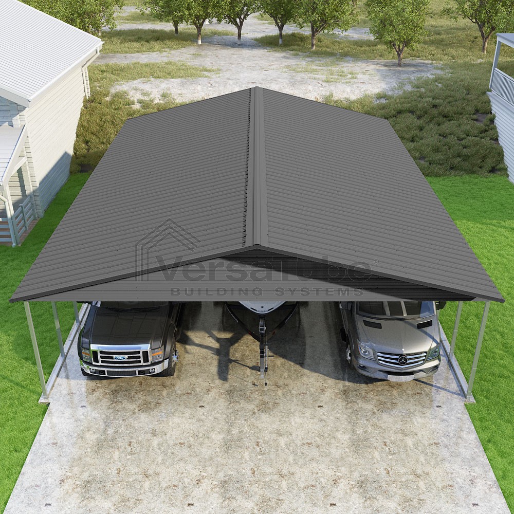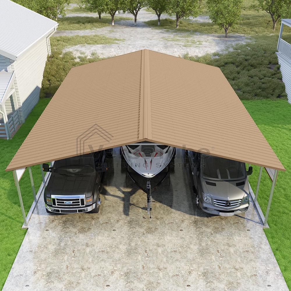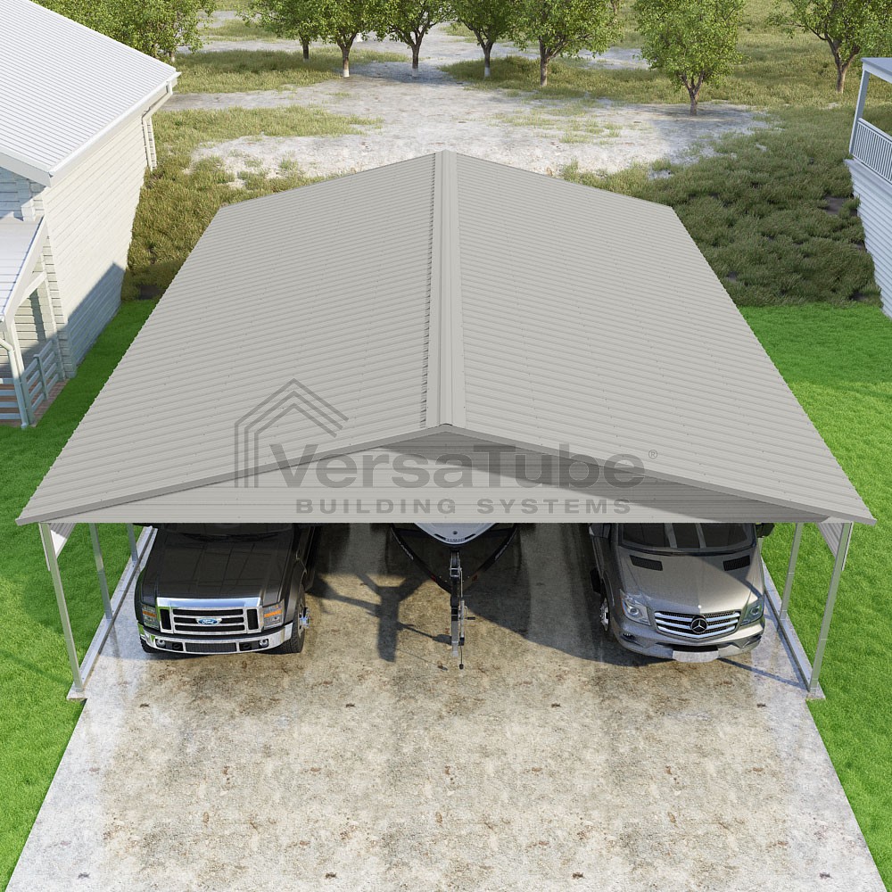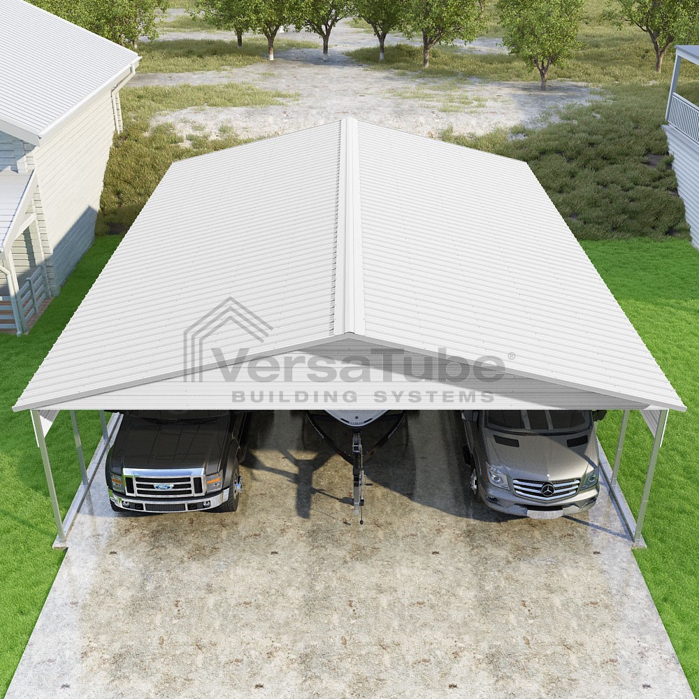 Pinnacle Series DIY carport kit features vertical sheet metal roof panels with ridge cap, gable and eave trim for an A-frame roof style and extended coverage on both ends.