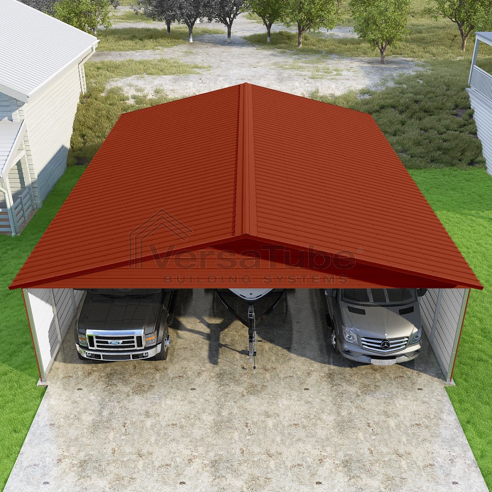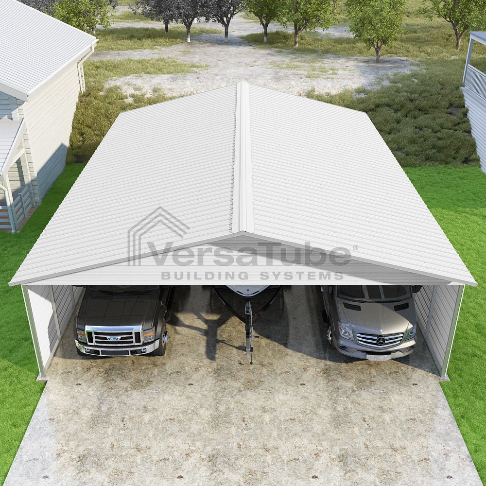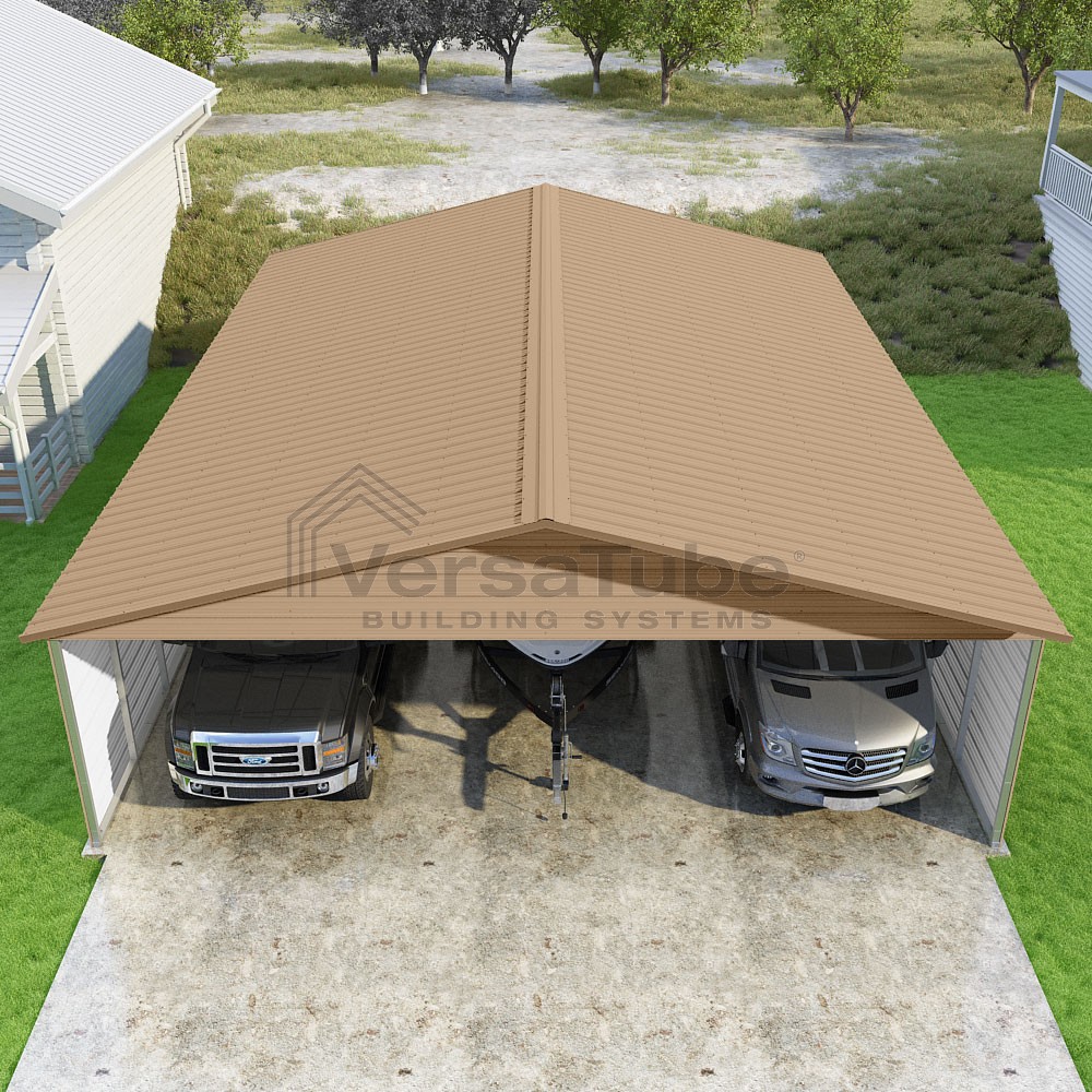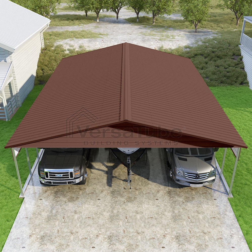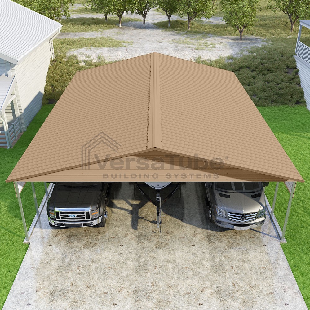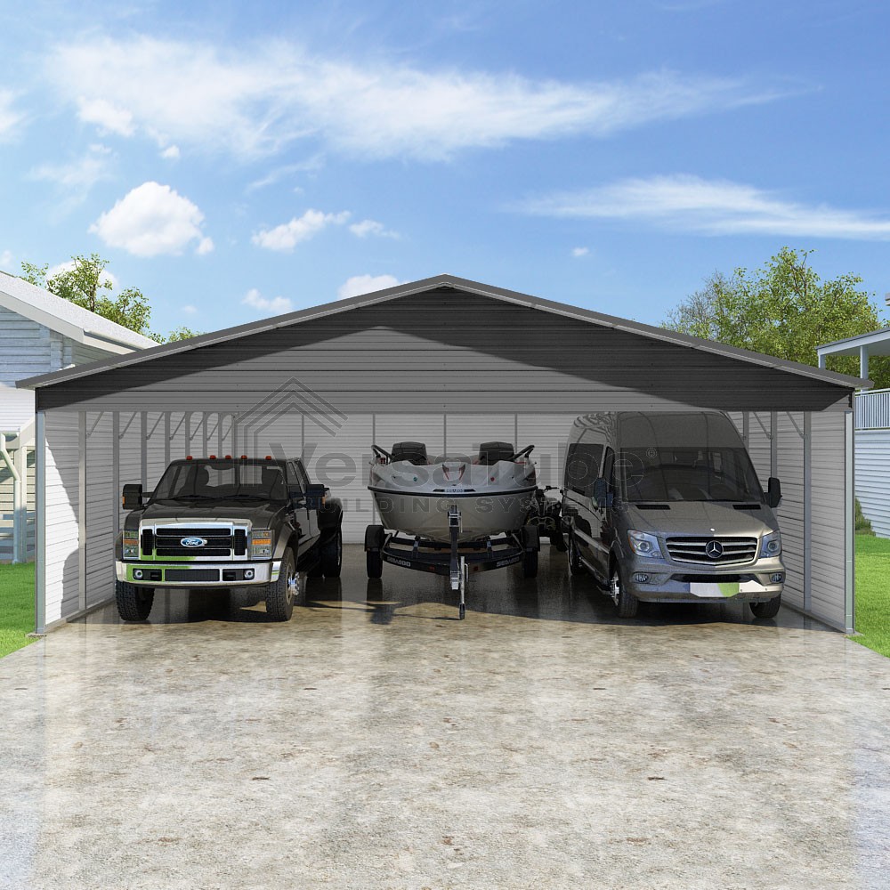 Pinnacle Series DIY carport kit features vertical sheet metal roof panels with ridge cap, gable and eave trim for an A-frame roof style and extended coverage on both ends.