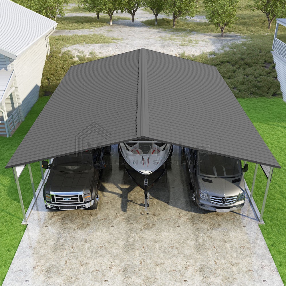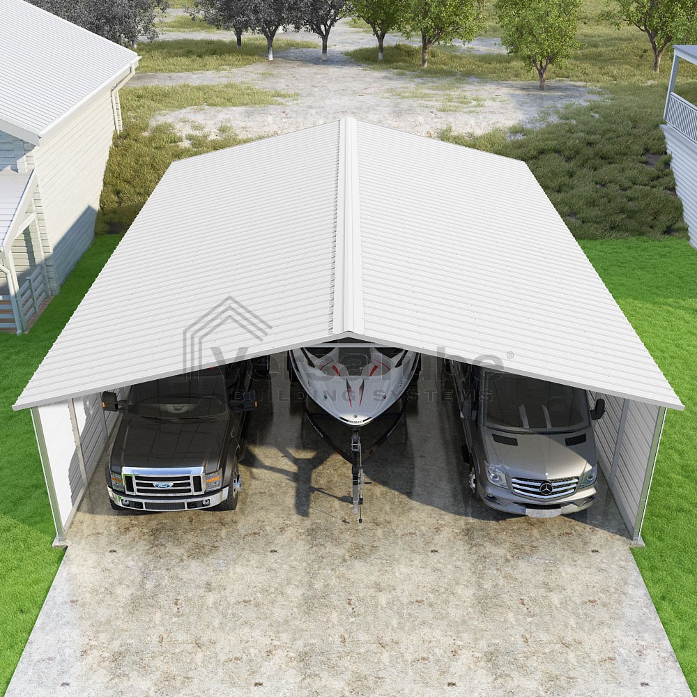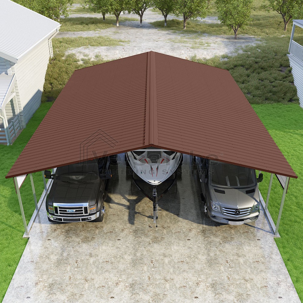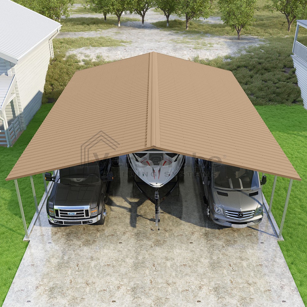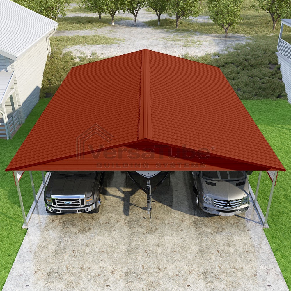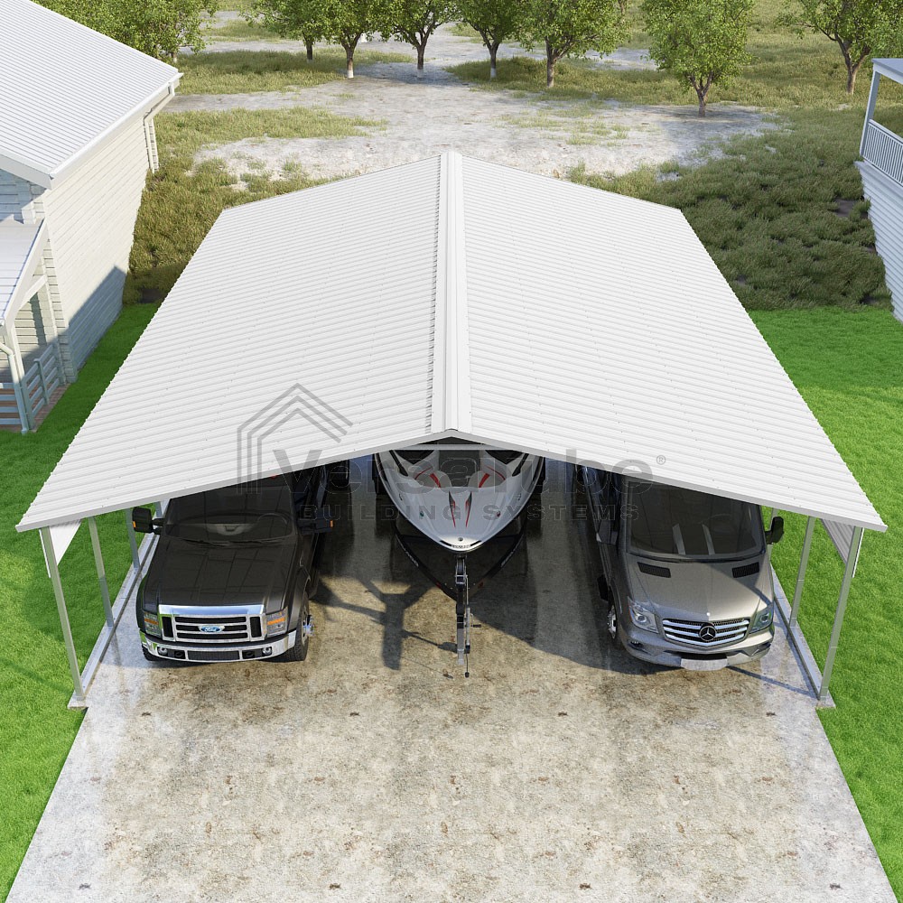 Pinnacle Series DIY carport kit features vertical sheet metal roof panels with ridge cap, gable and eave trim for an A-frame roof style and extended coverage on both ends.