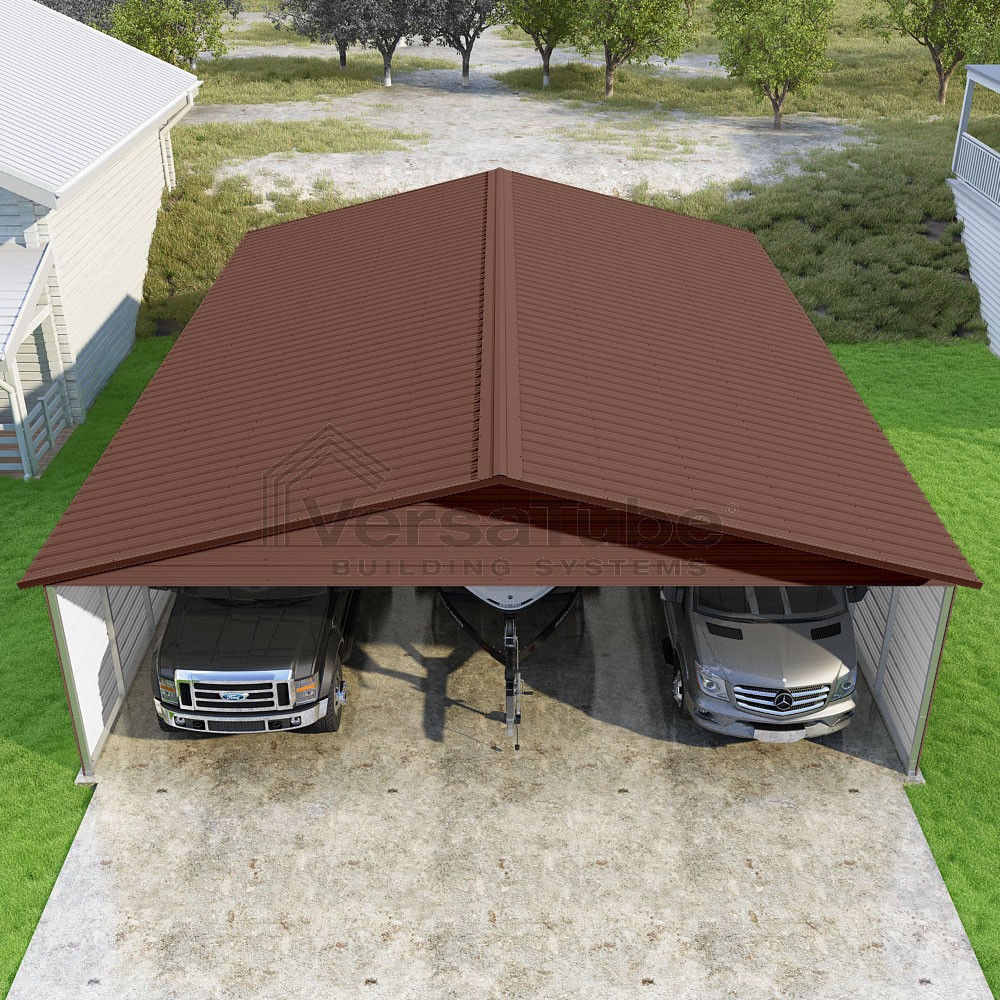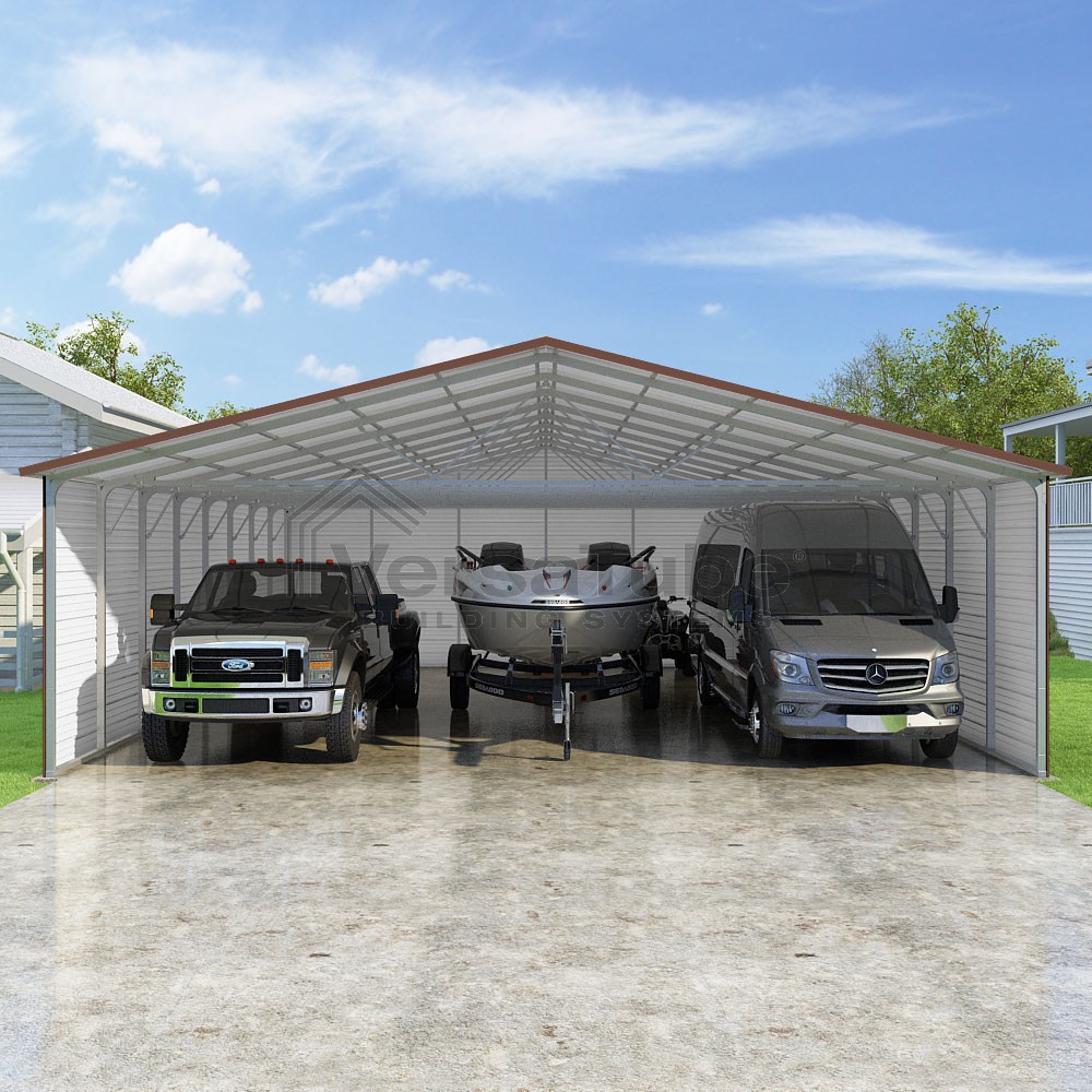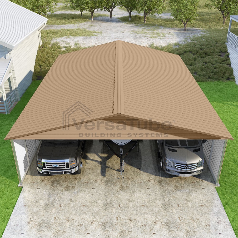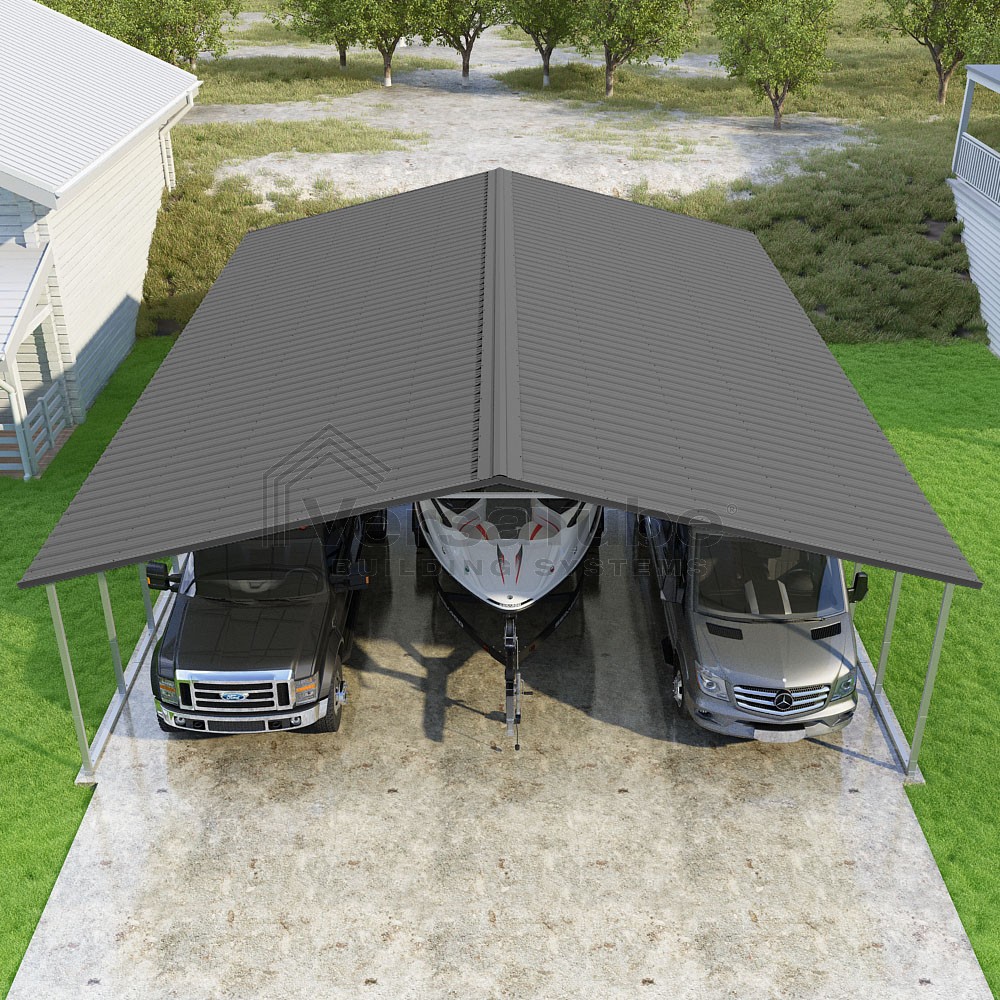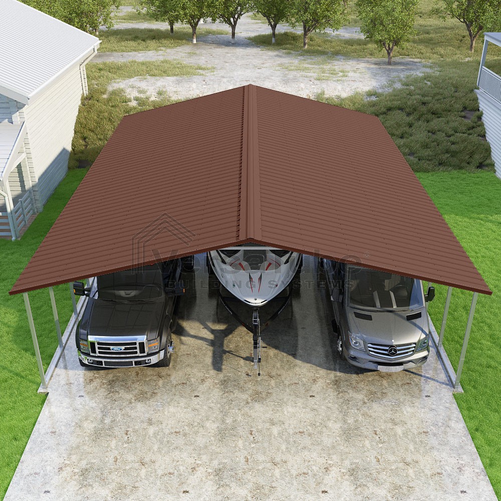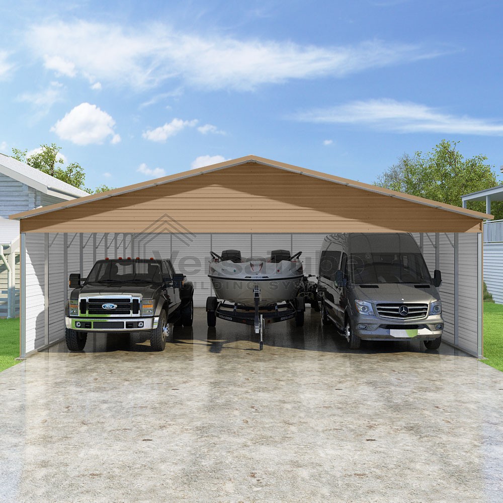 Pinnacle Series DIY carport kit features vertical sheet metal roof panels with ridge cap, gable and eave trim for an A-frame roof style and extended coverage on both ends.
