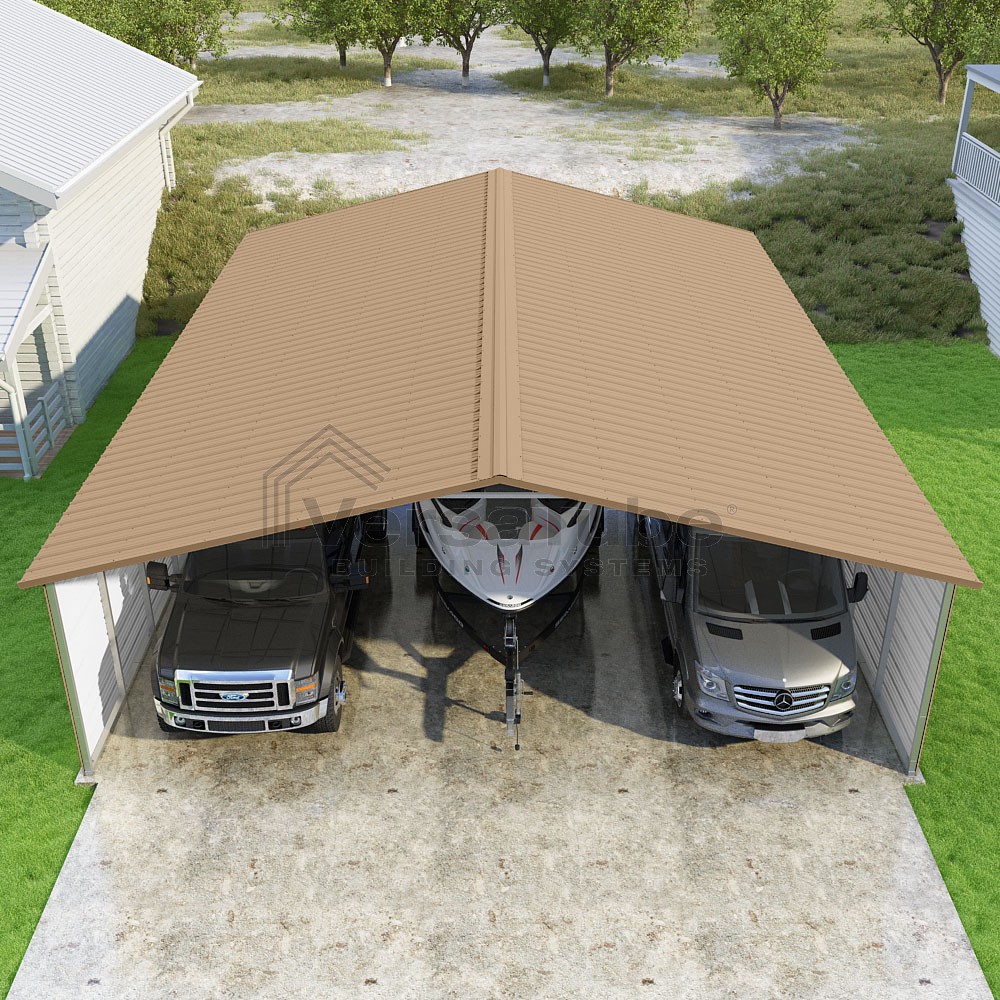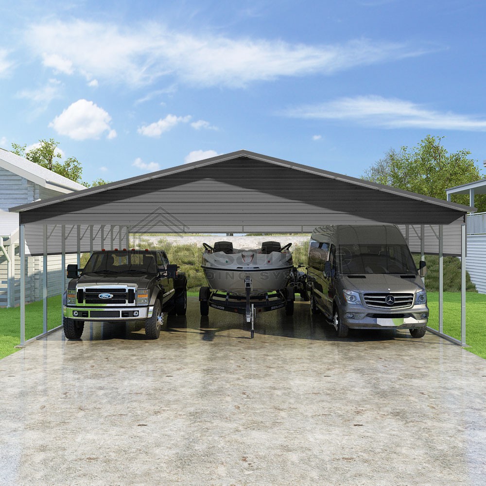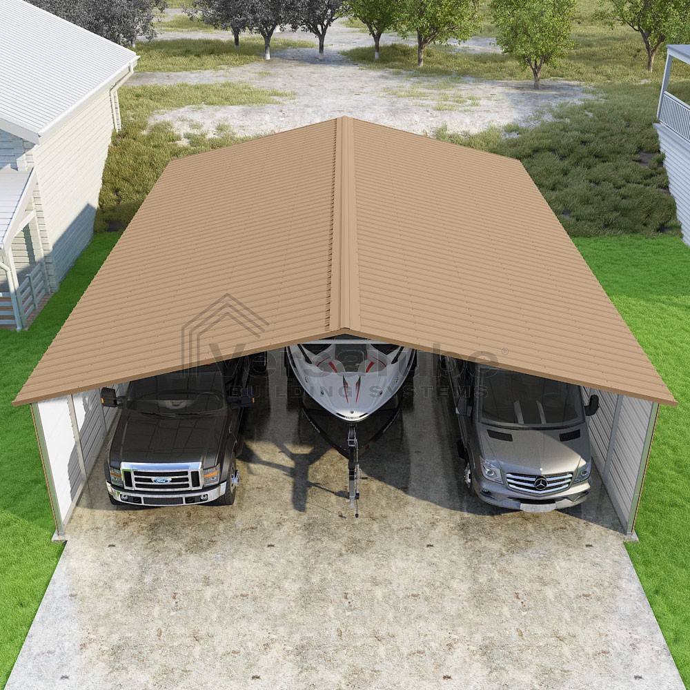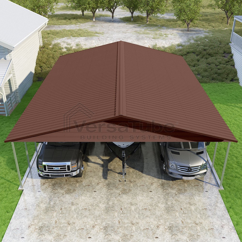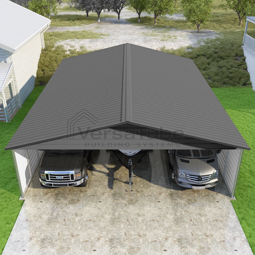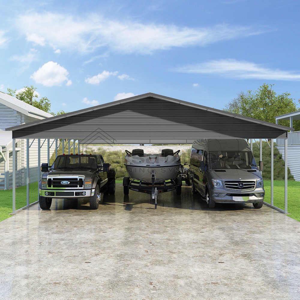 Pinnacle Series DIY carport kit features vertical sheet metal roof panels with ridge cap, gable and eave trim for an A-frame roof style and extended coverage on both ends.