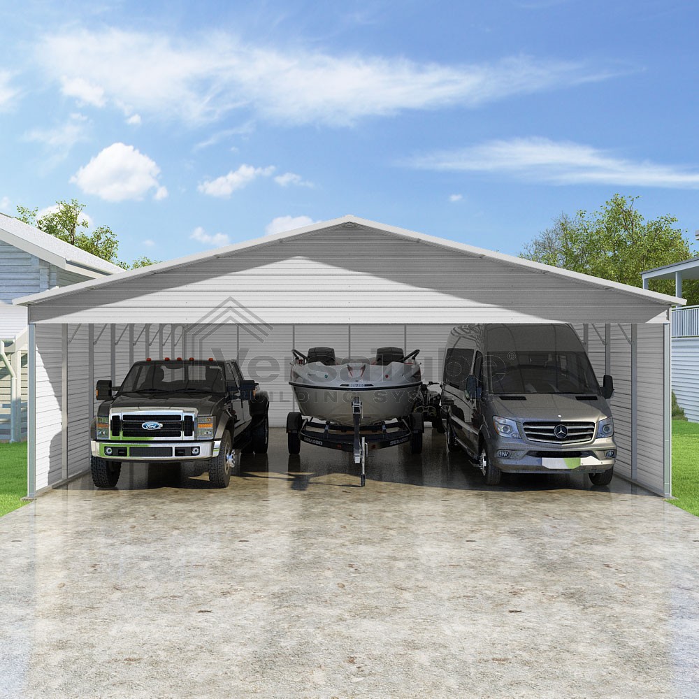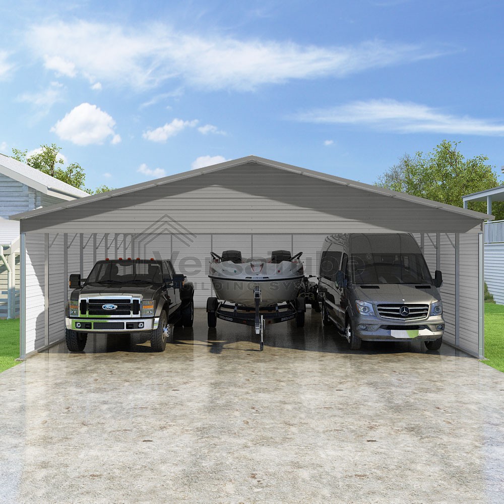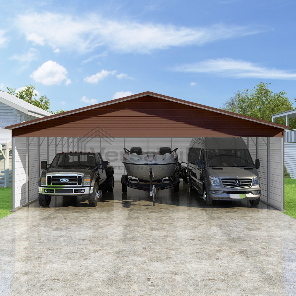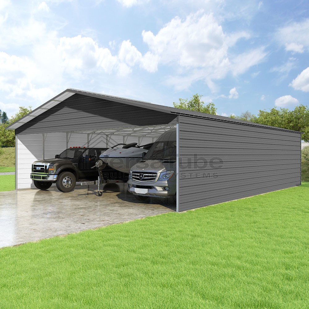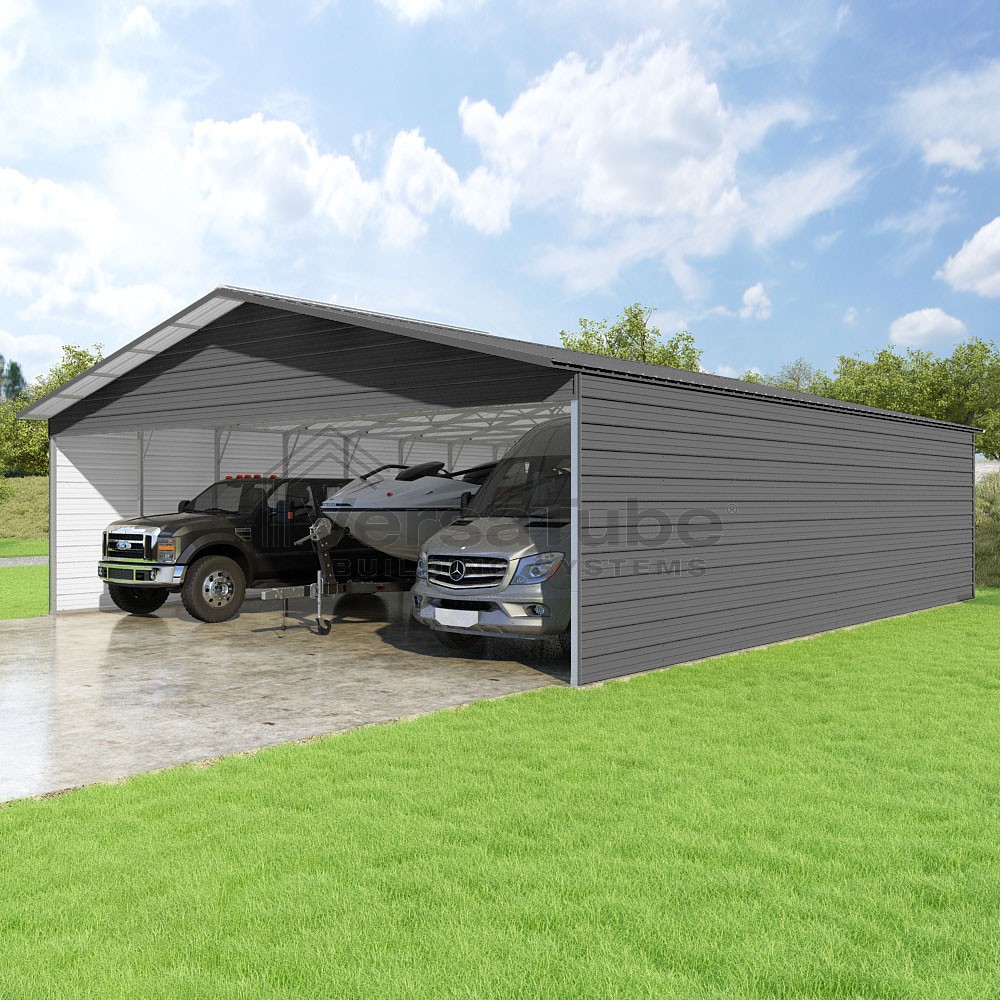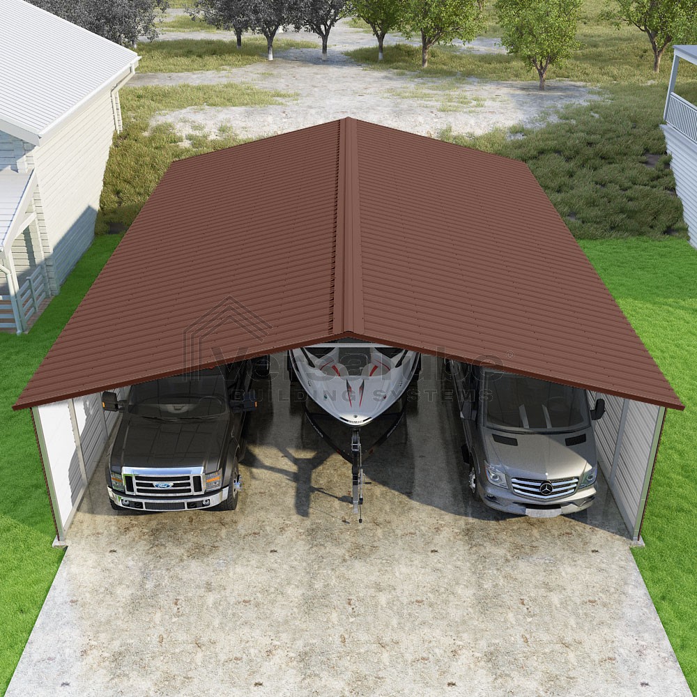 Pinnacle Series DIY carport kit features vertical sheet metal roof panels with ridge cap, gable and eave trim for an A-frame roof style and extended coverage on both ends.