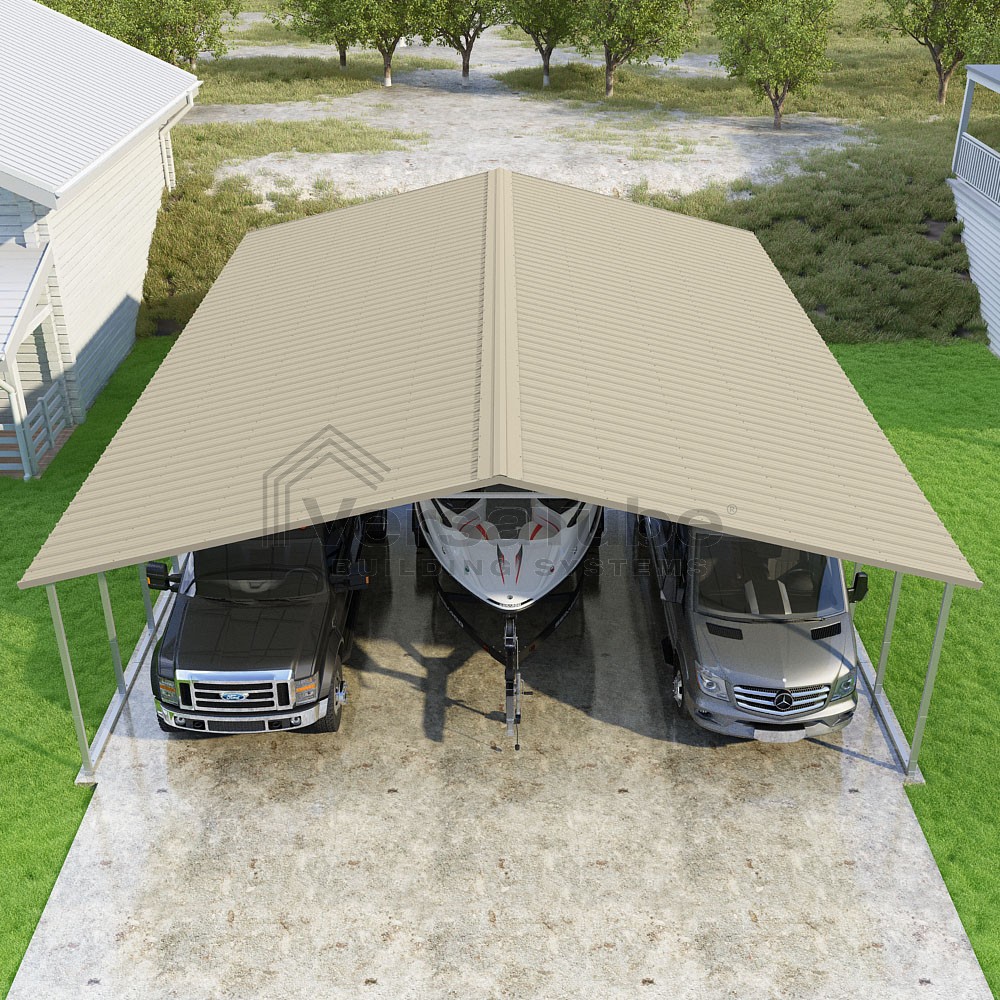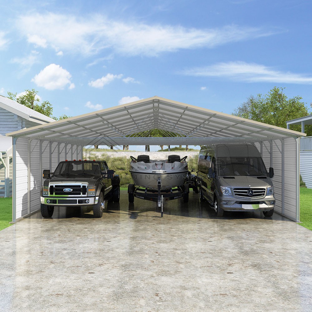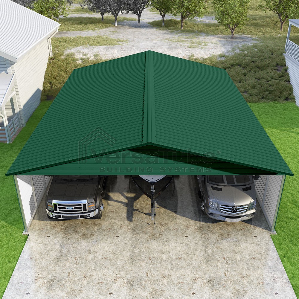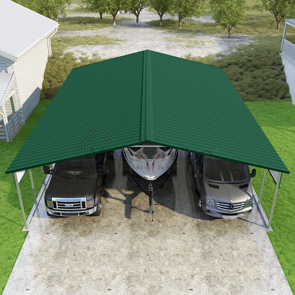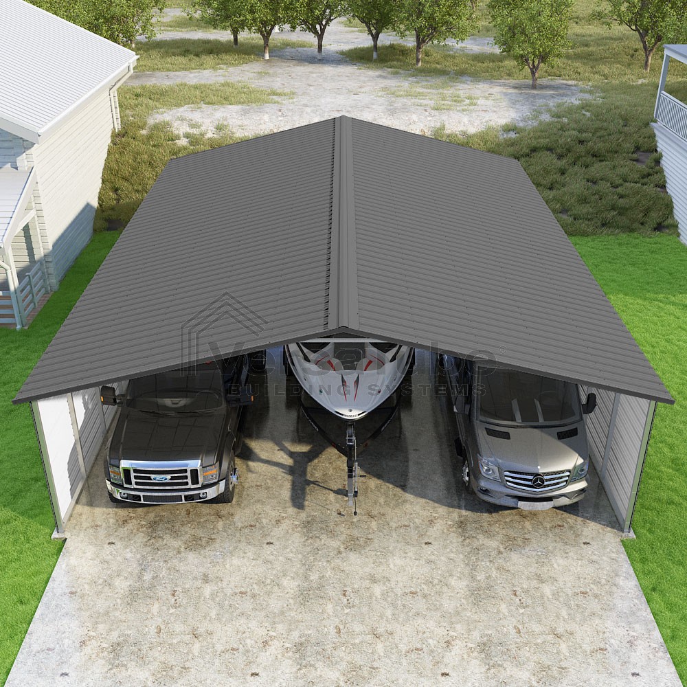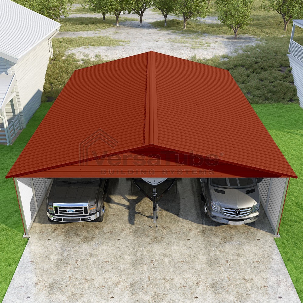 Pinnacle Series DIY carport kit features vertical sheet metal roof panels with ridge cap, gable and eave trim for an A-frame roof style and extended coverage on both ends.
