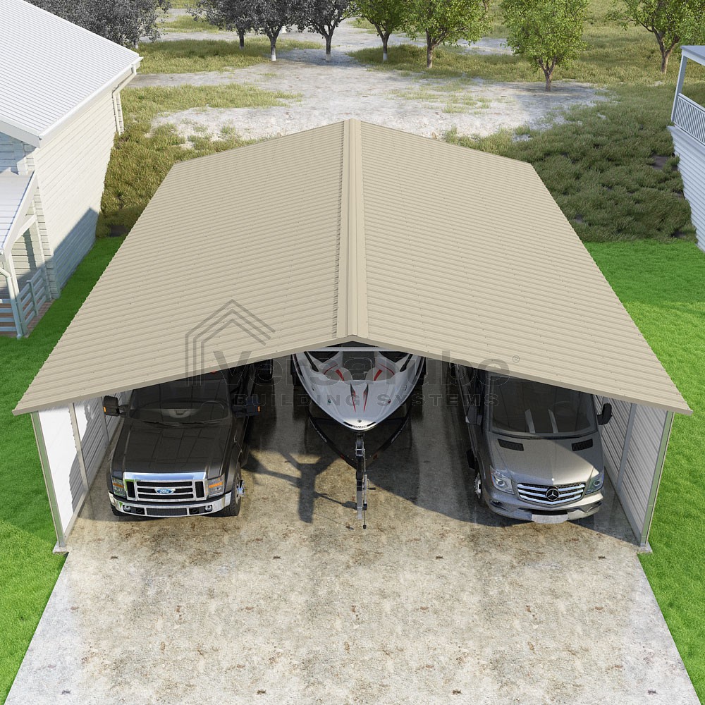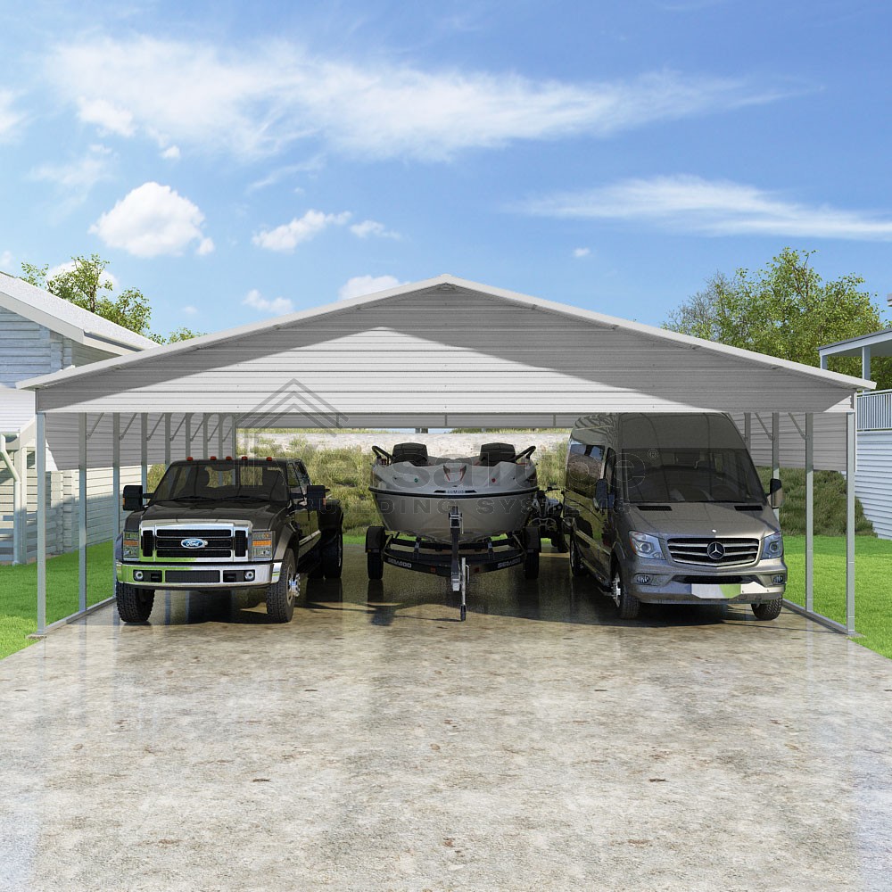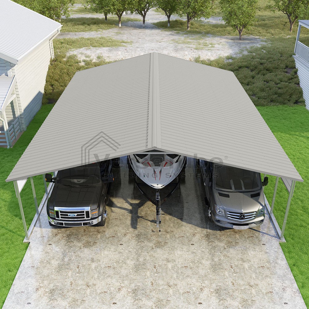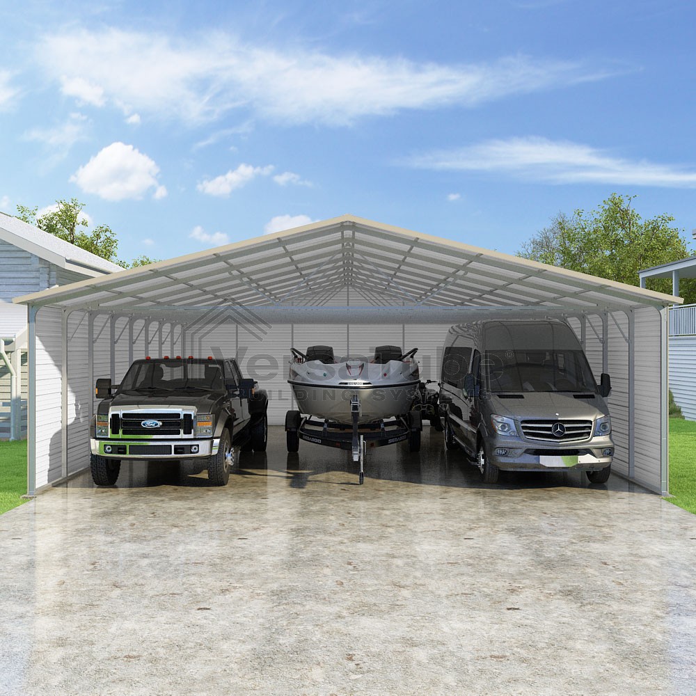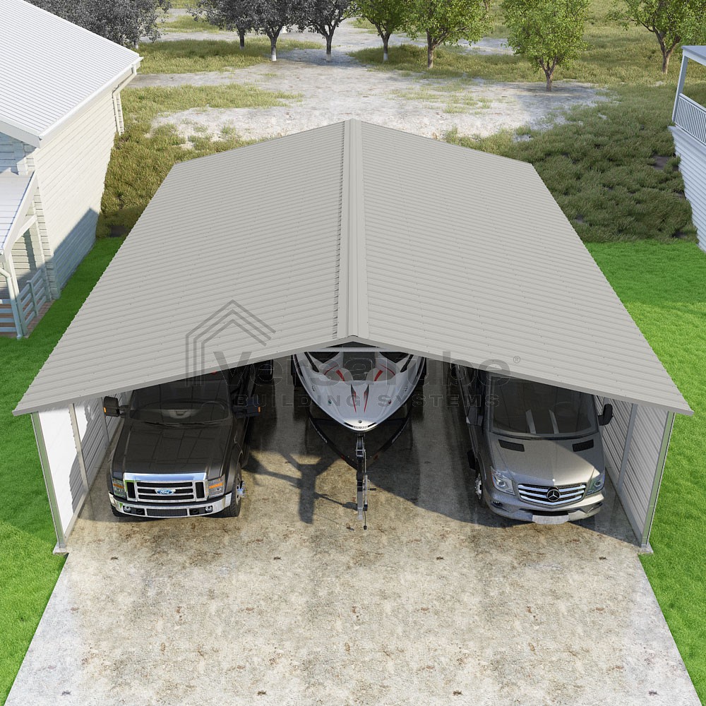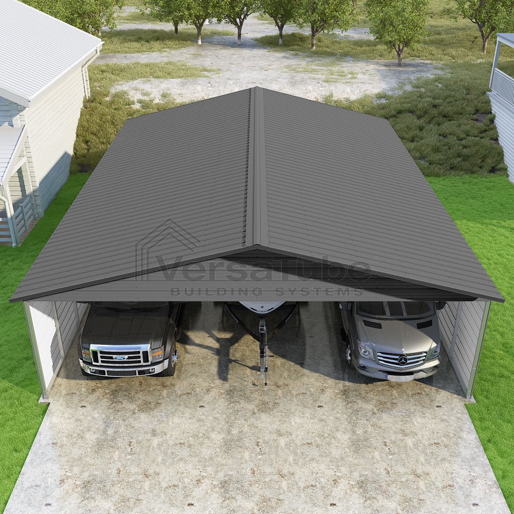 Pinnacle Series DIY carport kit features vertical sheet metal roof panels with ridge cap, gable and eave trim for an A-frame roof style and extended coverage on both ends.