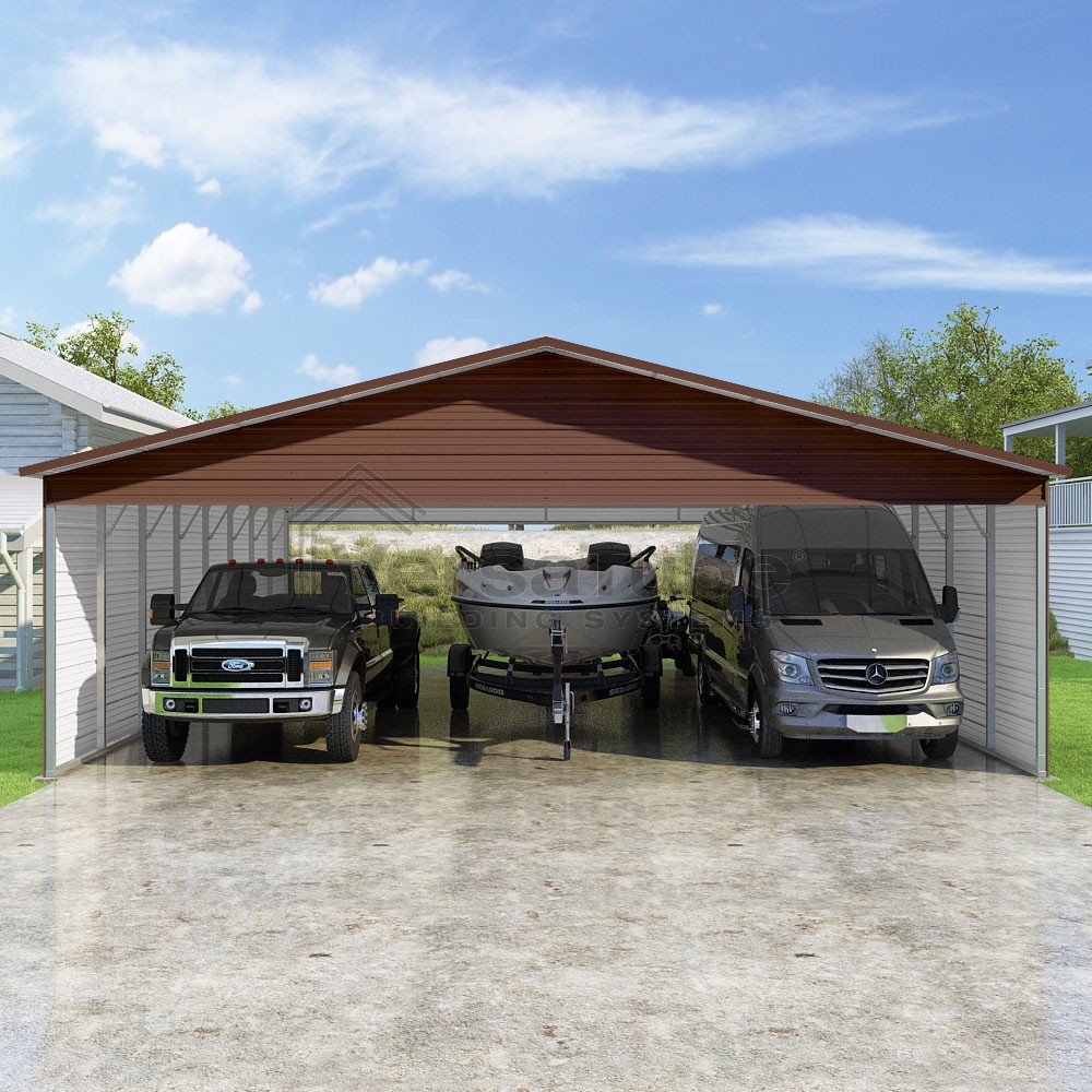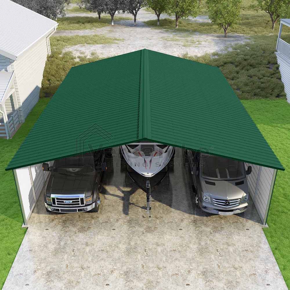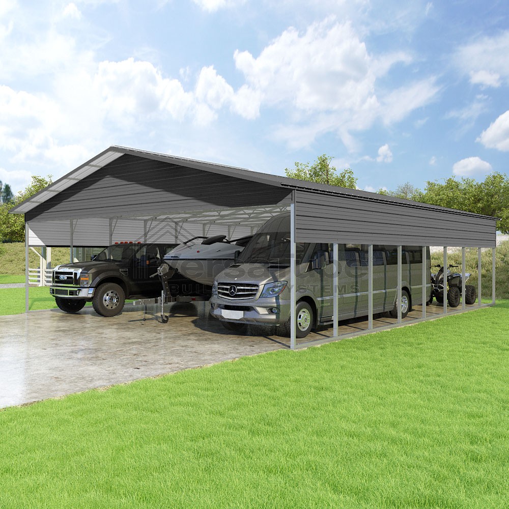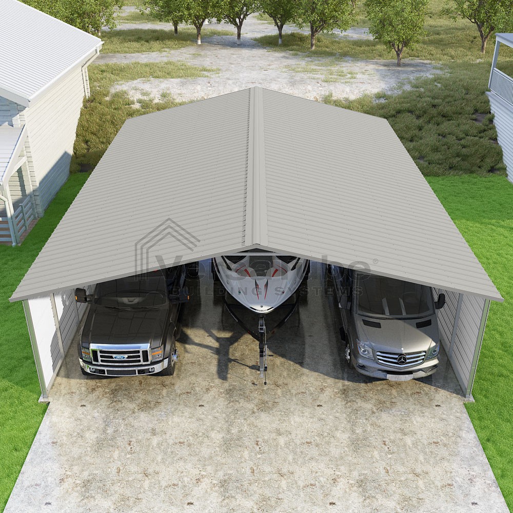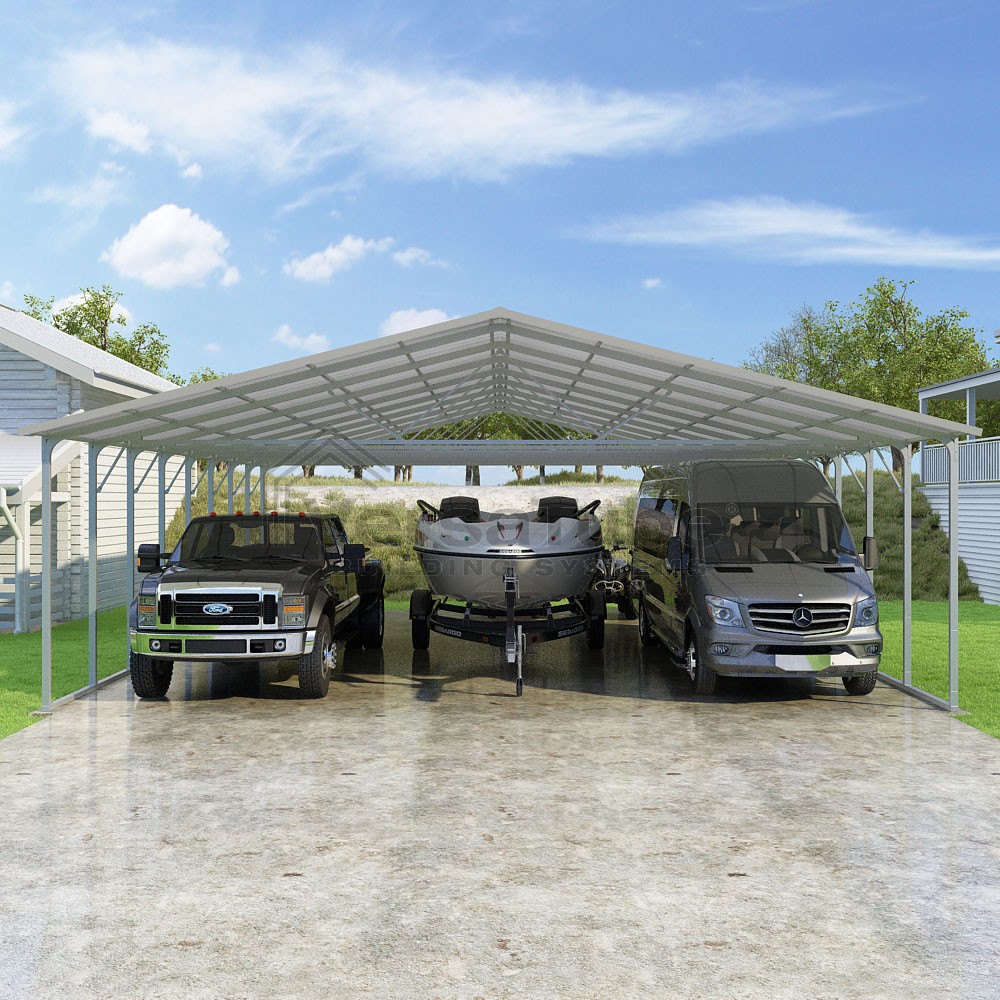 Pinnacle Series DIY carport kit features vertical sheet metal roof panels with ridge cap, gable and eave trim for an A-frame roof style and extended coverage on both ends.