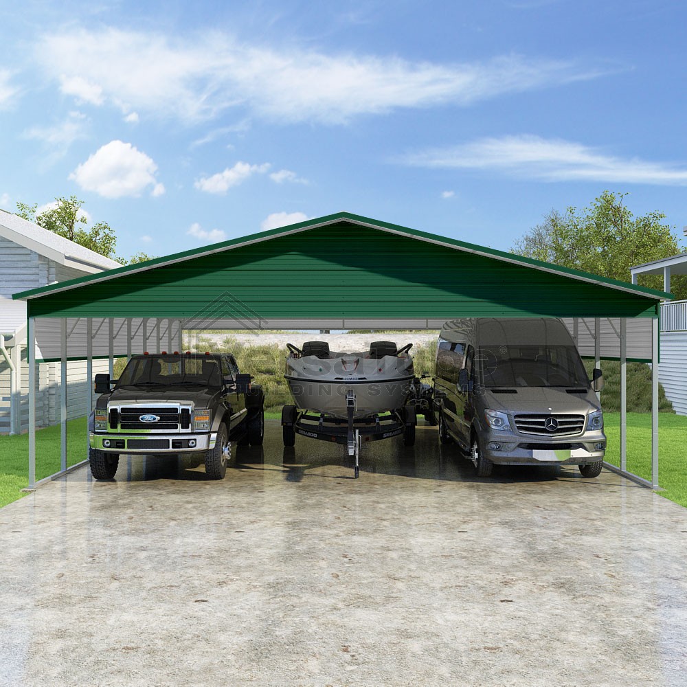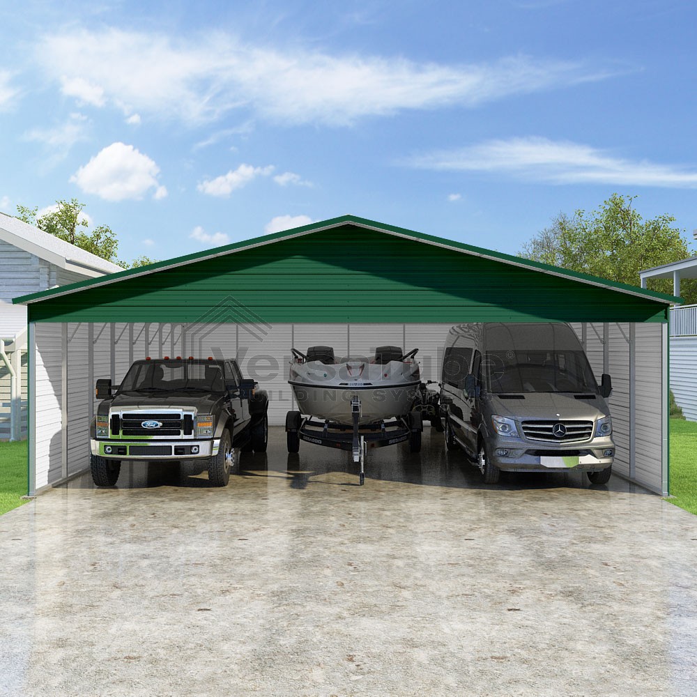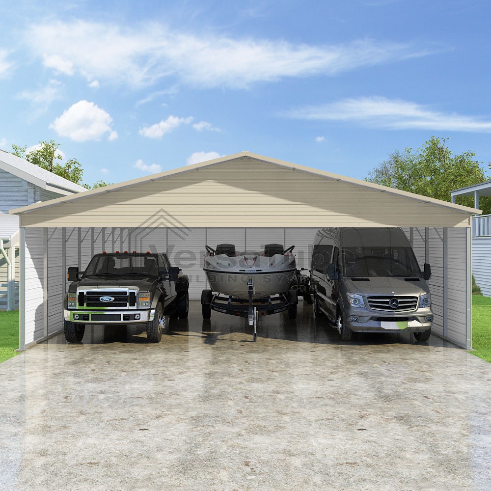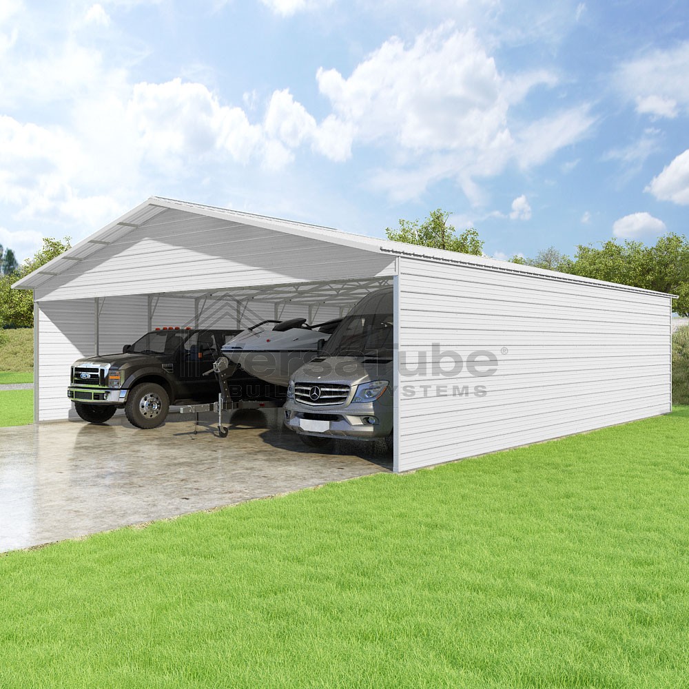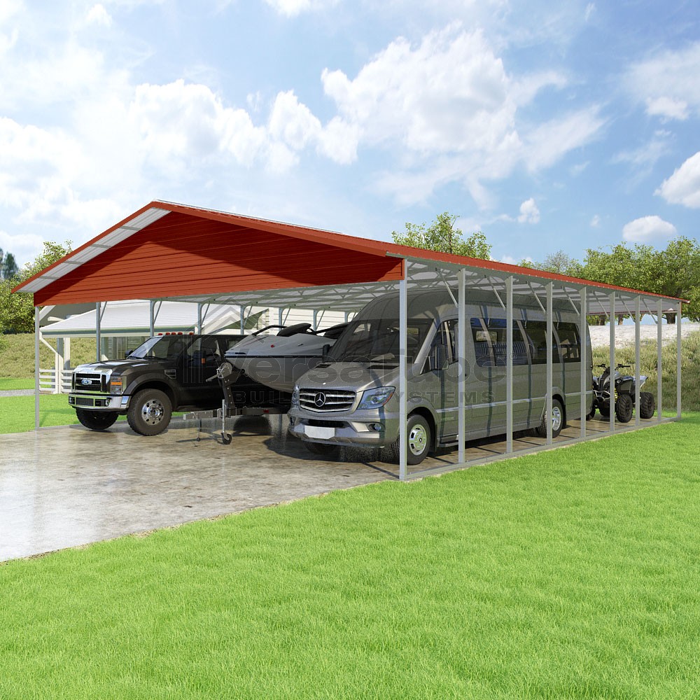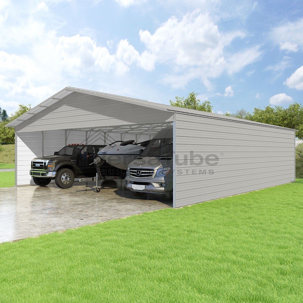 Pinnacle Series DIY carport kit features vertical sheet metal roof panels with ridge cap, gable and eave trim for an A-frame roof style and extended coverage on both ends.