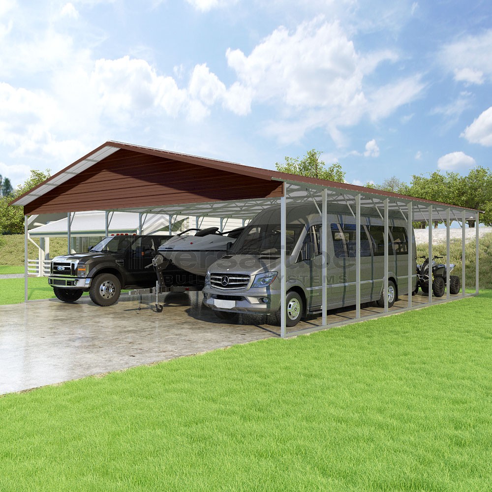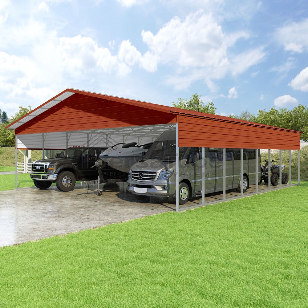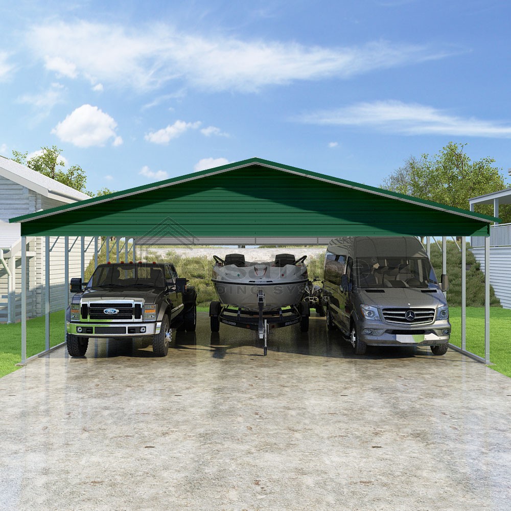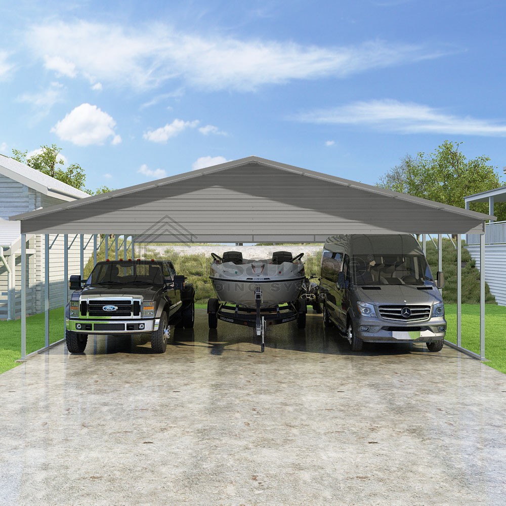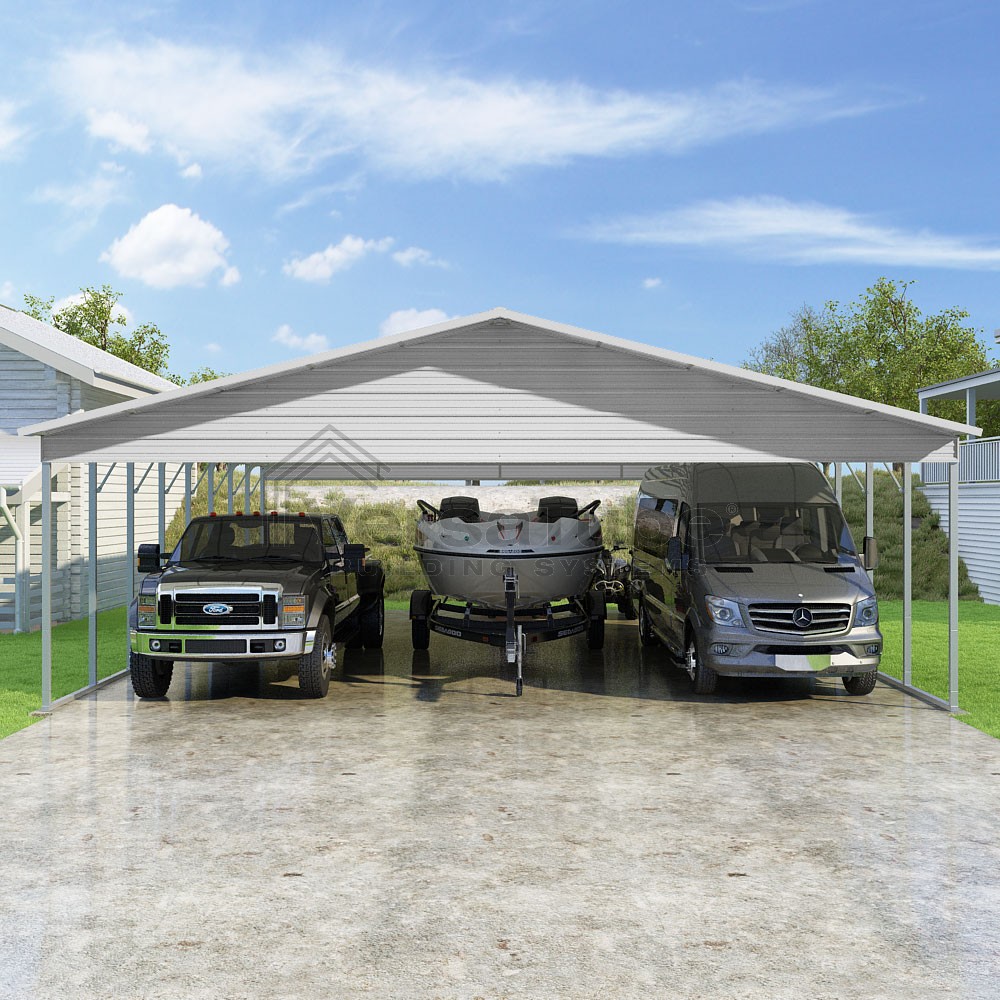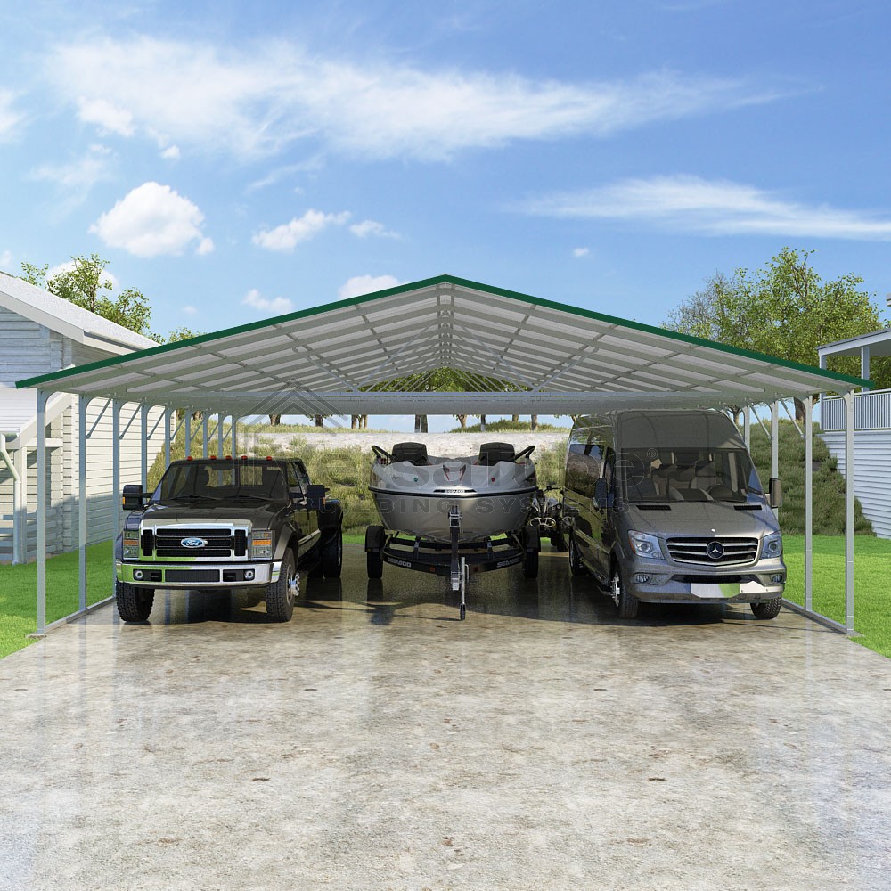 Pinnacle Series DIY carport kit features vertical sheet metal roof panels with ridge cap, gable and eave trim for an A-frame roof style and extended coverage on both ends.