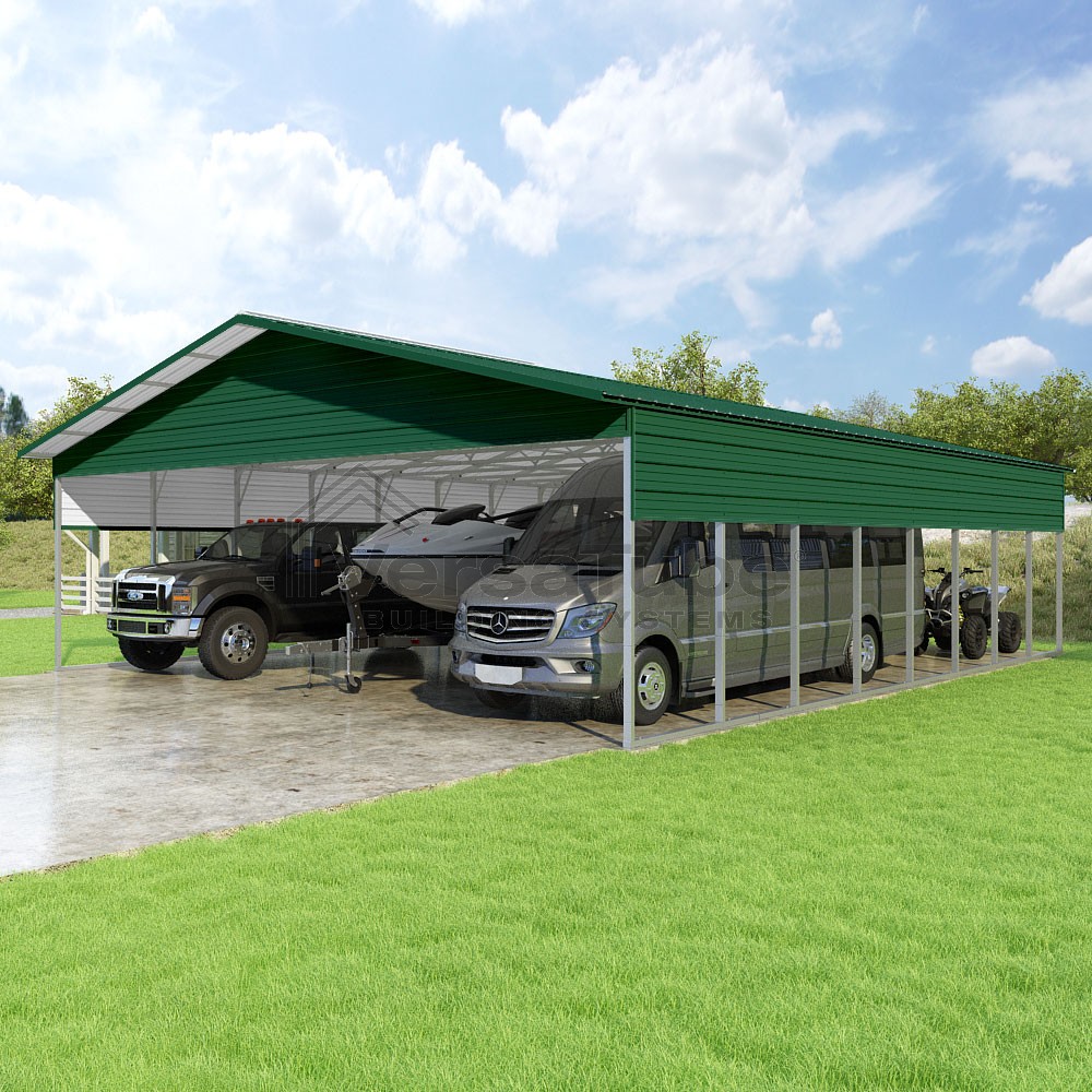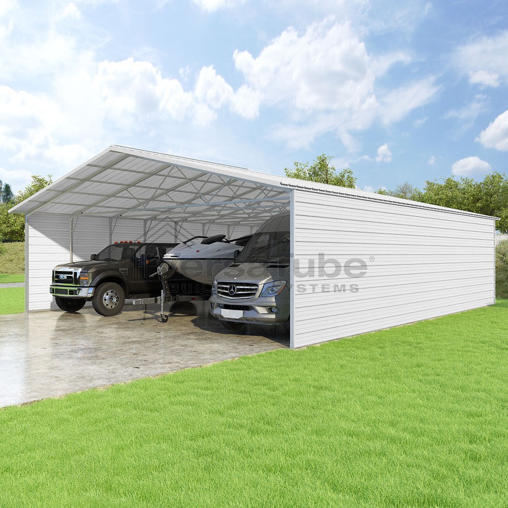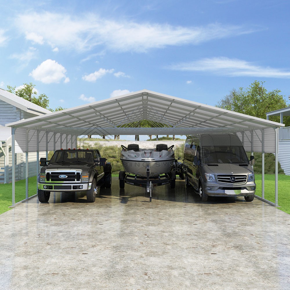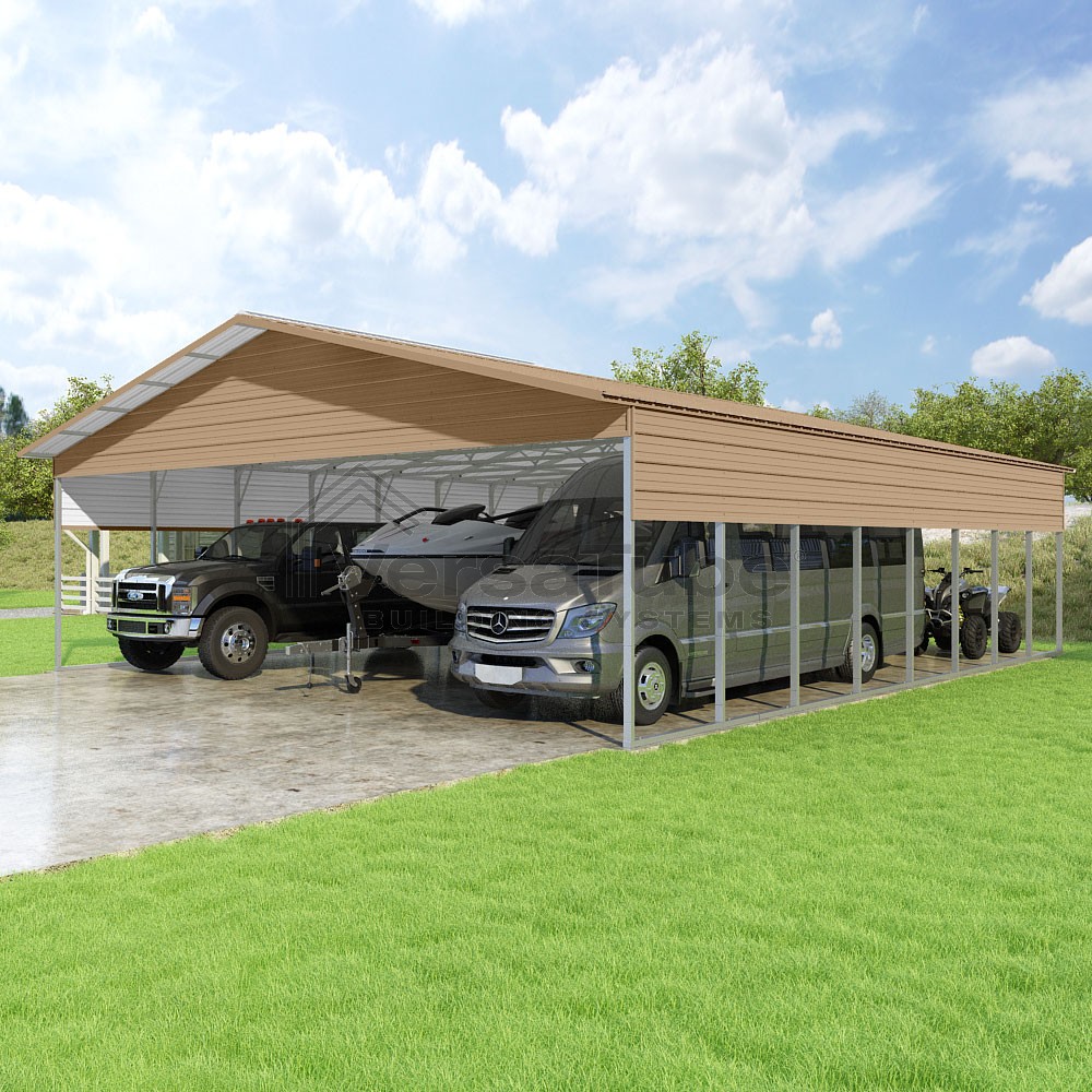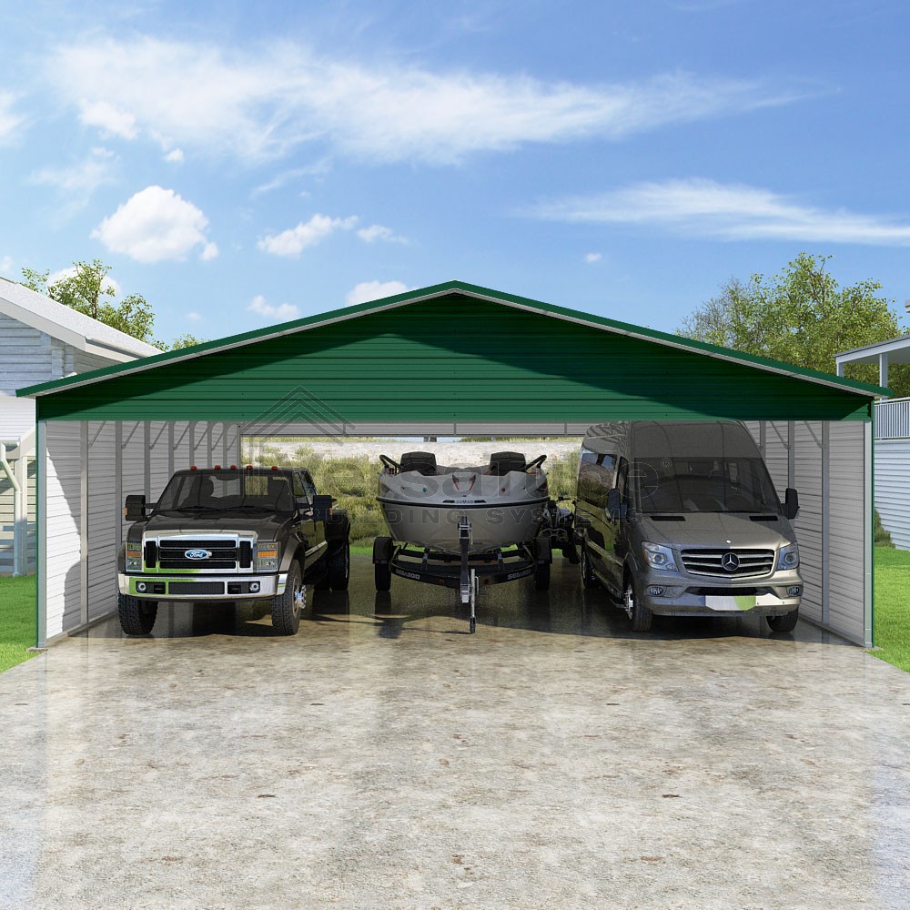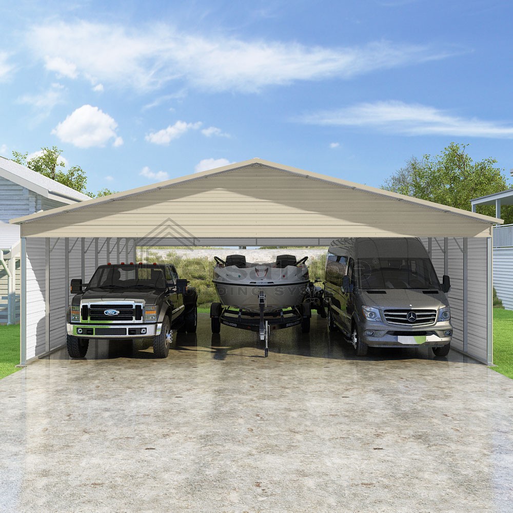 Pinnacle Series DIY carport kit features vertical sheet metal roof panels with ridge cap, gable and eave trim for an A-frame roof style and extended coverage on both ends.