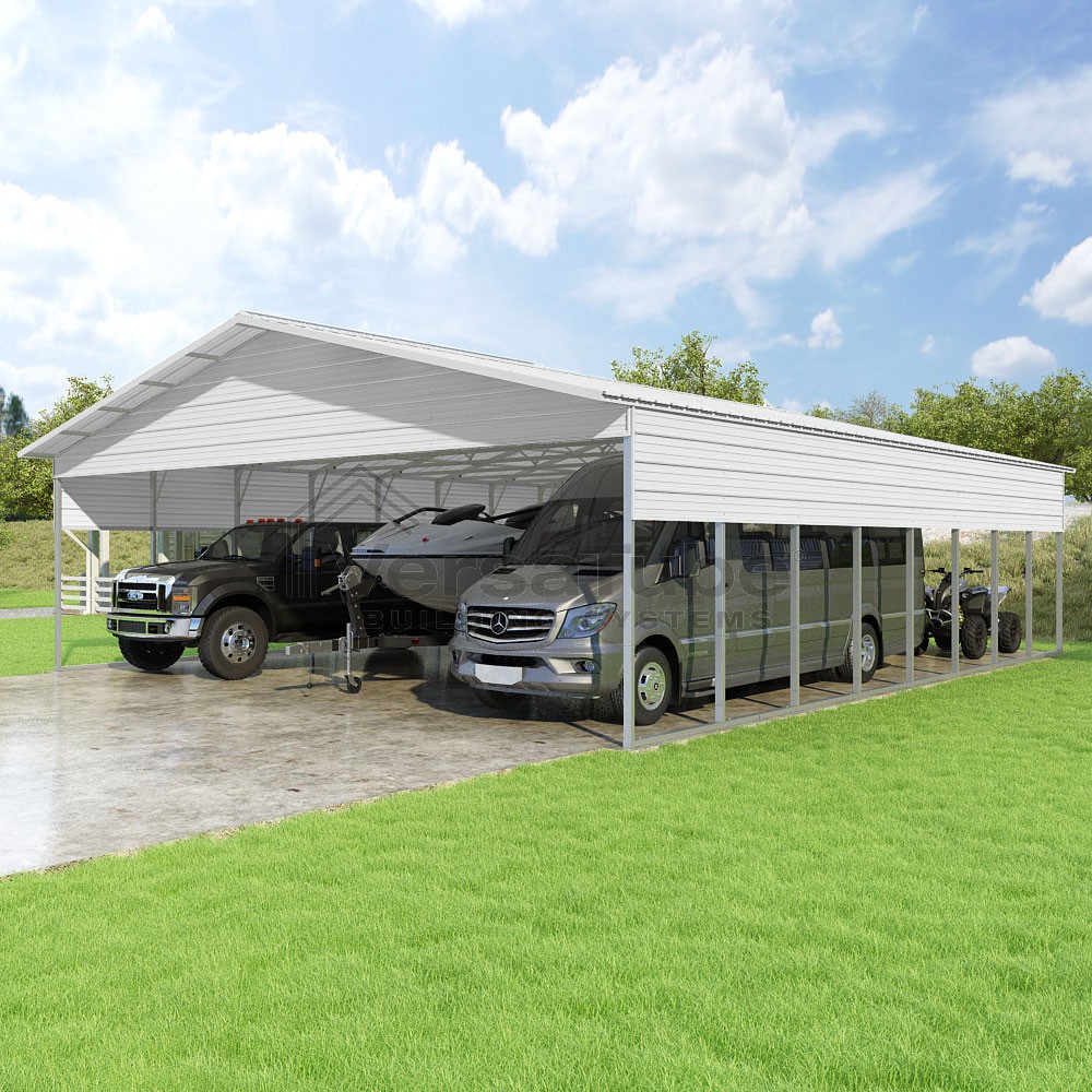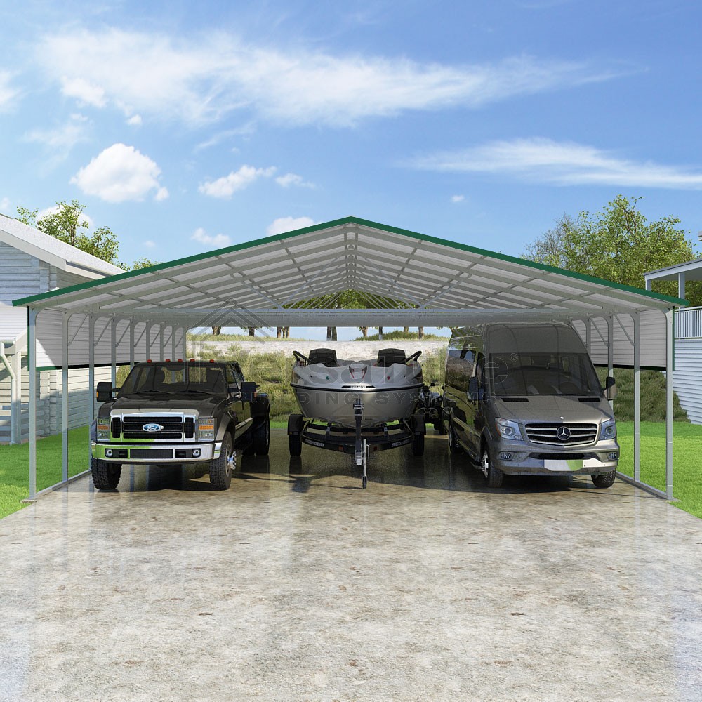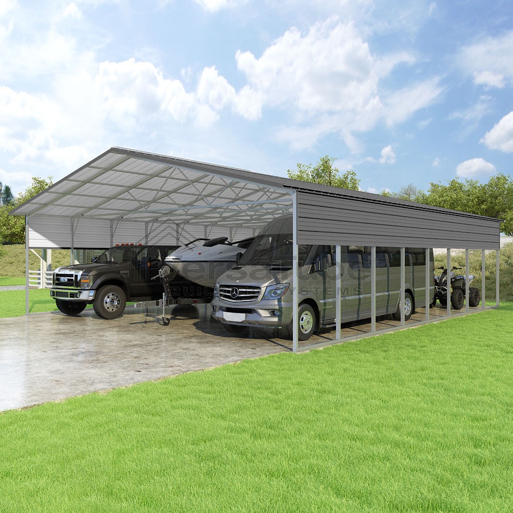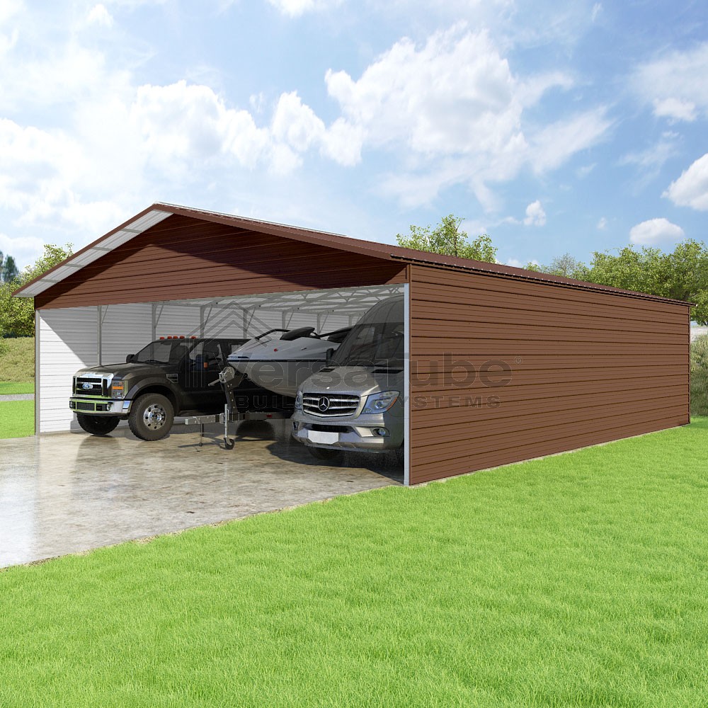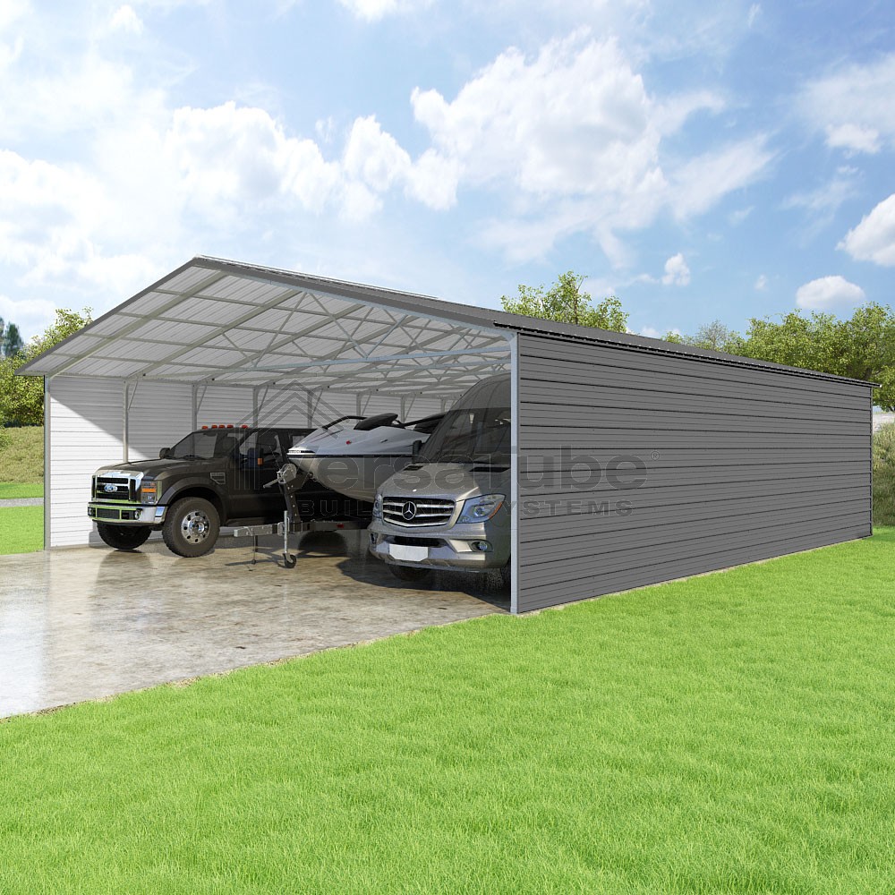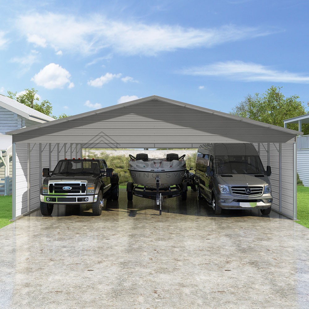 Pinnacle Series DIY carport kit features vertical sheet metal roof panels with ridge cap, gable and eave trim for an A-frame roof style and extended coverage on both ends.