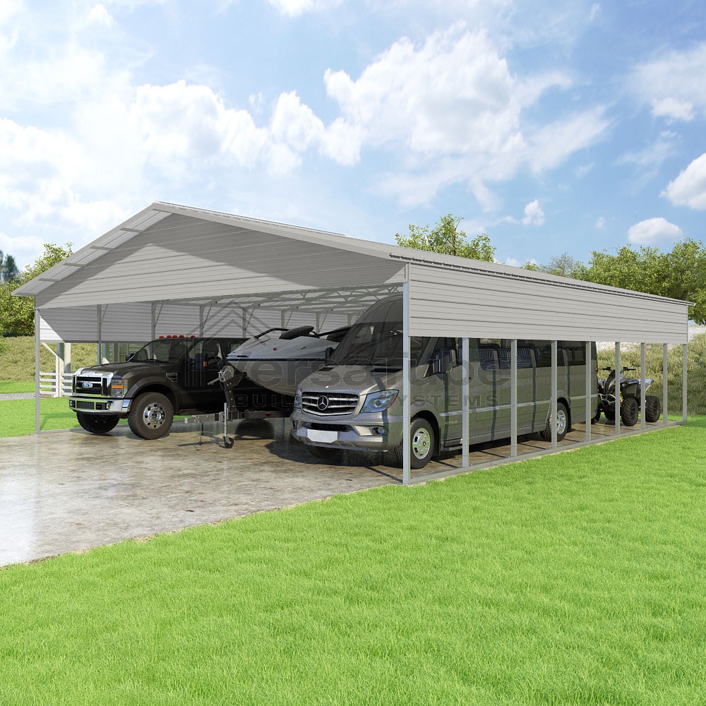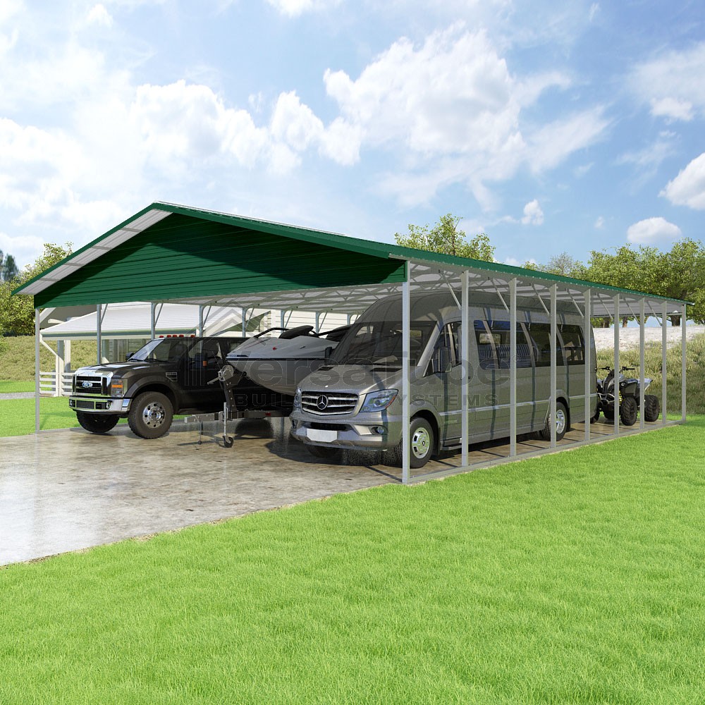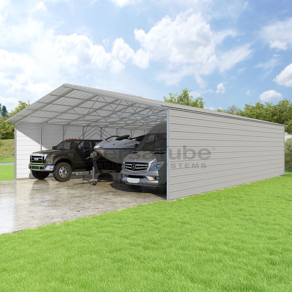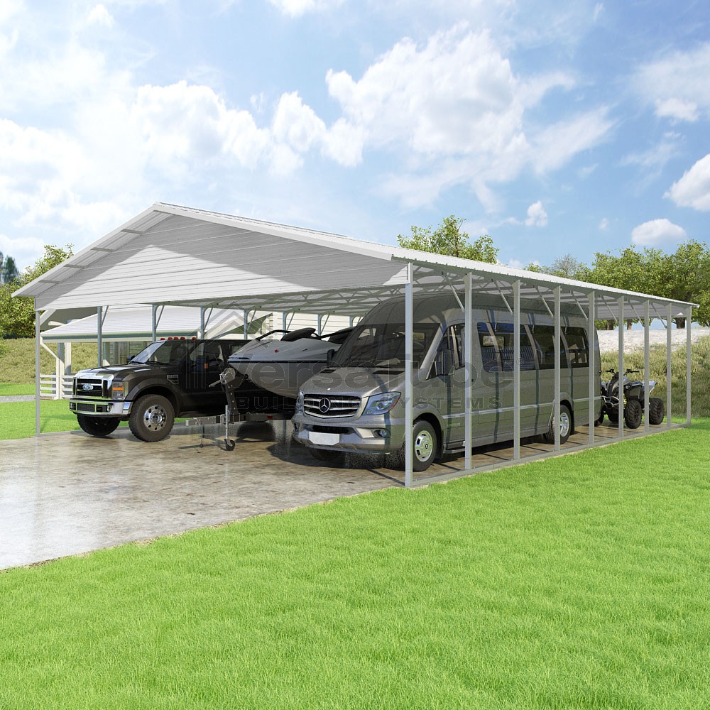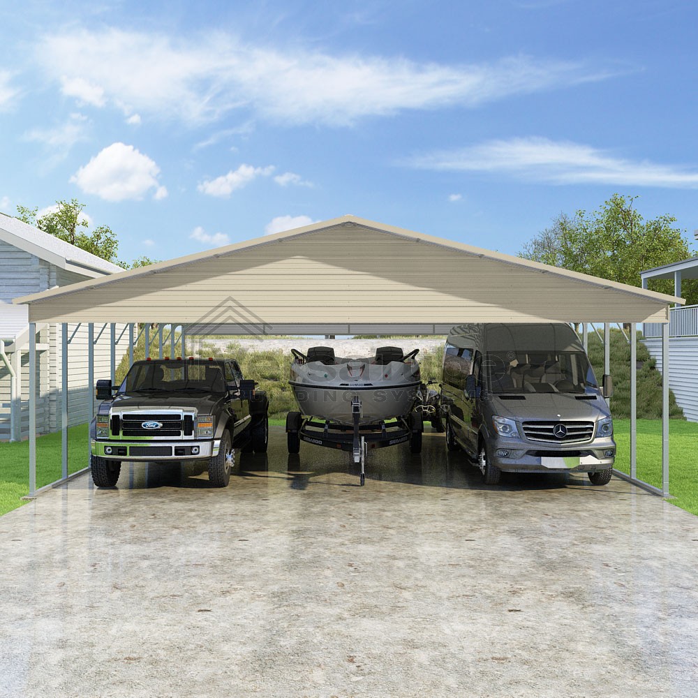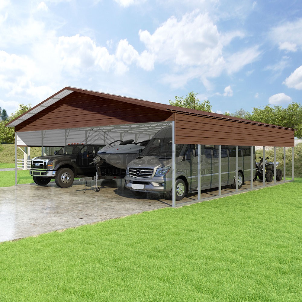 Pinnacle Series DIY carport kit features vertical sheet metal roof panels with ridge cap, gable and eave trim for an A-frame roof style and extended coverage on both ends.