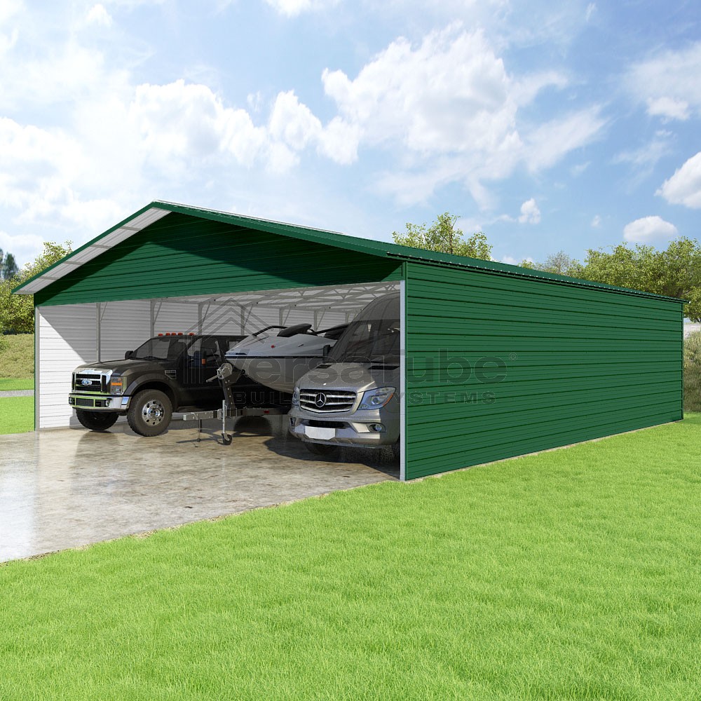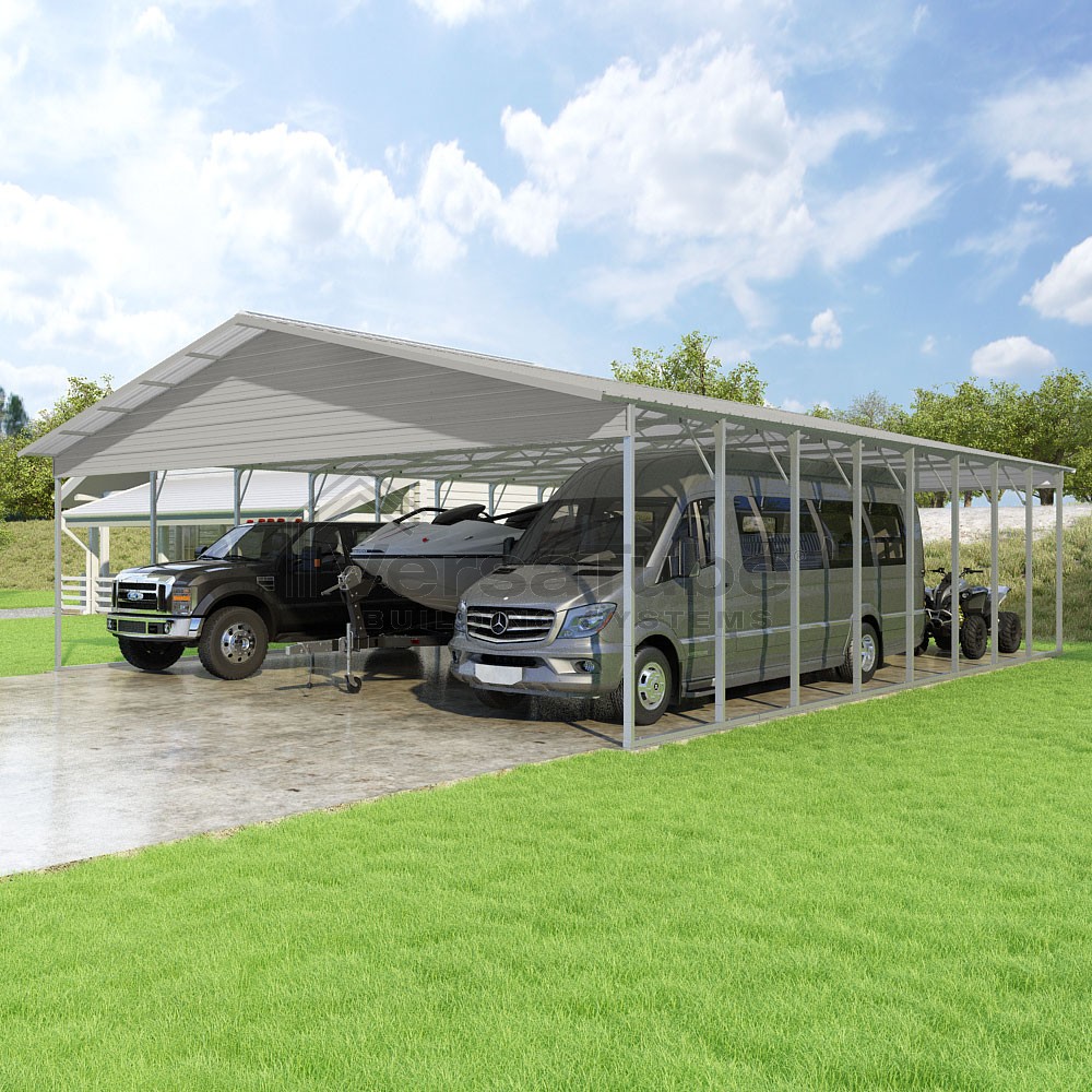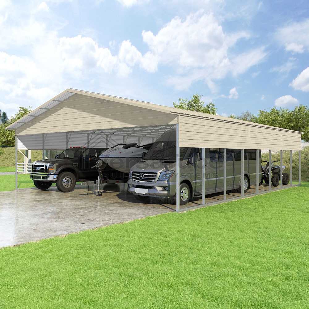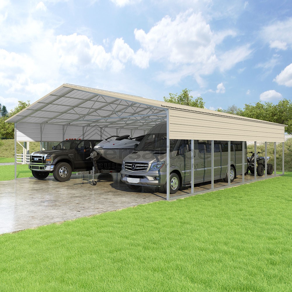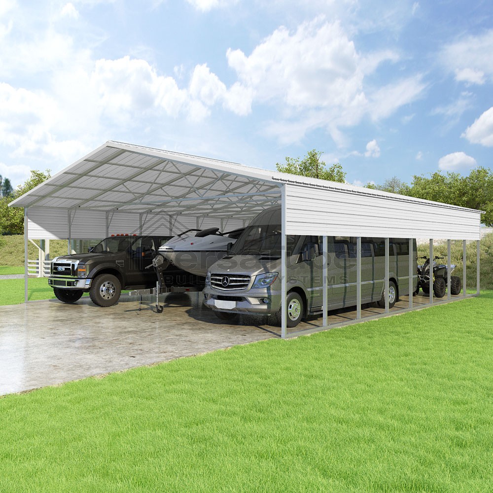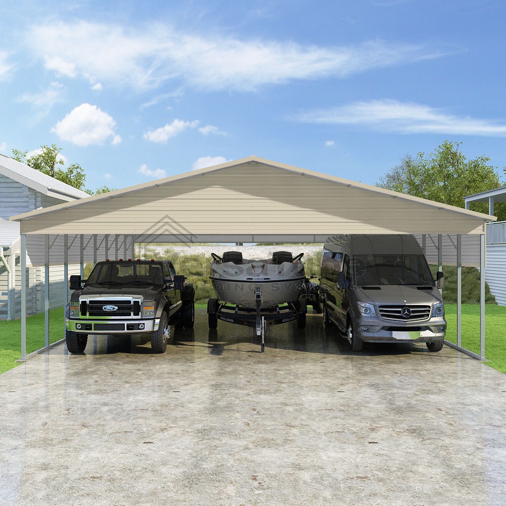 Pinnacle Series DIY carport kit features vertical sheet metal roof panels with ridge cap, gable and eave trim for an A-frame roof style and extended coverage on both ends.