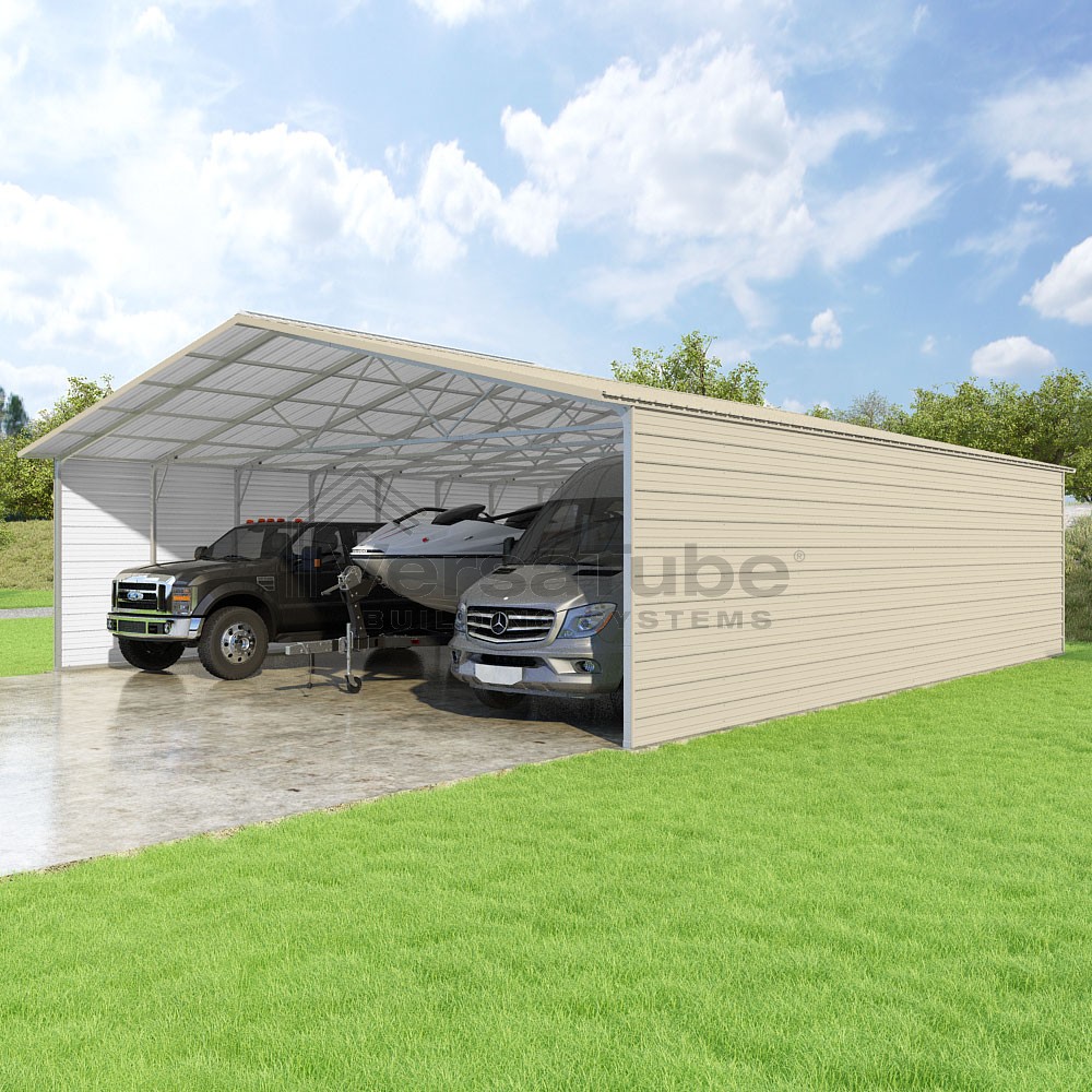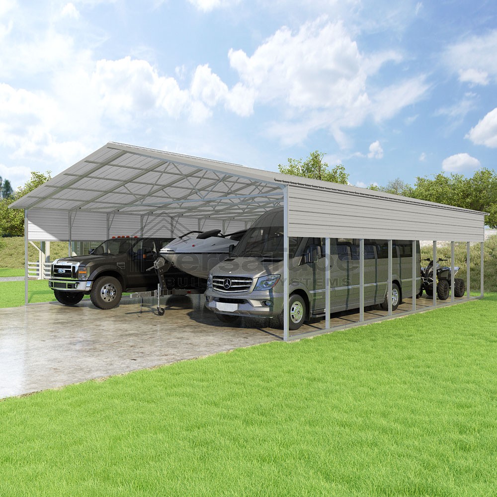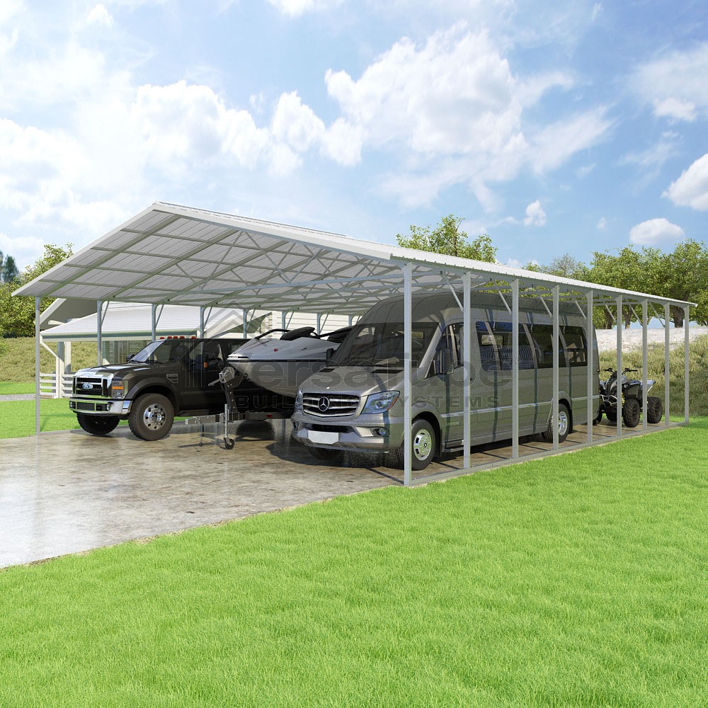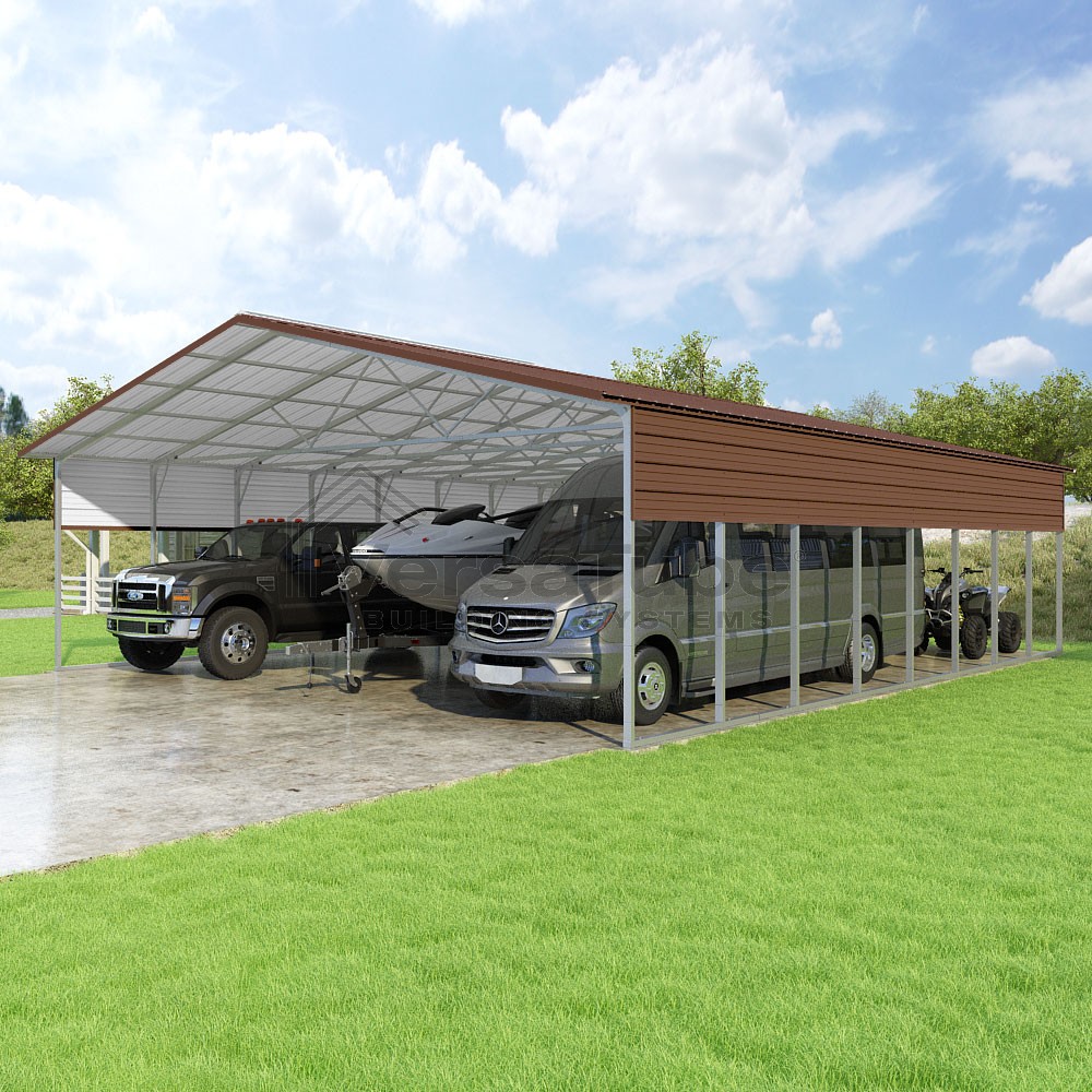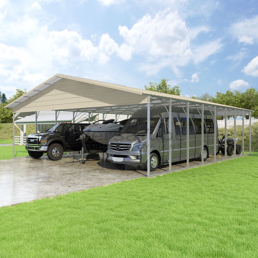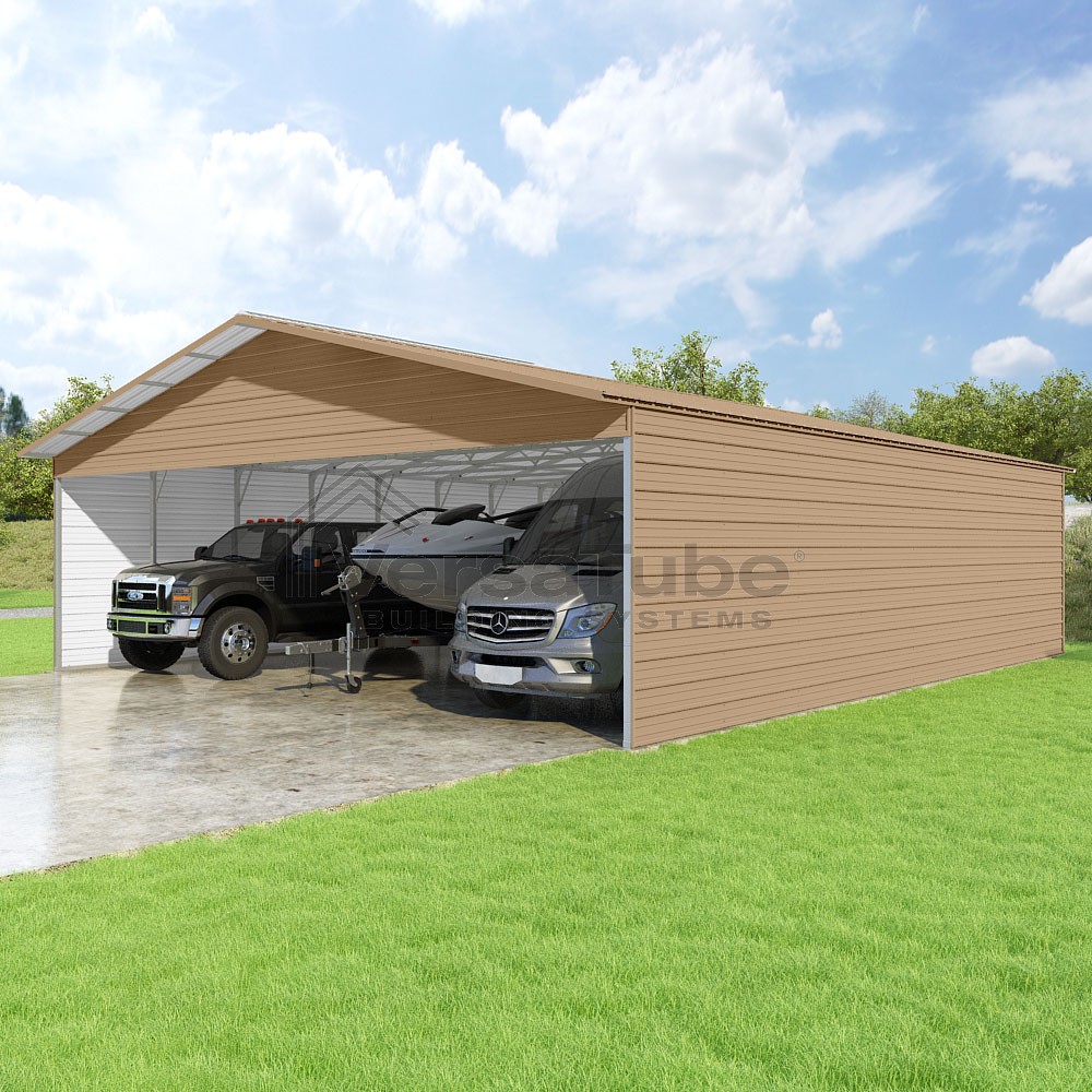 Pinnacle Series DIY carport kit features vertical sheet metal roof panels with ridge cap, gable and eave trim for an A-frame roof style and extended coverage on both ends.