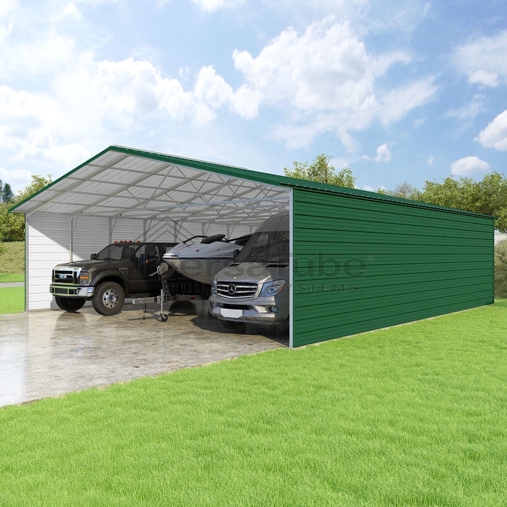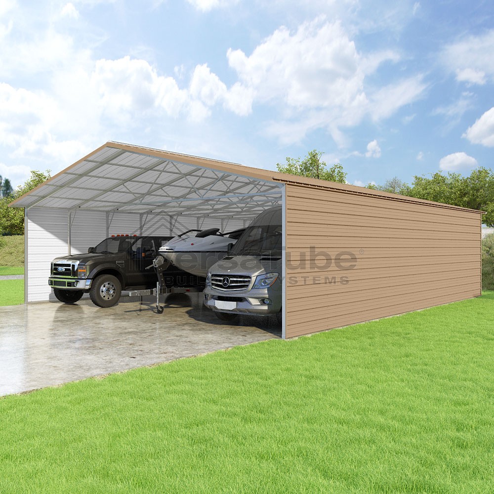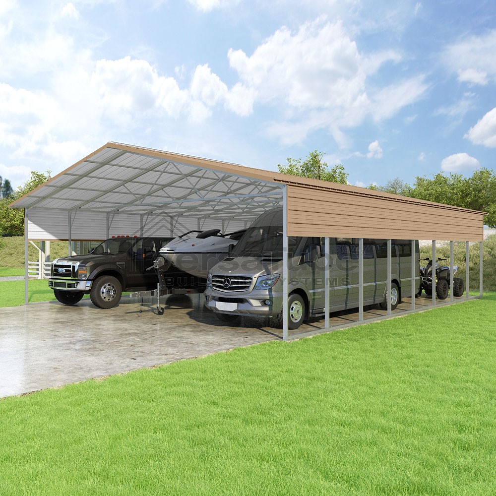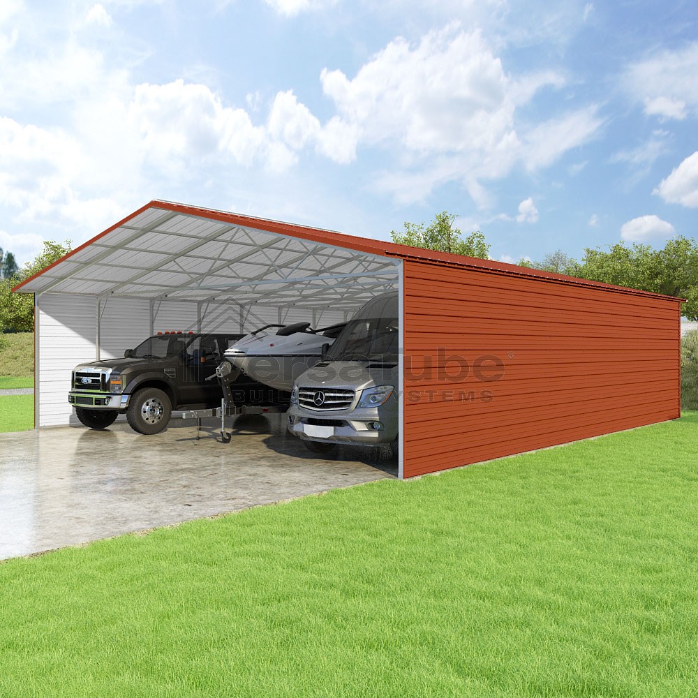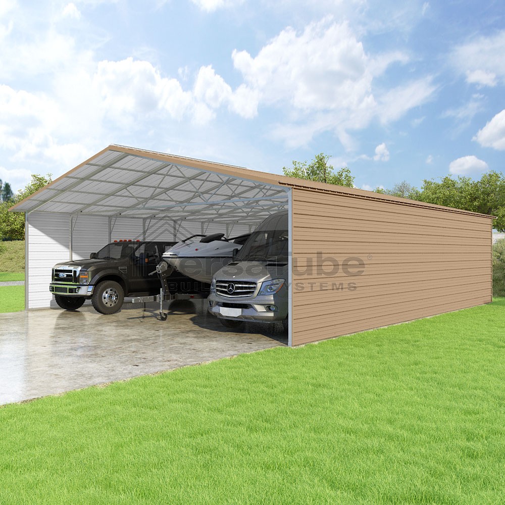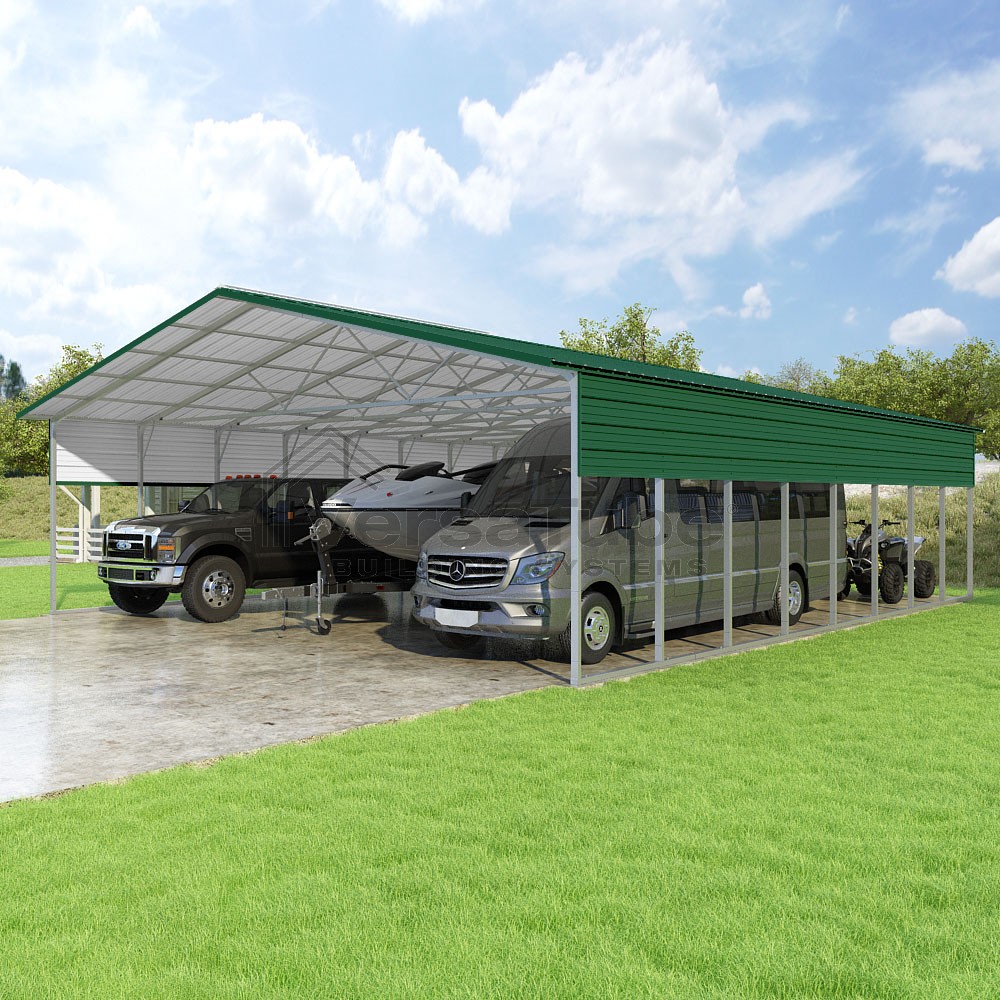 Pinnacle Series DIY carport kit features vertical sheet metal roof panels with ridge cap, gable and eave trim for an A-frame roof style and extended coverage on both ends.