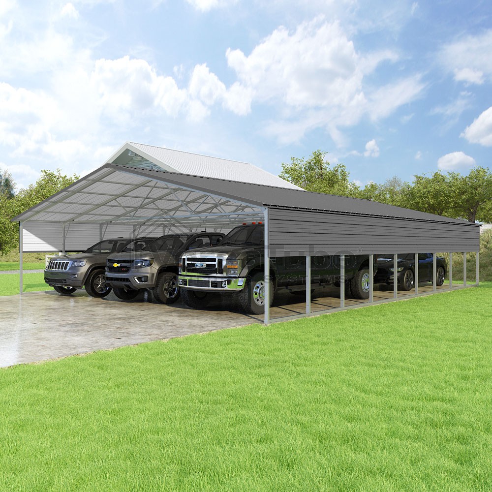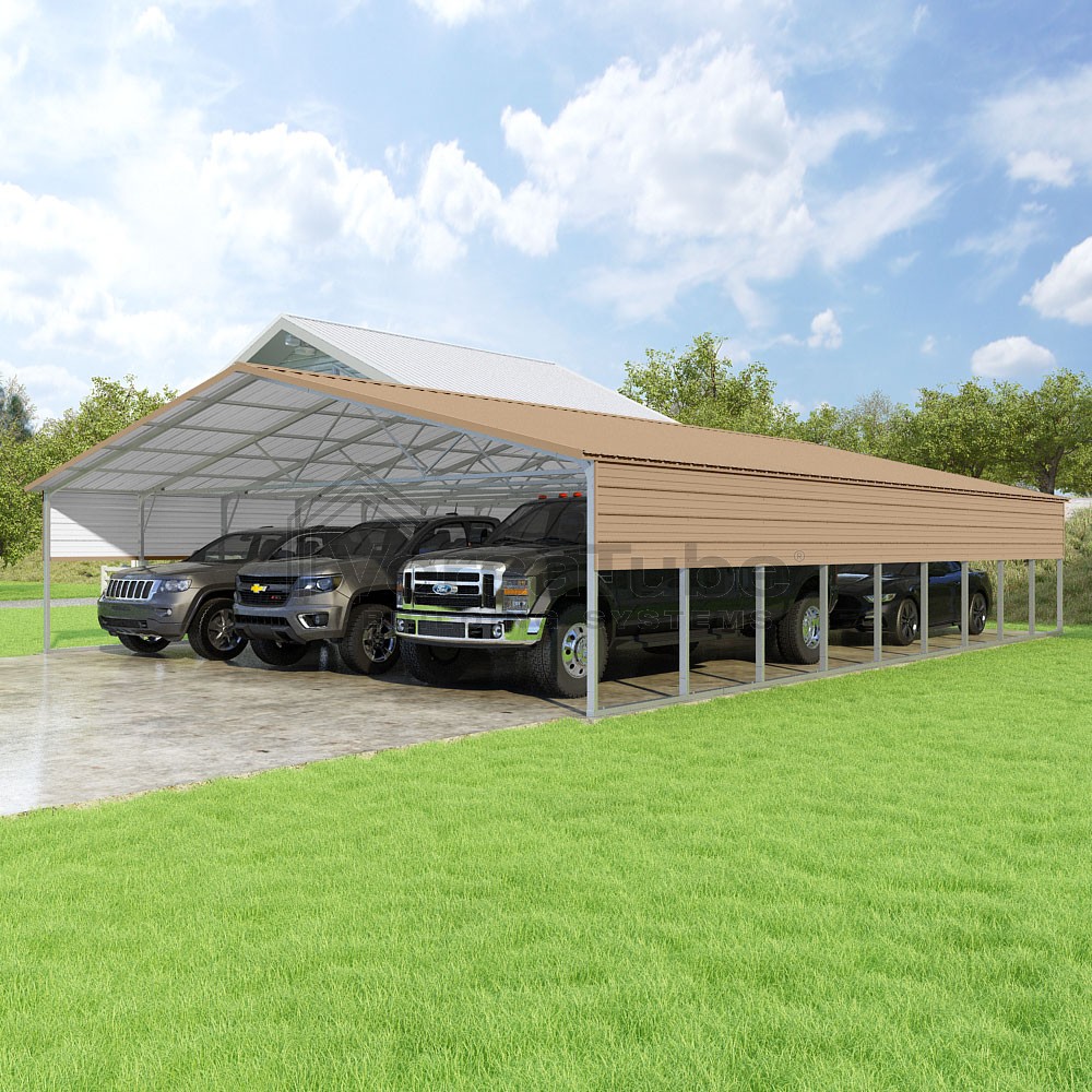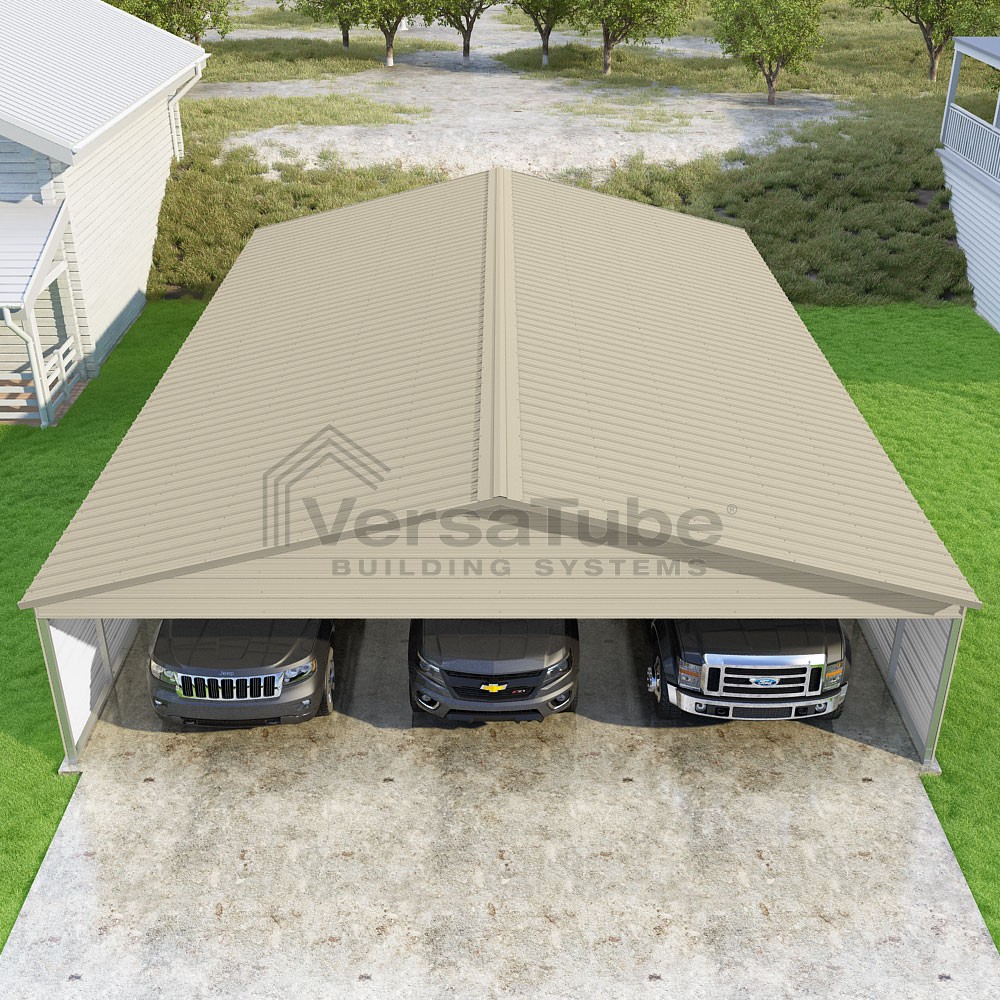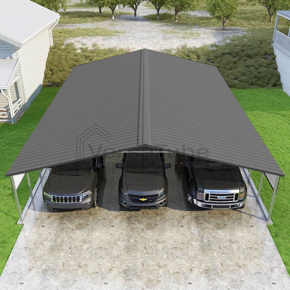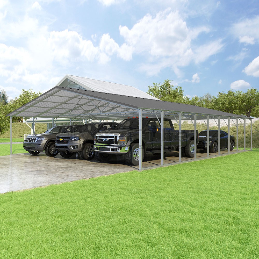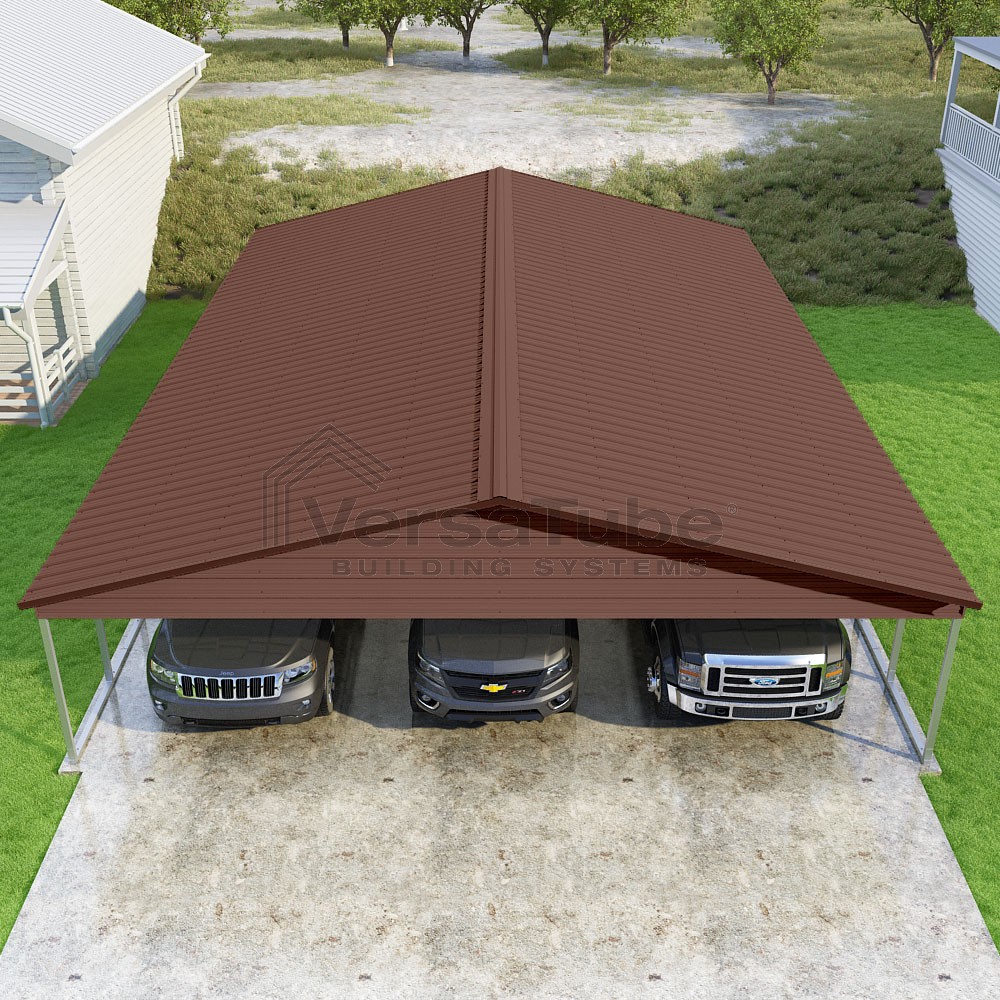 Pinnacle Series DIY carport kit features vertical sheet metal roof panels with ridge cap, gable and eave trim for an A-frame roof style and extended coverage on both ends.