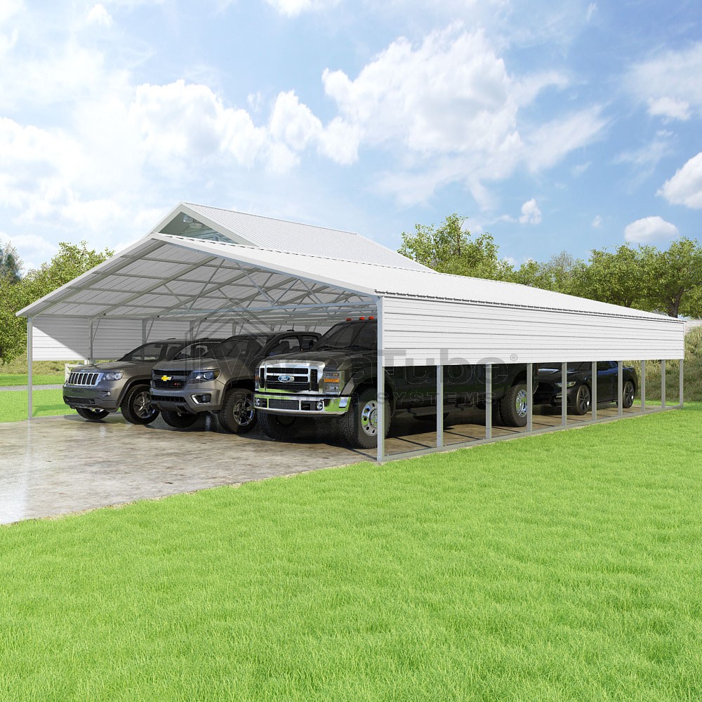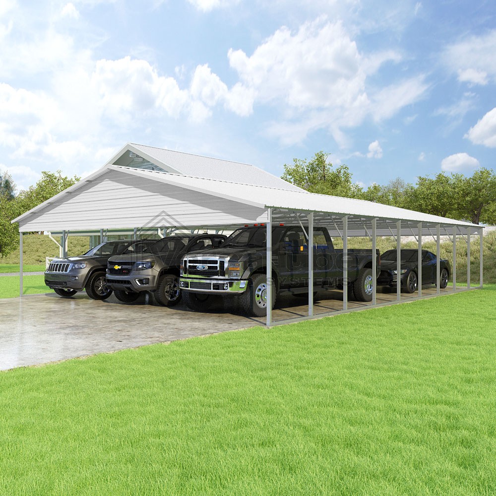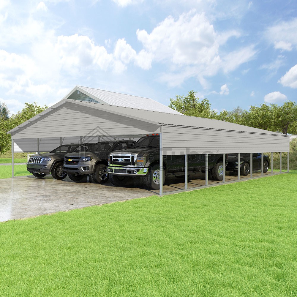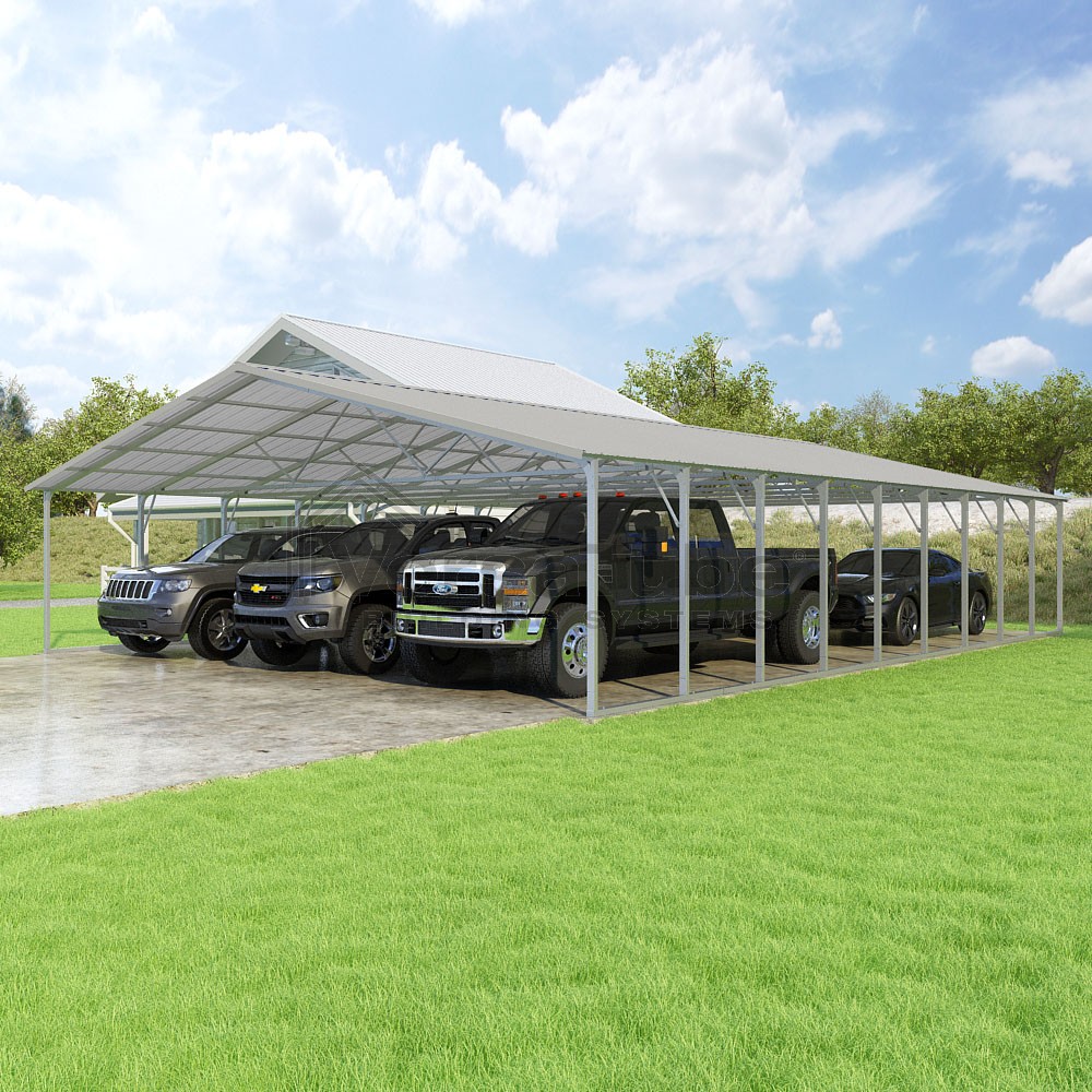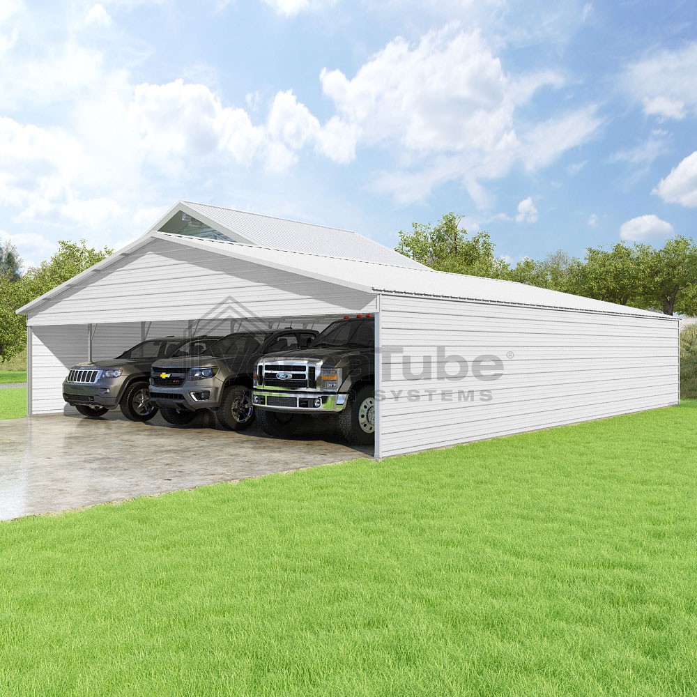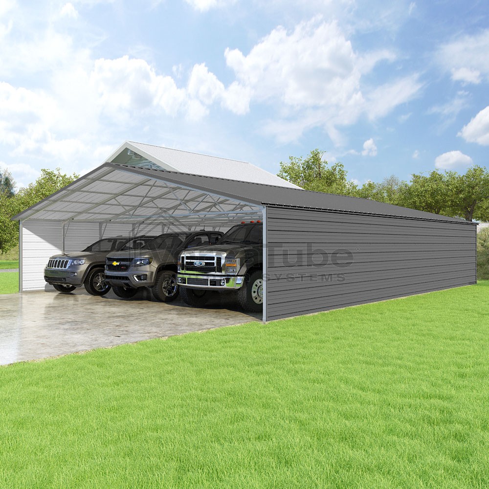 Pinnacle Series DIY carport kit features vertical sheet metal roof panels with ridge cap, gable and eave trim for an A-frame roof style and extended coverage on both ends.