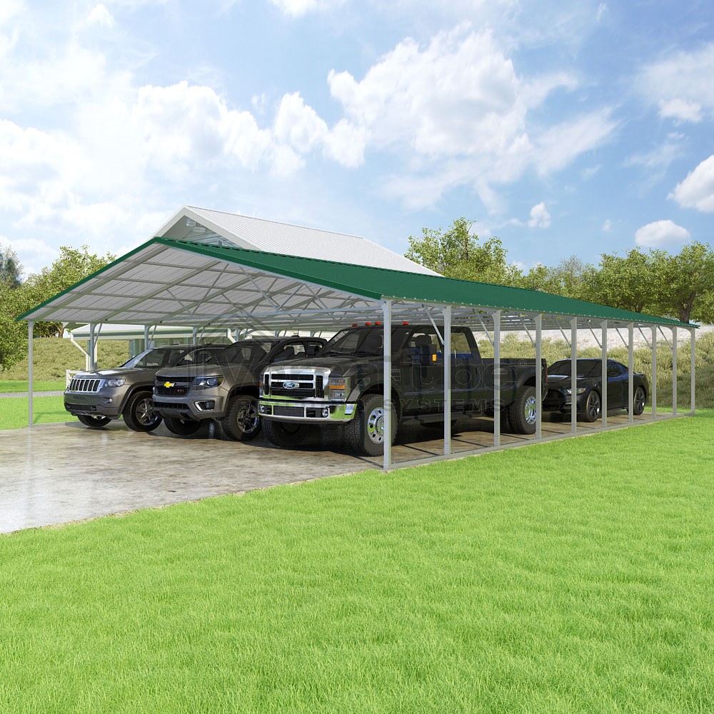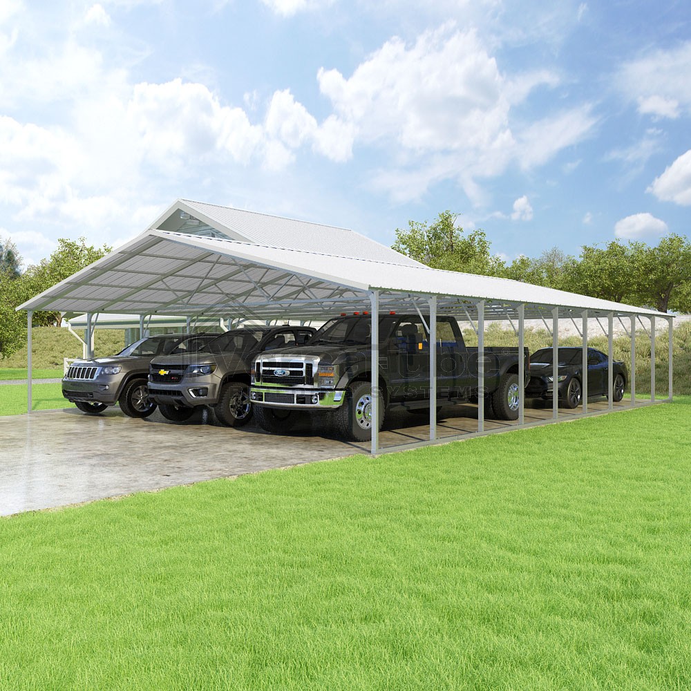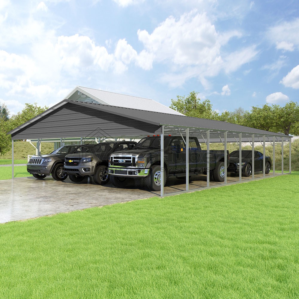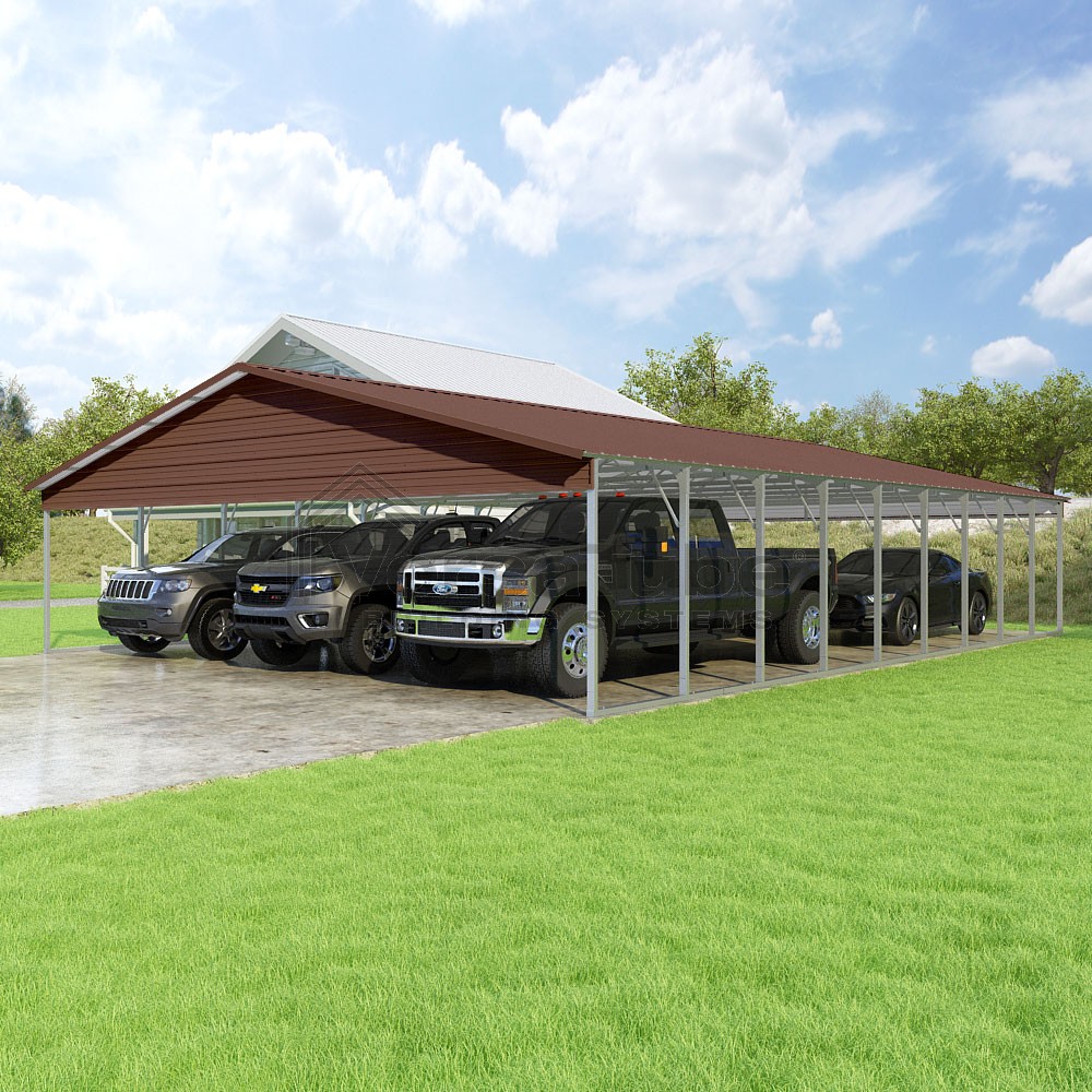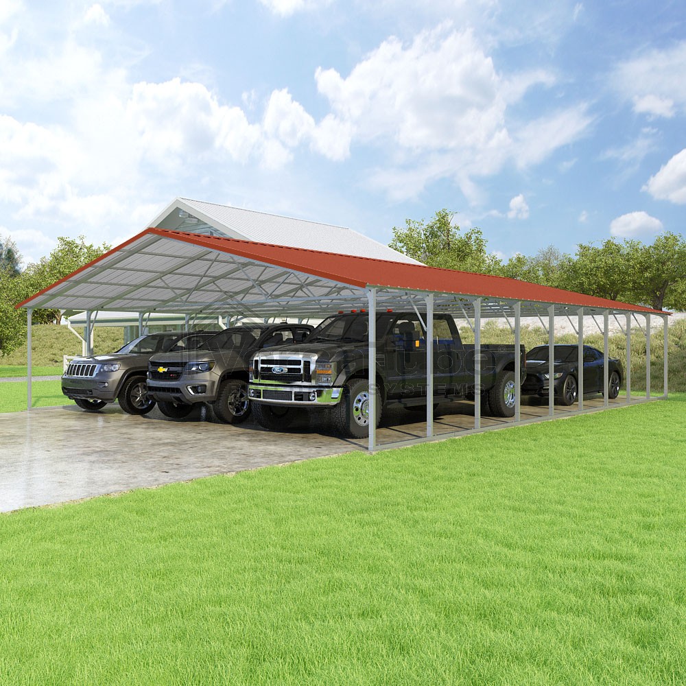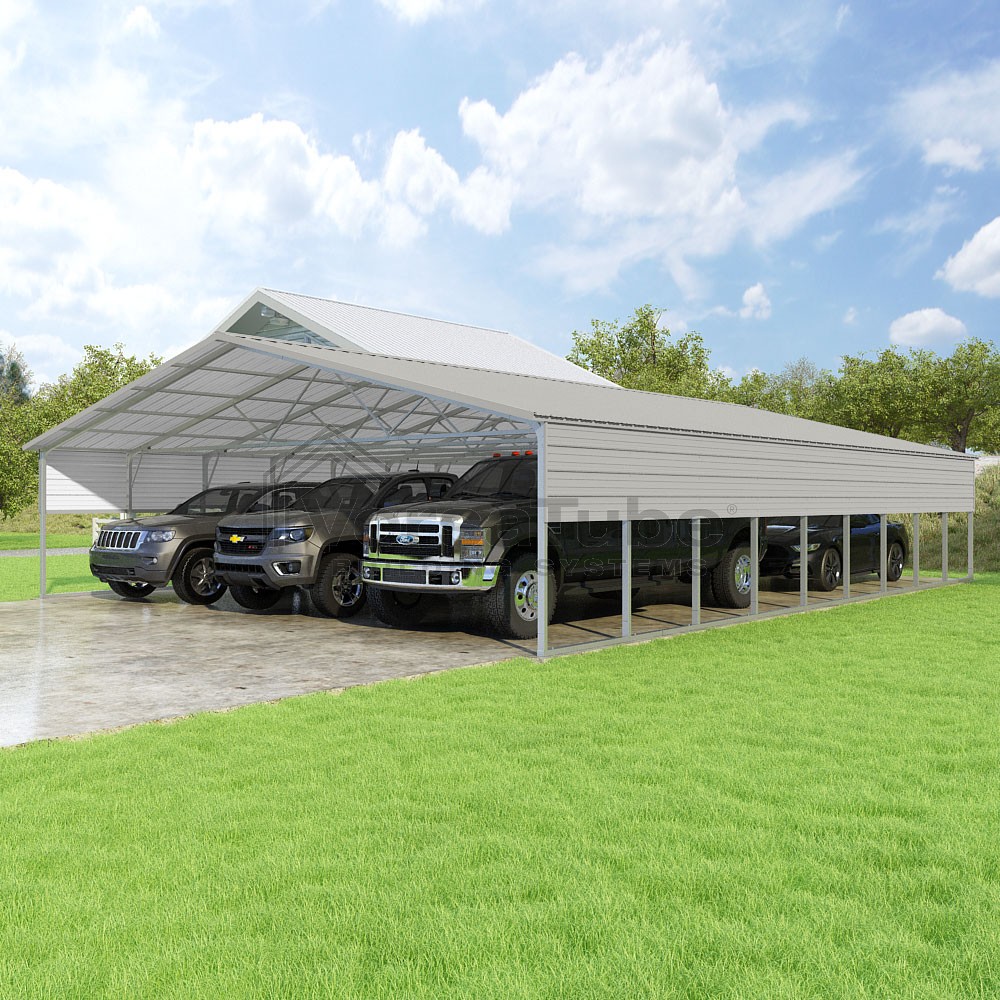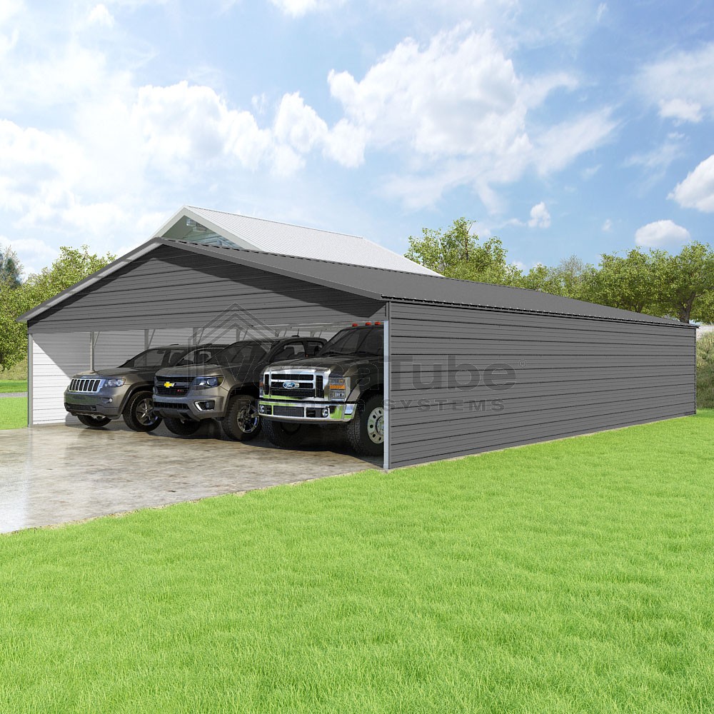 Pinnacle Series DIY carport kit features vertical sheet metal roof panels with ridge cap, gable and eave trim for an A-frame roof style and extended coverage on both ends.