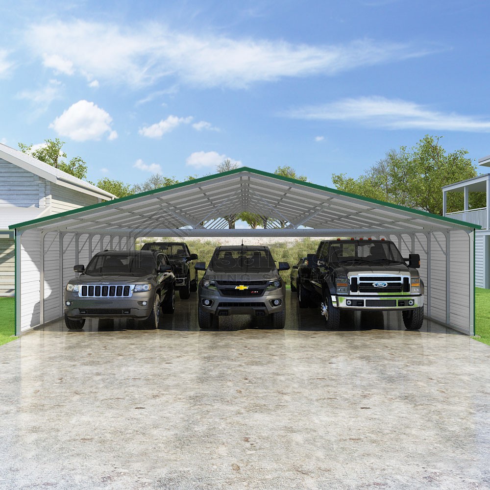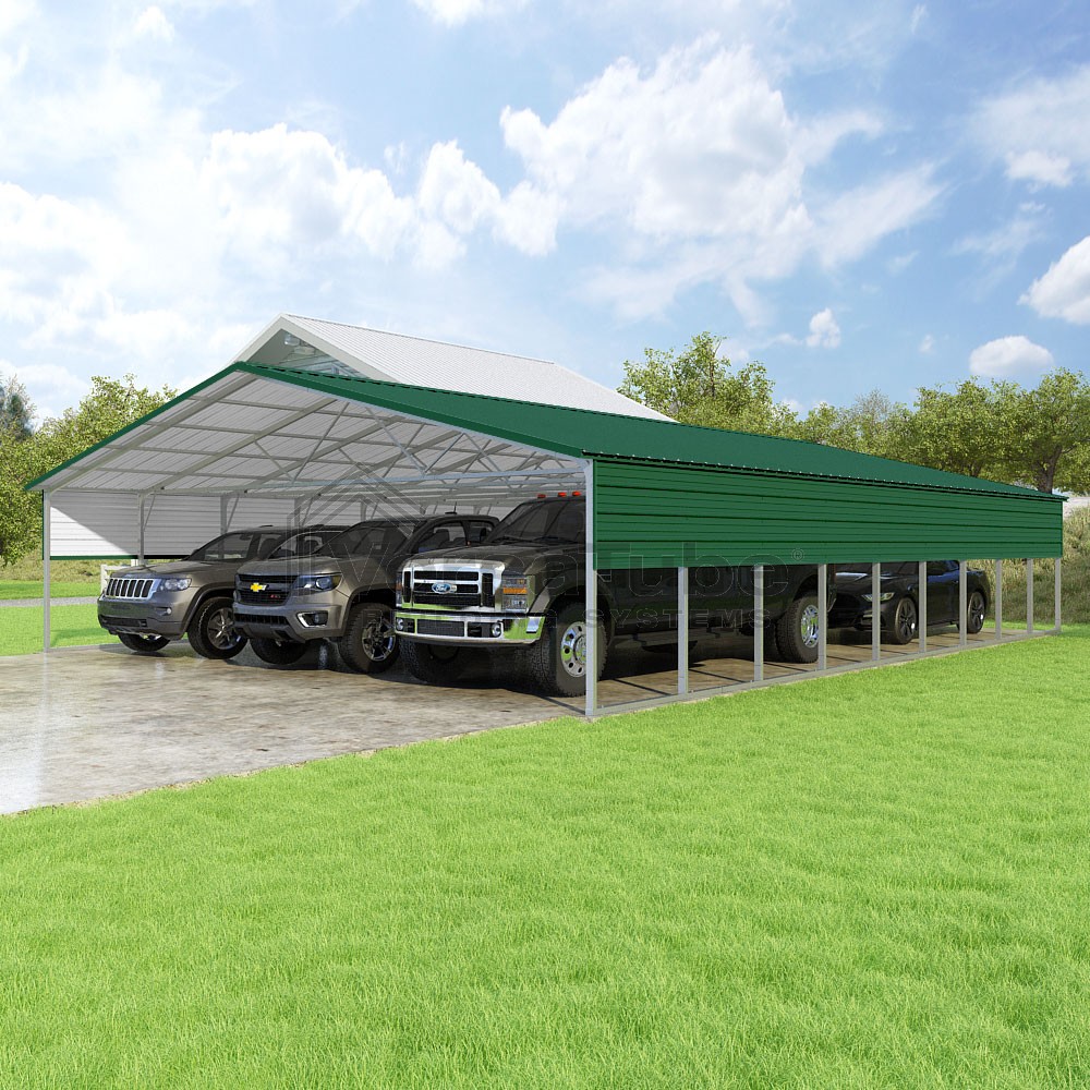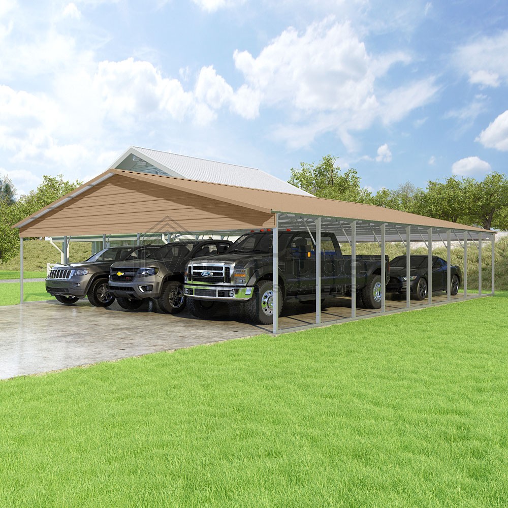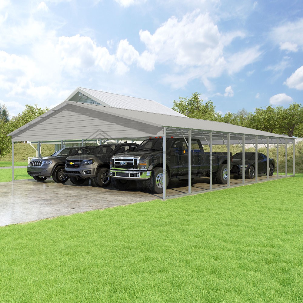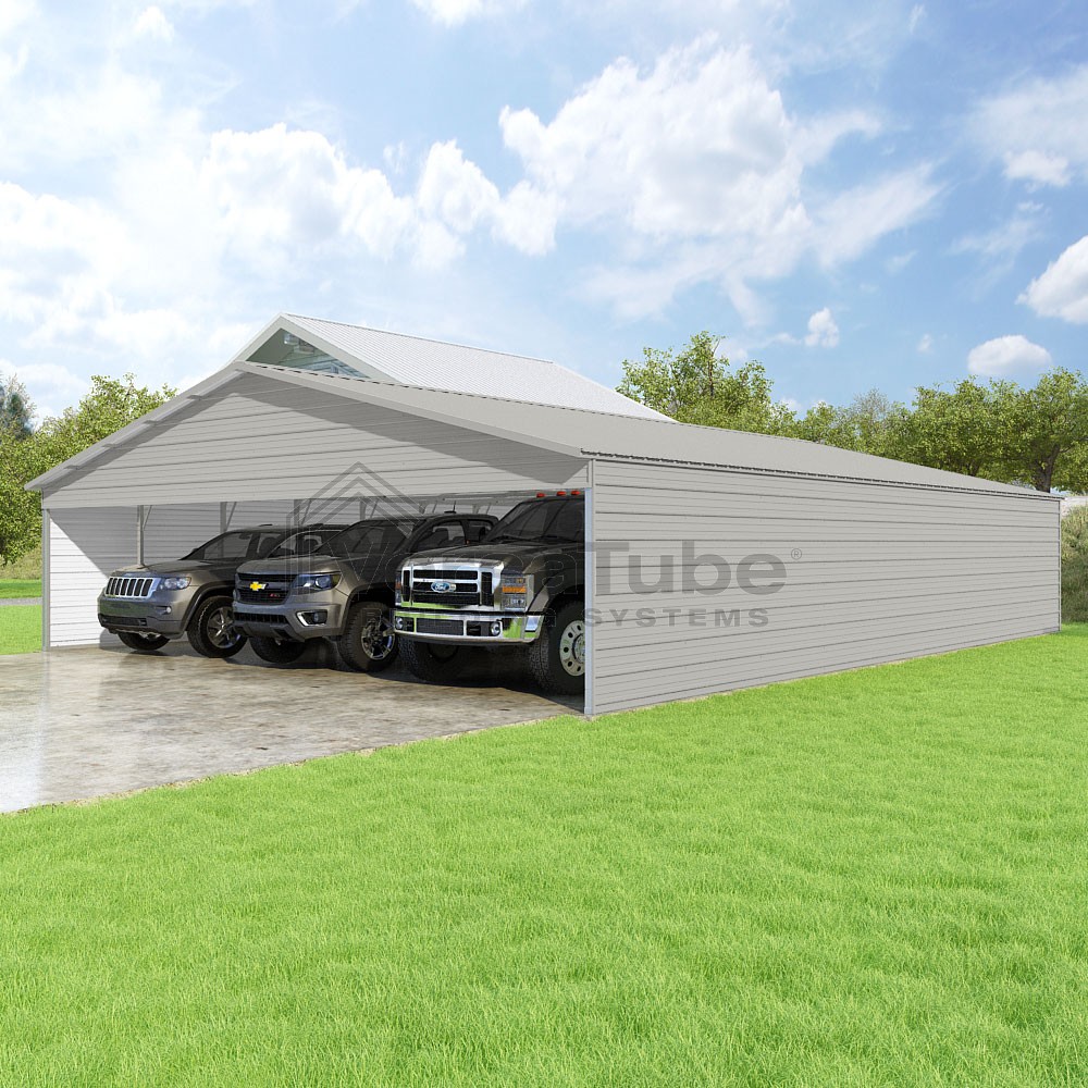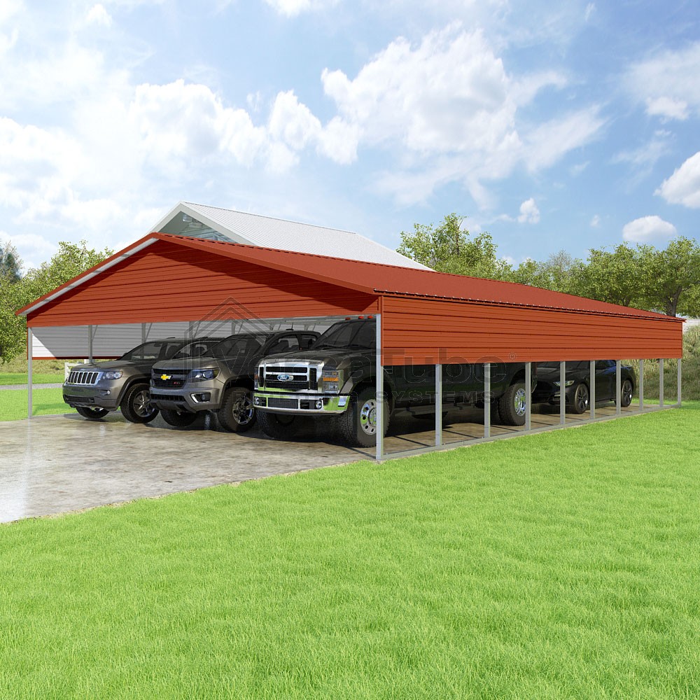 Pinnacle Series DIY carport kit features vertical sheet metal roof panels with ridge cap, gable and eave trim for an A-frame roof style and extended coverage on both ends.