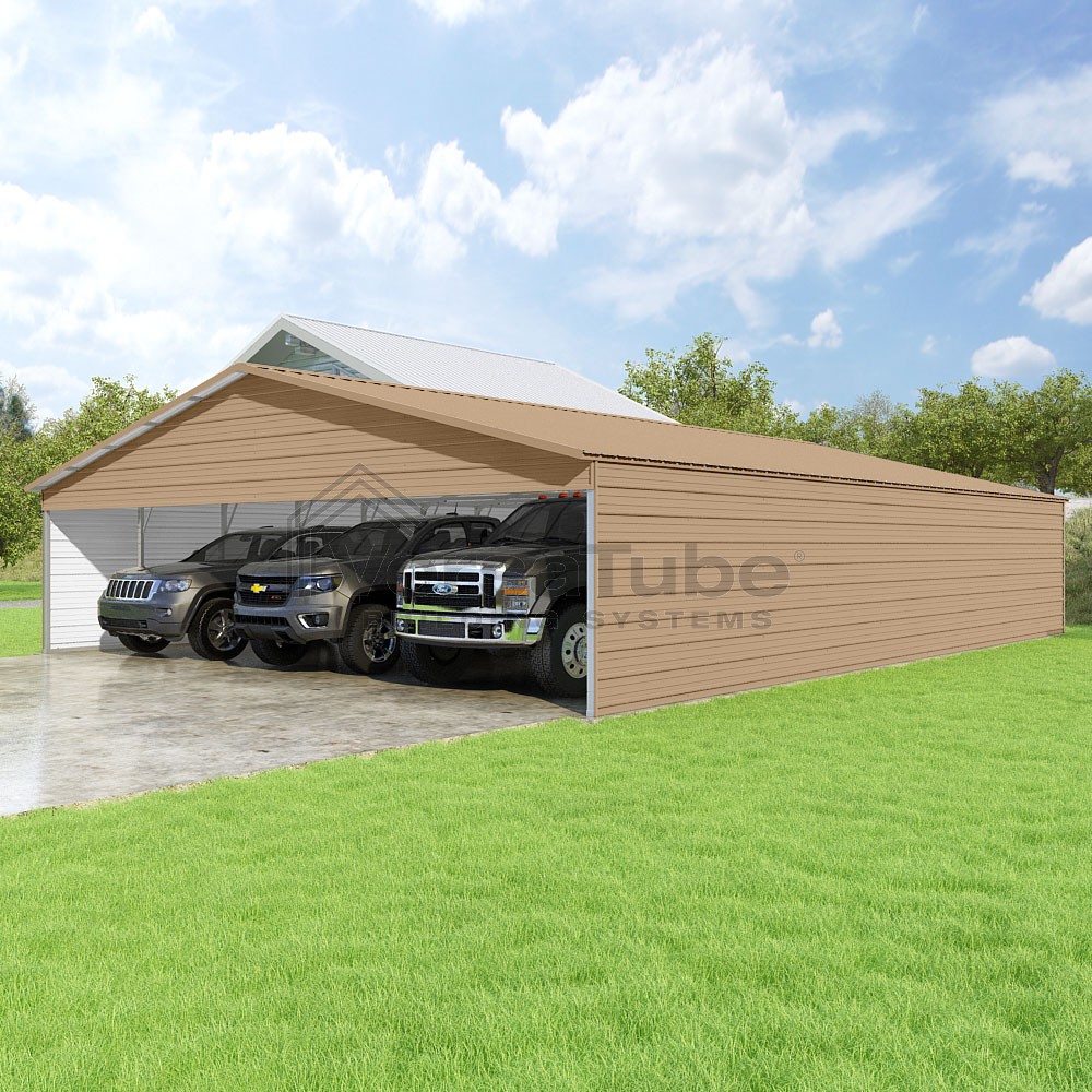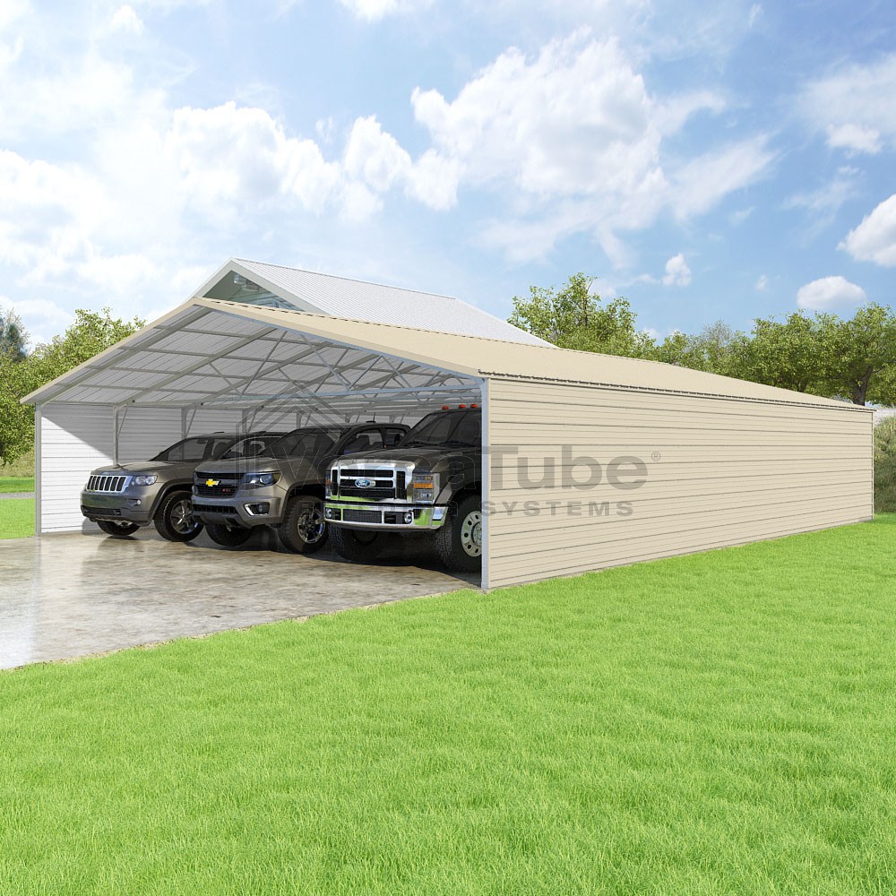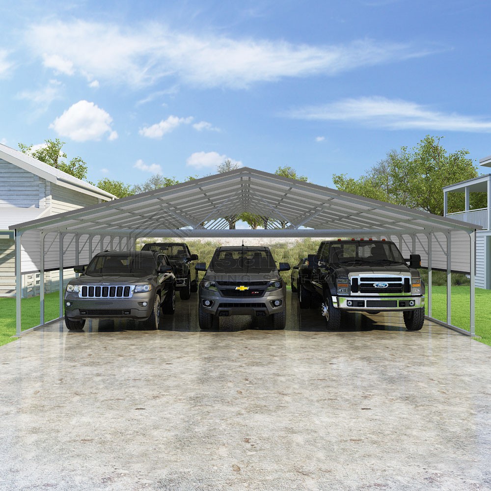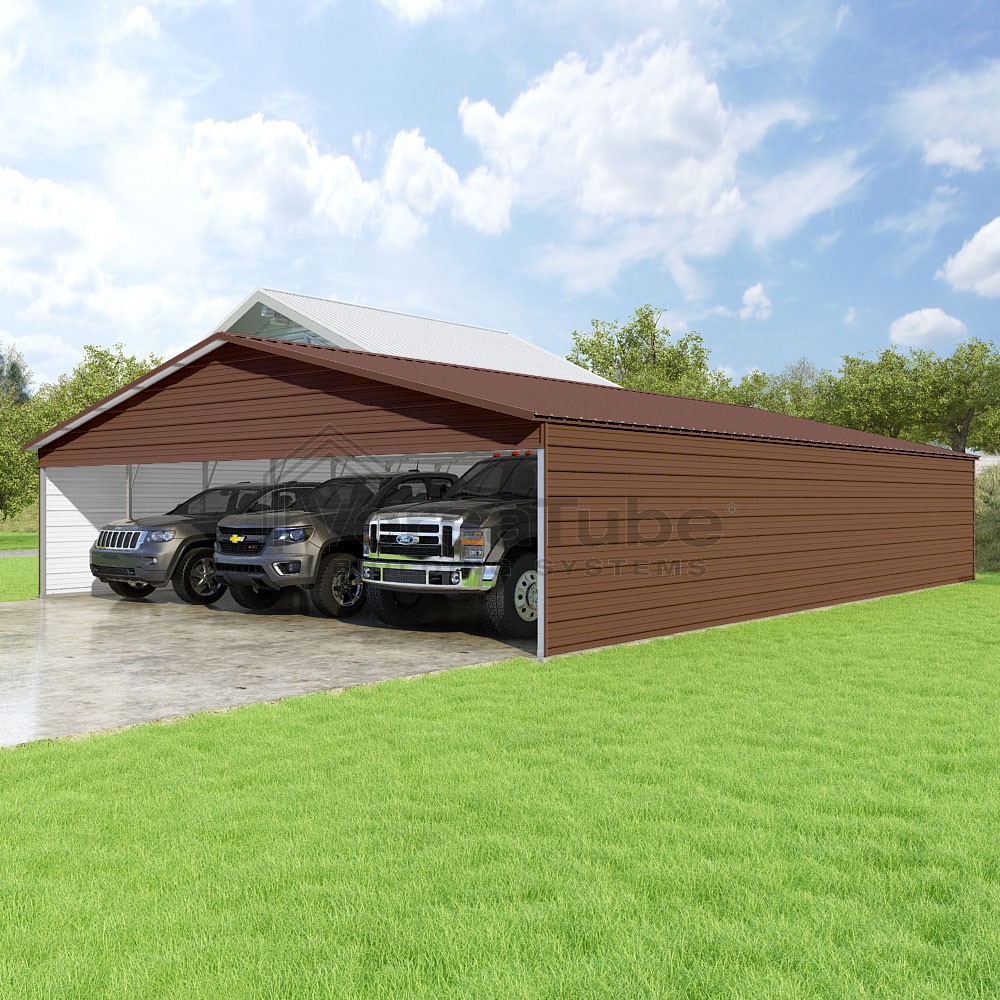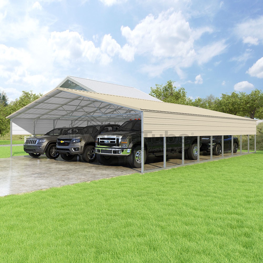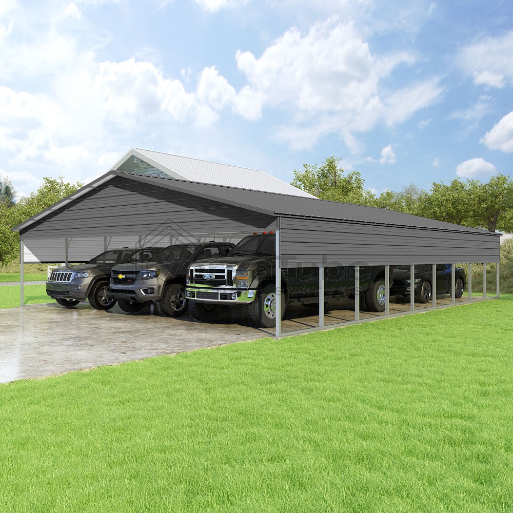 Pinnacle Series DIY carport kit features vertical sheet metal roof panels with ridge cap, gable and eave trim for an A-frame roof style and extended coverage on both ends.
